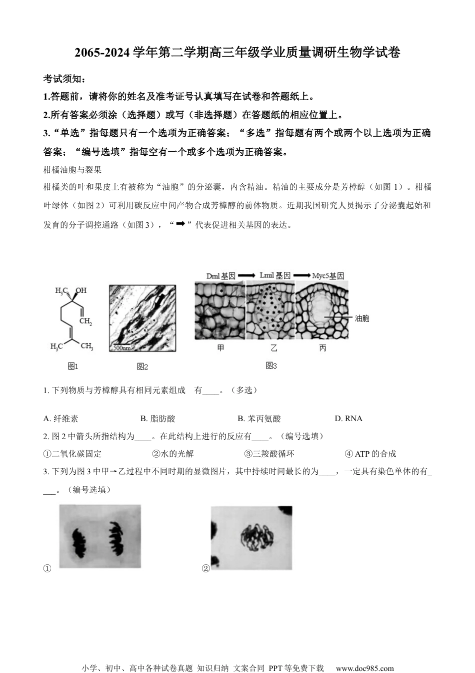 小学、初中、高中各种试卷真题知识归纳文案合同PPT等免费下载www.doc985.com2065-2024学年第二学期高三年级学业质量调研生物学试卷考试须知:1.答题前,请将你的姓名及准考证号认真填写在试卷和答题纸上。2.所有答案必须涂(选择题)或写(非选择题)在答题纸的相应位置上。3.“单选”指每题只有一个选项为正确答案;“多选”指每题有两个或两个以上选项为正确答案;“编号选填”指每空有一个或多个选项为正确答案。柑橘油胞与裂果柑橘类的叶和果皮上有被称为“油胞”的分泌囊,内含精油。精油的主要成分是芳樟醇(如图1)。柑橘叶绿体(如图2)可利用碳反应中间产物合成芳樟醇的前体物质。近期我国研究人员揭示了分泌囊起始和发育的分子调控通路(如图3),“”代表促进相关基因的表达。1.下列物质与芳樟醇具有相同元素组成的有____。(多选)A.纤维素B.脂肪酸B.苯丙氨酸D.RNA2.图2中箭头所指结构为____。在此结构上进行的反应有____。(编号选填)①二氧化碳固定②水的光解③三羧酸循环④ATP的合成3.下列为图3中甲→乙过程中不同时期的显微图片,其中持续时间最长的为____,一定具有染色单体的有____。(编号选填)①②小学、初中、高中各种试卷真题知识归纳文案合同PPT等免费下载www.doc985.com③④4.图3中乙→丙过程中可发生的事件有____。(编号选填)①细胞凋亡②细胞坏死③纤维素酶活性增强④纤维素酶活性减弱5.柑橘枝刺基部有油胞,而顶部没有,据图3分析,其可能原因是顶部细胞____。(多选)A.无Drnl基因B.无Lmil的mRNAB.无MyB5蛋白D.无法合成精油6.某品种柑橘在果实生长发育时果皮易裂开,研究人员对裂果率进行了统计,结果如图4所示。裂果高峰期柑橘果实不同部位相关植物激素的浓度如下表所示。组织赤霉素浓度(nmol/L)脱落酸浓度(ng/mL)甲139.20±0.57b75.96±3.12b乙170.17±6.43a80.21±1.06a注:每列数据小写字母表示有显著差异,P<0.05结合图4分析,表中植物激素浓度测定的日期最可能是____。(单选)A.7月18日B.7月20日B.8月17日D.10月16日小学、初中、高中各种试卷真题知识归纳文案合同PPT等免费下载www.doc985.com7.研究表明,木质素累积过多导致细胞脆性变大,POD酶可显著提高木质素的合成,其酶活性受到一定浓度脱落酸的抑制。结合上述资料和所学知识,判断表1中甲和乙各为柑橘果实的哪一部位,并说明其裂果的具体原因。草地贪夜蛾与防控草地贪夜蛾(FAW)原分布于美洲,自2019年入侵我国,对玉米等农作物造成严重危害。为了解某片面积为1平方公里的玉米田虫情,研究人员先后两次(间隔3天)对FAW展开了调查,两次调查得到的数据统计结果如图所示。注:1平方公里约为1500亩,每亩约种植玉米4000株8.此片玉米田属于____。(编号选填)①天然生态系统②人工生态系统③陆地生态系统④农田生态系统9.下列关于FAW的相关说法,错误的是____。(多选)A.第一次调查时FAW种群年龄结构为增长型B.此玉米田中FAW的种群数量呈“J”型增长B.入侵后FAW的个体数快速增多的现象称为生物放大D.在两次调查间隔期内,FAW种群遭受了性引诱剂的消杀10.下列关于此片玉米田的相关说法,正确的是____。(单选)A.不同区域的玉米被FAW幼虫破坏程度不同,体现了玉米种群的水平结构B.FAW的入侵一定会导致玉米向下一营养级能量传递效率下降B.若在第一次调查时绘制玉米田的数量金字塔,会呈现倒置现象D.若玉米田由于FAW的过度繁殖被废弃,则此区域可发生次生演替11.小青同学准备用如图装置对此片被FAW入侵的玉米田进行研究,他研究的课题最可能是____。(单选)小学、初中、高中各种试卷真题知识归纳文案合同PPT等免费下载www.doc985.comA.调查玉米田中FAW的生态位B.FAW入侵对玉米田碳循环的影响B.FAW入侵对土壤小动物丰富度的影响D.FAW入侵前后土质对生态瓶稳定性的影响12.某些玉米品系在叶片受损时,可合成一种FAW幼虫生长的蛋白酶抑制剂,从而保护玉米的叶片。蛋白酶抑制剂属于的信息类型为____。此片玉米田中玉米、FAW和杂食鸟之间的食物关系及其能量去向如图所示,图中字母表示该玉米田中流入不同去向的能量值,甲表示呼吸作用散失的能量,乙表示流向分解者的能量。13.杂食鸟与FA...