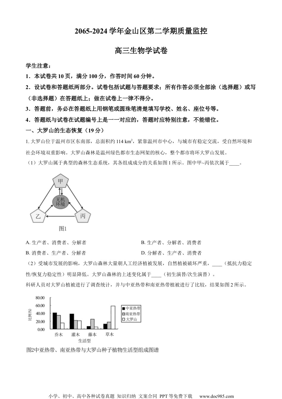 小学、初中、高中各种试卷真题知识归纳文案合同PPT等免费下载www.doc985.com2065-2024学年金山区第二学期质量监控高三生物学试卷学生注意:1.本试卷共10页,满分100分,作答时间60分钟。2.设试卷和答题纸两部分。试卷包括试题与答题要求;所有作答必须全部涂(选择题)或写(非选择题)在答题纸上;做在试卷上一律不得分。3.答题前,务必在答题纸上用钢笔或圆珠笔清楚填写学校、姓名、座位号等。4.答题纸与试卷在试题编号上是一一对应的,答题时应特别注意,不能错位。一、大罗山的生态恢复(19分)1.大罗山位于温州市区东南部,总面积约114km2,紧靠温州市中心,与城市有稳定交流,受自然环境和社会环境双重影响。大罗山森林是温州绿色都市生态网架的核心,整个都市将环大罗山发展。(1)大罗山属于典型的森林生态系统,其各组成成分的关系如图1所示。图中甲~丙依次属于____。A.生产者、消费者、分解者B.生产者、分解者、消费者B.消费者、生产者、分解者D.分解者、生产者、消费者(2)受城市发展的影响,大罗山森林大量朝人工经济植被发展,自然植被破坏严重,____(抵抗力稳定性/恢复力稳定性)明显降低。大罗山森林的上述变化属于____(初生演替/次生演替)。科研人员对大罗山植被进行了调查统计,并与中亚热带和南亚热带植被进行了比较,结果如图2所示。小学、初中、高中各种试卷真题知识归纳文案合同PPT等免费下载www.doc985.com(3)对大罗山植被调查主要采用的方法是____。A.样方法B.标志重捕法B.样线法D.显微计数法(4)按地理位置和水热条件来说,大罗山应属于中亚热带常绿阔叶林。根据图2分析说明,大罗山植被与中亚热带植被的差异有____。A.乔木比例明显偏低B.灌木植物比例明显偏低B.藤本植物比例明显偏低D.草本植物比例明显偏高科研人员还对大罗山的动物进行了调查统计,并与邻近的乌岩岭地区的动物进行了比较。其中两地区的两栖类动物组成如图3所示。两地区的鸟类和野生兽类组成比较结果与两栖类比较结果类似。(5)根据题干信息和图3分析,相对于乌岩岭,大罗山的生物多样性中明显较小的是____。A.基因多样性B.遗传多样性B.物种多样性D.生态系统多样性(6)大罗山中隐鳃鲵科、蝾螈科等两栖动物都已灭绝,而仅有蟾蜍科和蛙科还在繁衍。在大罗山中,这两科的两栖动物之间的关系是____。A.捕食B.共生B.种间竞争D.种内竞争科研人员依据区域生态恢复与建设模式,预测了大罗山森林生态恢复与重建后生态系统核心服务功能价值,如表所求。表大罗山森林生态恢复前后生态系统核心服务功能价值比较(单位:元·hm-2·a-1)核心服务功能理论服务价值生态恢复前*生态恢复后*服务价值实现率%服务价值实现率%光合固碳1594.17493.9430.981273.6579.89小学、初中、高中各种试卷真题知识归纳文案合同PPT等免费下载www.doc985.com释放氧气6631.682054.7730.985298.3279.89SO2净化42.5518.8944.3948.13113.11滞尘1374.961049.8676.362561.01186.26小计9643.363617.46—9181.11—注:*未扣除经果林维护费用(7)表1中光合固碳、释放氧气、净化环境等属于____。(编号选填)①直接价值②间接价值③潜在价值(8)根据表中的数据分析,要想实现生态恢复后核心服务功能价值实现率提升,让社会-经济-自然融于一体,可以采取下列中的哪些措施____。(编号选填)①科学规划生态功能区,包括生态景观区、生态产业区和生态人居区②根据当地潜在植被类型,选择营林树种,注意乔、灌木合理搭配③选择适宜常绿阔叶树种如红楠、青冈等替代人工经济植被如杨梅等④在土层较瘠薄、裸露基岩较多区域,选择耐贫瘠、速生的潜在树种⑤选择土壤、水源等适宜区域,根据自身需求规划建设苗木繁育基地【答案】(1)B(2)①.抵抗力稳定性②.次生演替(3)A(4)ABD(5)B(6)B(7)②(8)①②④⑤【解析】【分析】生态系统的稳定性1、概念:生态系统所具有的保持或恢复自身结构和功能相对稳定的能力;2、生态系统之所以能维持相对稳定,是由于生态系统具有自我调节能力。生态系统自我调节能力的。基础是负反馈。物种数目越多,营养结构越复杂,自我调节能力越大;3、生态系统的稳定性具有相对性。当受到大规...