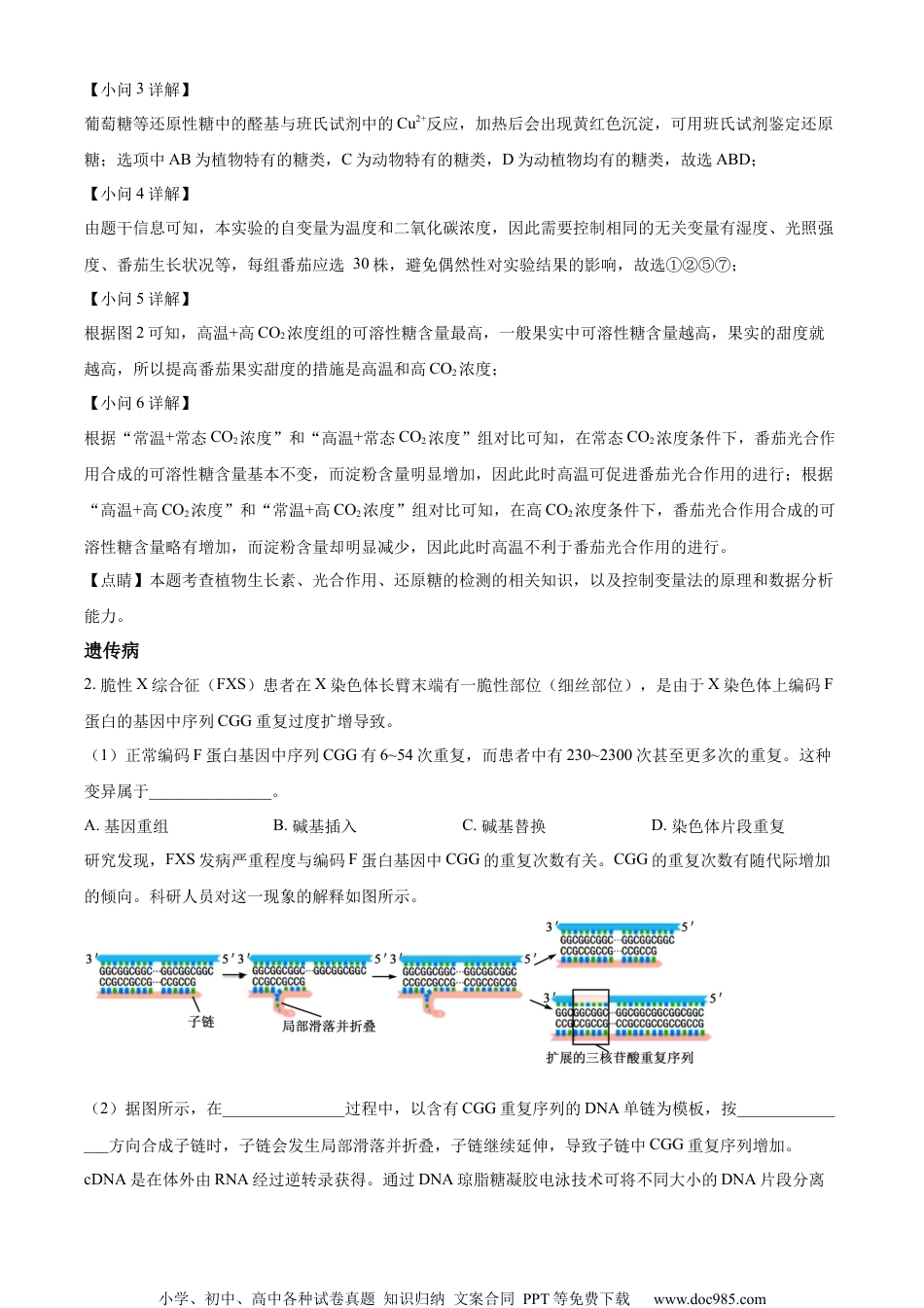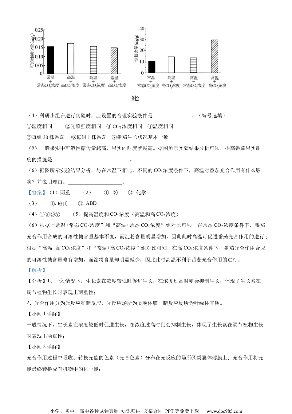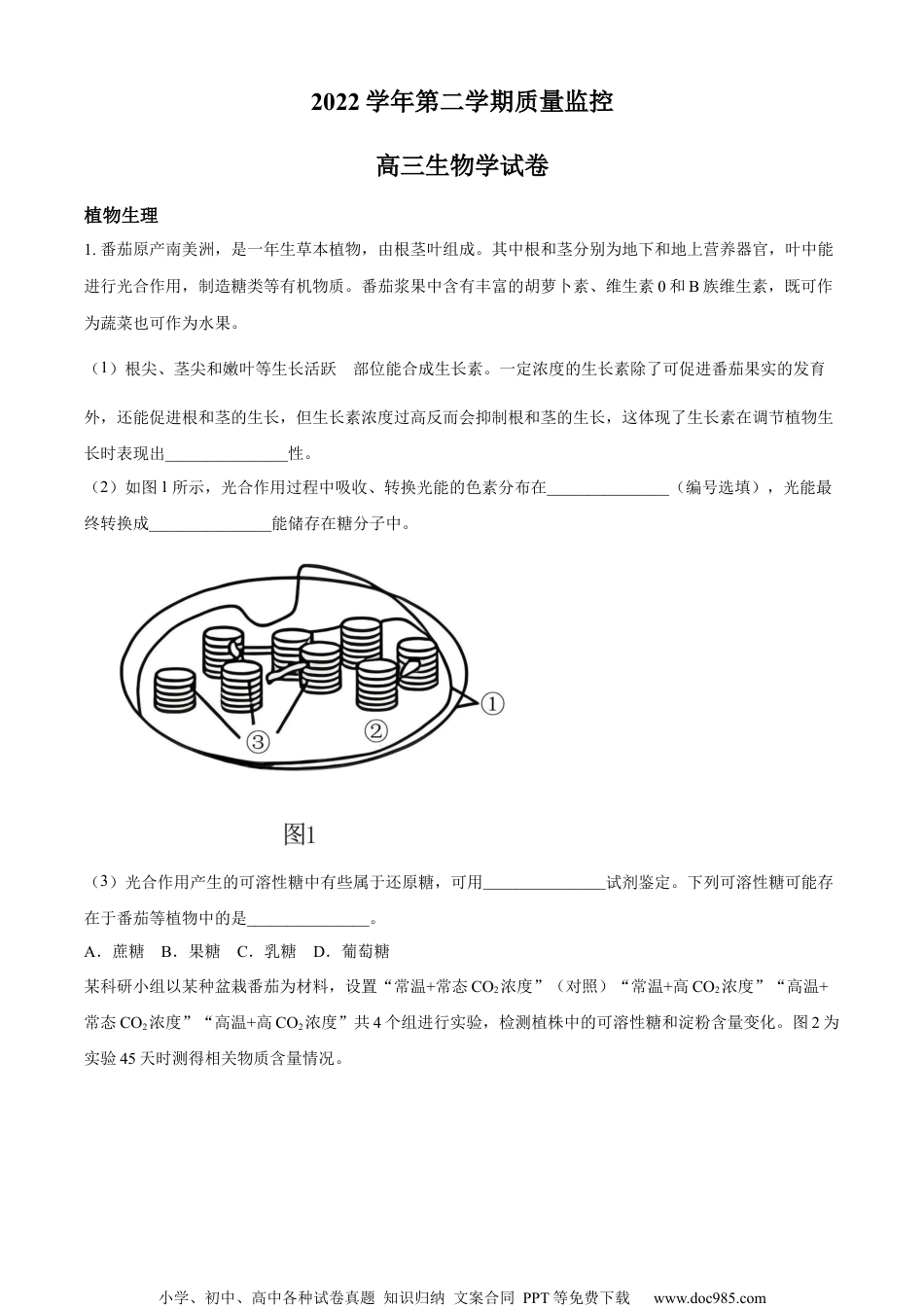 小学、初中、高中各种试卷真题知识归纳文案合同PPT等免费下载www.doc985.com2022学年第二学期质量监控高三生物学试卷植物生理1.番茄原产南美洲,是一年生草本植物,由根茎叶组成。其中根和茎分别为地下和地上营养器官,叶中能进行光合作用,制造糖类等有机物质。番茄浆果中含有丰富的胡萝卜素、维生素0和B族维生素,既可作为蔬菜也可作为水果。(1)根尖、茎尖和嫩叶等生长活跃的部位能合成生长素。一定浓度的生长素除了可促进番茄果实的发育外,还能促进根和茎的生长,但生长素浓度过高反而会抑制根和茎的生长,这体现了生长素在调节植物生长时表现出_______________性。(2)如图1所示,光合作用过程中吸收、转换光能的色素分布在_______________(编号选填),光能最终转换成_______________能储存在糖分子中。(3)光合作用产生的可溶性糖中有些属于还原糖,可用_______________试剂鉴定。下列可溶性糖可能存在于番茄等植物中的是_______________。A.蔗糖B.果糖C.乳糖D.葡萄糖某科研小组以某种盆栽番茄为材料,设置“常温+常态CO2浓度”(对照)“常温+高CO2浓度”“高温+常态CO2浓度”“高温+高CO2浓度”共4个组进行实验,检测植株中的可溶性糖和淀粉含量变化。图2为实验45天时测得相关物质含量情况。小学、初中、高中各种试卷真题知识归纳文案合同PPT等免费下载www.doc985.com(4)科研小组在进行实验时,应设置的合理实验条件是_______________。(编号选填)①湿度相同②光照强度相同③CO2浓度相同④温度相同⑤每组30株番茄⑥每组1株番茄⑦番茄生长状况基本一致(5)一般果实中可溶性糖含量越高,果实的甜度就越高。据图所示实验结果分析可知,提高番茄果实甜度的措施是______________________________。(6)据图所示实验结果分析,与在常温下相比,不同的CO2浓度条件下,高温对番茄光合作用有什么影响?并说明理由。_____________________。【答案】(1)两重(2)①.③②.化学(3)①.班氏②.ABD(4)①②⑤⑦(5)提高温度和CO2浓度(高温和高CO2浓度)(6)根据“常温+常态CO2浓度”和“高温+常态CO2浓度”组对比可知,在常态CO2浓度条件下,番茄光合作用合成的可溶性糖含量基本不变,而淀粉含量明显增加,因此此时高温可促进番茄光合作用的进行;根据“高温+高CO2浓度”和“常温+高CO2浓度”组对比可知,在高CO2浓度条件下,番茄光合作用合成的可溶性糖含量略有增加,而淀粉含量却明显减少,因此此时高温不利于番茄光合作用的进行。【解析】【分析】1、一般情况下,生长素在浓度较低时促进生长,在浓度过高时则会抑制生长,体现了生长素在调节植物生长时表现出两重性;2、光合作用分为光反应和暗反应,光反应场所为类囊体膜,暗反应场所为叶绿体基质。【小问1详解】一般情况下,生长素在浓度较低时促进生长,在浓度过高时则会抑制生长,体现了生长素在调节植物生长时表现出两重性;【小问2详解】光合作用过程中吸收、转换光能的色素(光合色素)分布在光反应的场所③类囊体薄膜上;光合作用将光能最终转换成有机物中的化学能;小学、初中、高中各种试卷真题知识归纳文案合同PPT等免费下载www.doc985.com【小问3详解】葡萄糖等还原性糖中的醛基与班氏试剂中的Cu2+反应,加热后会出现黄红色沉淀,可用班氏试剂鉴定还原糖;选项中AB为植物特有的糖类,C为动物特有的糖类,D为动植物均有的糖类,故选ABD;【小问4详解】由题干信息可知,本实验的自变量为温度和二氧化碳浓度,因此需要控制相同的无关变量有湿度、光照强度、番茄生长状况等,每组番茄应选30株,避免偶然性对实验结果的影响,故选①②⑤⑦;【小问5详解】根据图2可知,高温+高CO2浓度组的可溶性糖含量最高,一般果实中可溶性糖含量越高,果实的甜度就越高,所以提高番茄果实甜度的措施是高温和高CO2浓度;【小问6详解】根据“常温+常态CO2浓度”和“高温+常态CO2浓度”组对比可知,在常态CO2浓度条件下,番茄光合作用合成的可溶性糖含量基本不变,而淀粉含量明显增加,因此此时高温可促进番茄光合作用的进行;根据“高温+高CO2浓度”和“常温+高CO2浓度”组对比可知,在高CO2浓度条件下,番茄光合作用合...