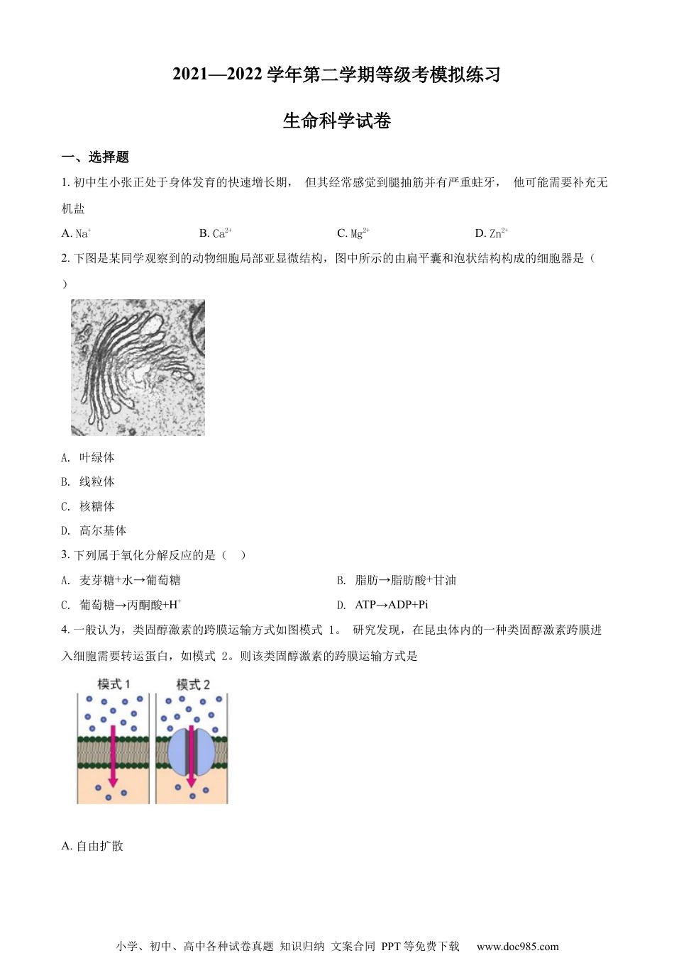 小学、初中、高中各种试卷真题知识归纳文案合同PPT等免费下载www.doc985.com2021—2022学年第二学期等级考模拟练习生命科学试卷一、选择题1.初中生小张正处于身体发育的快速增长期,但其经常感觉到腿抽筋并有严重蛀牙,他可能需要补充无机盐A.Na+B.Ca2+C.Mg2+D.Zn2+2.下图是某同学观察到的动物细胞局部亚显微结构,图中所示的由扁平囊和泡状结构构成的细胞器是()A.叶绿体B.线粒体C.核糖体D.高尔基体3.下列属于氧化分解反应的是()A.麦芽糖+水→葡萄糖B.脂肪→脂肪酸+甘油C.葡萄糖→丙酮酸+H+D.ATP→ADP+Pi4.一般认为,类固醇激素的跨膜运输方式如图模式1。研究发现,在昆虫体内的一种类固醇激素跨膜进入细胞需要转运蛋白,如模式2。则该类固醇激素的跨膜运输方式是A.自由扩散小学、初中、高中各种试卷真题知识归纳文案合同PPT等免费下载www.doc985.comB.协助运输C.主动运输D.胞吞胞吐5.研究小组对长江凤鲚和珠江凤鲚两个种群的线粒体cytb基因片段序列进行分析,结果显示,序列有44个变异位点,总变异率为11.5%,这些差异属于()A.生态系统多样性B.物种多样性C.遗传多样性D.生境多样性6.如图表示胃蛋白酶活性与温度、pH之间的关系,以下叙述正确的是A.胃蛋白酶最适pH是3B.胃蛋白酶活性受温度和pH的影响C.据图无法推断胃蛋白酶的最适温度D.随着pH的升高,酶的活性逐渐降低7.某酵母菌菌株基因突变,其线粒体失去了原有的功能,那么该菌株()A.不能产生CO2B.不能利用氧气C.不能产生能量D.不能分解葡萄糖8.下图中甲物质为ADP,其转变为乙物质时需要提供A.磷酸、酶、腺苷和能量B.能量、腺苷和酶C.磷酸、能量和酶D.磷酸、能量9.在“观察牛蛙的脊髓反射现象”实验中,对健康牛蛙的脚趾皮肤进行环割剥除的操作是为了研究()A.脊髓在反射活动中的作用B.感受器在反射活动中的作用C.效应器在反射活动中的作用小学、初中、高中各种试卷真题知识归纳文案合同PPT等免费下载www.doc985.comD.传入神经在反射活动中的作用10.图为新冠病毒模式图。图中的四类蛋白质中,最可能最先激活人体免疫系统的是()A.膜糖蛋白B.突刺蛋白C.核衣壳蛋白D.包膜蛋白11.人体内环境中不可能出现的物质是()A.神经递质B.血红蛋白C.胰岛素D.抗体12.用不同浓度的生长素类似物吲哚丁酸(IBA)处理蔷薇插条2小时后扦插,一段时间后统计生根率,得到图所示的结果,下列说法正确的是A.IBA可以提高蔷薇插条的生根率B.IBA对蔷薇根的影响具有两重性C.IBA可以促进蔷薇插条根的伸长D.用乙烯代替IBA可得到类似的结果13.高脂血症家兔服用降脂药物“辛伐他汀”后,血浆总胆固醇的含量下降。下列“辛伐他汀”降脂的可能机制中错误的是()A.抑制胆固醇合成B.降低低密度脂蛋白的含量小学、初中、高中各种试卷真题知识归纳文案合同PPT等免费下载www.doc985.comC.升高高密度脂蛋白的含量D.抑制胆固醇加工成胆汁酸14.大蒜常用分开后的蒜瓣插入泥土进行繁殖,这是()A.营养生殖B.有性生殖C.出芽生殖D.分裂生殖15.食物过咸可引发人体的自动调节,图为部分调节过程,下列叙述正确的是A.结构X为大脑皮层B.激素Y为抗利尿激素C.结构X分泌活动减弱D.激素Y促进水的排出16.下列四幅生物体中处于不同分裂时期的细胞示意图中,不存在同源染色体的是A.B.C.D.17.为了解某食品样液中的营养成分,对其做出三种规范的鉴定操作,得到相应现象如表。由此判断该食品样液中至少含有()鉴定标本鉴定用试剂现象123双缩脲试剂苏丹Ⅲ染液班氏试剂紫色橘红色颜色不变A.还原性糖和脂肪B.蛋白质和还原性糖C.还原性糖、蛋白质、脂肪D.蛋白质和脂肪18.导致遗传物质变化的原因有很多,图中字母代表不同基因,其中变异类型①和②依次是()小学、初中、高中各种试卷真题知识归纳文案合同PPT等免费下载www.doc985.comA.突变和倒位B.重组和倒位C.重组和易位D.易位和倒位19.某地有一个大型的石灰厂,其白色的粉尘使周围的植物都变成了灰白色。该厂长期生产,其周围环境中不同颜色的蛾类数量变化如图,下列说法正确的是()A.石灰粉尘促进褐色蛾类进化了B.石灰粉尘导致灰色蛾类的变异C.石灰粉尘让蛾类发生定向变异D.石灰粉尘对蛾类的性状进行了选择20.人类红绿色盲(B/b)...