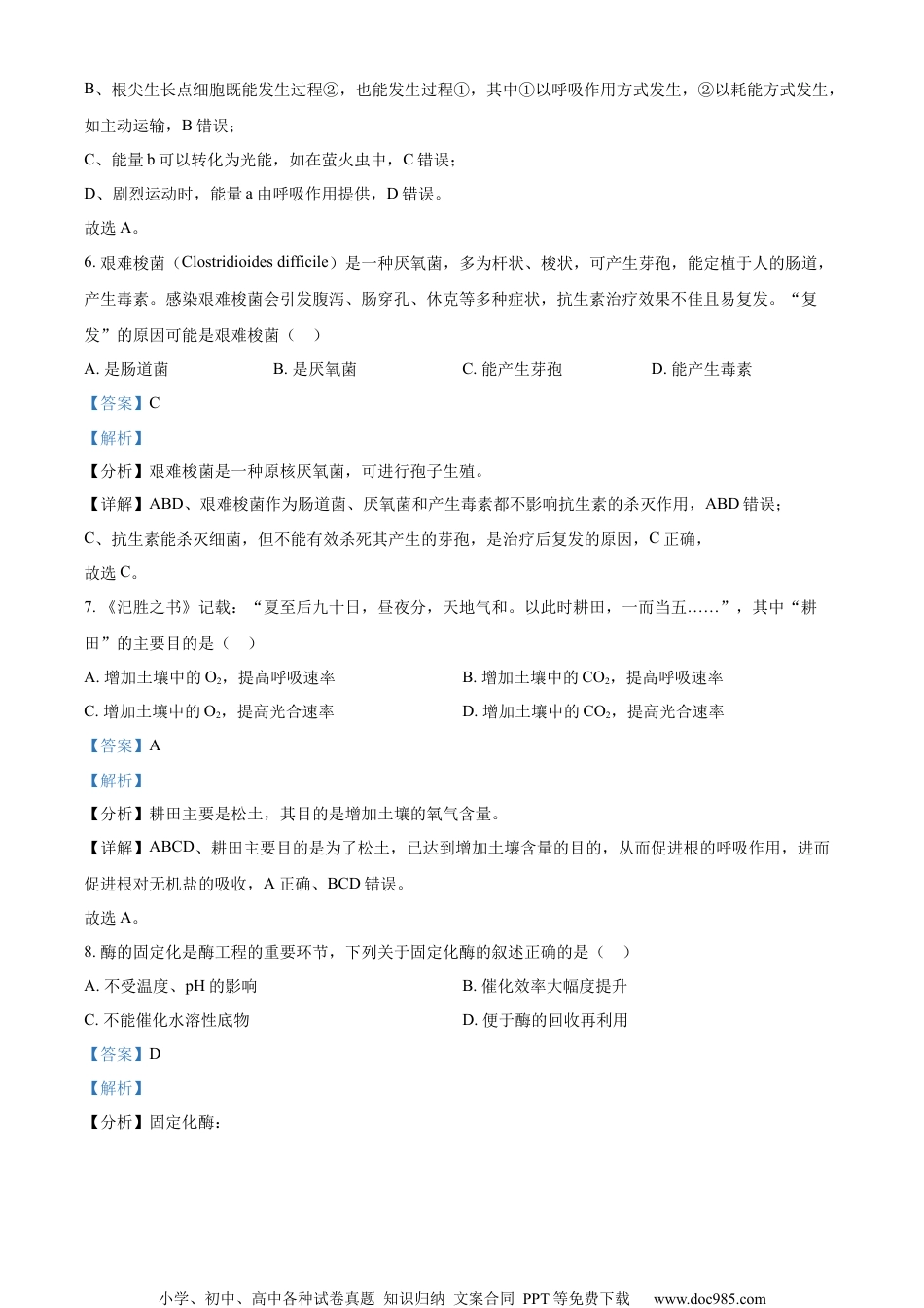 小学、初中、高中各种试卷真题知识归纳文案合同PPT等免费下载www.doc985.com2021学年第二学期生命科学学科适应性练习一、选择题1.近期,科学家解析了两种痒觉受体的结构,MRGPRX2可与某些带正电的化合物结合,而MRGPRX4可与某些带负电的化合物结合,引起这种差异的原因不可能是这两种受体的()A.氨基酸的排序不同B.肽链的空间结构不同C.氨基酸的数目不同D.肽键的空间结构不同【答案】D【解析】【分析】两种受体的化学本质为蛋白质。蛋白质多样性的原因有四个方面:一是在生物体中组成蛋白质的氨基酸种类不同;二是氨基酸的数目成百上千;三是氨基酸形成肽链时,不同种类的氨基酸排列顺序千变万化;四是多肽链的盘曲、折叠方式及其形成的空间结构千差万别。【详解】A、氨基酸排列顺序不同是蛋白质分子多样性的原因之一,A正确;B、组成蛋白质的多肽链的空间结构不同是蛋白质分子多样性的原因之一,B正确;C、组成蛋白质的氨基酸的数目不同是蛋白质分子多样性的原因,C正确;D、组成肽链的氨基酸之间都是通过肽键相连,肽键的结构相同,D错误。故选D。2.用显微测微尺测量某细胞长度时,下列目镜和物镜的组合中,视野中该细胞所占目镜测微尺的小格数最多的是()A.目镜10×,物镜10×B.目镜10×,物镜40×C.目镜16×,物镜10×D.目镜16×,物镜40×【答案】D【解析】【分析】显微镜的放大倍数等于物镜倍数×目镜倍数。【详解】ABCD、要求视野中该细胞所占目镜测微尺的小格数最多,即放大倍数最大,观察四个选项,D放大倍数最大,D正确,ABC错误。故选D。3.图为人体肝脏组织的局部放大示意图,①~④表示不同的体液,则肝细胞生活的内环境为()小学、初中、高中各种试卷真题知识归纳文案合同PPT等免费下载www.doc985.comA.①和②B.②C.2和③D.④【答案】B【解析】【分析】分析图示,①是细胞内液,②是组织液,③是血浆,④是淋巴液,据此分析作答。【详解】肝细胞属于组织细胞,组织细胞生活的具体内环境是组织液,B符合题意。故选B。4.某同学用下列形式表示两种物质间的关系,其中与其他三项不一致的是()A.葡萄糖>>>肌糖原B.胆固醇>>>脂肪C.葡萄糖>>>肝糖原D.核苷酸>>>核酸【答案】B【解析】【分析】由题意可知,该同学表示的为单体与大分子物质的关系。【详解】A、葡萄糖是肌糖原的单体,A正确;B、胆固醇不是脂肪的单体,B错误;C、葡萄糖是肝糖原的单体,C正确;D、核苷酸是核酸的单体,D正确。故选B。5.图表示ATP合成和分解的过程,下列相关叙述正确的是()A.光合作用中,既能发生过程①,也能发生过程②B.根尖生长点细胞只能发生过程②,不能发生过程①C.能量a可能来自光能,但能量b不可能转化为光能D.剧烈运动时,没有能量a的来源,只有能量b的利用【答案】A【解析】【分析】图示为ATP与ADP的转化过程,①为ATP合成,②为ATP水解。【详解】A、光合作用中,既能发生过程①,也能发生过程②,其中①在类囊体上发生,②在叶绿体基质中发生,A正确;小学、初中、高中各种试卷真题知识归纳文案合同PPT等免费下载www.doc985.comB、根尖生长点细胞既能发生过程②,也能发生过程①,其中①以呼吸作用方式发生,②以耗能方式发生,如主动运输,B错误;C、能量b可以转化为光能,如在萤火虫中,C错误;D、剧烈运动时,能量a由呼吸作用提供,D错误。故选A。6.艰难梭菌(Clostridioidesdifficile)是一种厌氧菌,多为杆状、梭状,可产生芽孢,能定植于人的肠道,产生毒素。感染艰难梭菌会引发腹泻、肠穿孔、休克等多种症状,抗生素治疗效果不佳且易复发。“复发”的原因可能是艰难梭菌()A.是肠道菌B.是厌氧菌C.能产生芽孢D.能产生毒素【答案】C【解析】【分析】艰难梭菌是一种原核厌氧菌,可进行孢子生殖。【详解】ABD、艰难梭菌作为肠道菌、厌氧菌和产生毒素都不影响抗生素的杀灭作用,ABD错误;C、抗生素能杀灭细菌,但不能有效杀死其产生的芽孢,是治疗后复发的原因,C正确,故选C。7.《汜胜之书》记载:“夏至后九十日,昼夜分,天地气和。以此时耕田,一而当五……”,其中“耕田”的主要目的是()A.增加土壤中的O2,提高呼吸速率B.增加土壤中的CO2,提高呼吸速率C.增加土壤中的...