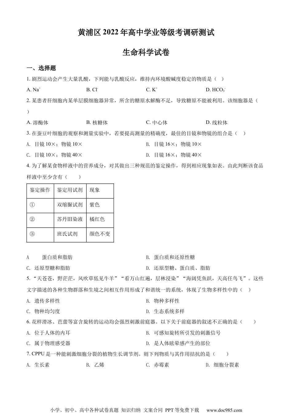小学、初中、高中各种试卷真题知识归纳文案合同PPT等免费下载www.doc985.com黄浦区2022年高中学业等级考调研测试生命科学试卷一、选择题1.剧烈运动会产生大量乳酸,下列能与乳酸反应,维持内环境酸碱度稳定的物质是()A.Na+B.Cl-C.K+D.HCO3-2.某患者肝细胞内某单层膜细胞器异常,所含的糖原水解酶不足,导致糖原不能被利用。该细胞器是()A.溶酶体B.核糖体C.中心体D.线粒体3.在蚕豆叶细胞的观察和测量实验中,若要提高测量的精确度,最佳的目镜和物镜的组合是()A.目镜10×;物镜10×B.目镜16×;物镜10×C.目镜10×;物镜40×D.目镜16×;物镜40×4.为了解某食物样液中的营养成分,对其做出三种规范的鉴定操作,得到相应现象如表。由此判断该食品样液中至少含有()鉴定操作鉴定用试剂现象①双缩脲试剂紫色②苏丹Ⅲ染液橘红色③班氏试剂颜色不变A.蛋白质和脂肪B.蛋白质和还原性糖C.还原型糖和脂肪D.还原型糖、蛋白质、脂肪5.“天苍苍,野茫茫,风吹草低见牛羊”“看万山红遍,层林浸染”“海阔凭鱼跃,天高任鸟飞”。这些文字描述的各种生物群落和生境之间相互作用形成了和谐统一的系统,体现了生物多样性中的()A.遗传多样性B.物种多样性C.物种均匀度D.生态系统多样6.花样滑冰、芭蕾等富含旋转的运动均会强烈刺激前庭器。以下关于前庭器的叙述不正确的是()A.位于人体的内耳B.可感知旋转所引发的刺激信号C.属于物理感受器D.是人体眩晕感产生的部位7.CPPU是一种能刺激细胞分裂的植物生长调节剂。则下列物质与其作用拮抗的是()A.生长素B.乙烯C.赤霉素D.细胞分裂素小学、初中、高中各种试卷真题知识归纳文案合同PPT等免费下载www.doc985.com8.某生物体细胞有20条染色体,在其细胞周期中,仅有20个DNA分子的时期是()A.G1期B.S期结束C.G2期D.M期开始9.当蓝细菌在高盐环境胁迫下,细胞开始快速合成并积累蔗糖,其意义是()A.降低细胞内的渗透压B.防止蓝细菌细胞失水C.降低细胞外的盐浓度D.促进蔗糖向细胞外转运10.下图表示人体内某种免疫失调病的致病机理,据图判断下列相关叙述正确的是A.a表示效应T细胞B.b不能特异性识别抗原C.红细胞膜上无抗原D.c化学本质是多糖11.下图是有关蛋白质分子的简要概念图,对图示分析正确的是()A.a肯定含有P元素B.①过程有水生成C.多肽中b的数目等于c的数目D.d表示氨基酸种类的多样性12.长期紧张焦虑易导致皮质醇(激素)含量升高,该调节过程主要依赖于下丘脑-垂体-靶腺(肾上腺皮质细胞)路径。下列人体调节的主要过程与其相似的是()A.大量饮酒导致高脂血症B.感染病毒导致体温升高C.进餐导致血糖浓度升高D.钠盐摄入过多导致血压上升13.CRISPR-Cas9基因编辑技术中,可通过人工设计的向导RNA识别目标DNA序列,并引导Cas9蛋白进行DNA双链切割(如图),进而达成对基因组DNA进行修饰的目的。则对图中虚线方框内的结构示意正确的是()小学、初中、高中各种试卷真题知识归纳文案合同PPT等免费下载www.doc985.comA.B.C.D.14.体育课时,小萌从温暖的教室来到温度接近冰点的操场,此时机体不会上升的是()A.产热量B.散热量C.肾上腺素分泌量D.皮肤血流量15.下图显示某生物的一条正常染色体及相关基因分布,则下列选项中不属于染色体变异引起的是()A.B.C.D.16.北欧鲫鱼在寒冷条件下,通过向体外排出酒精来延缓周围水体结冰,其细胞呼吸过程如图所示。下列相关叙述正确的是()小学、初中、高中各种试卷真题知识归纳文案合同PPT等免费下载www.doc985.comA.过程①能产生CO2B.过程①②均能生成ATPC.过程③发生在线粒体D.图中葡萄糖能彻底氧化17.在减数第一次分裂过程中,下列由纺锤丝牵引染色体分离前的状态模式图,正确的是()A.B.C.D.18.原产某地的某种一年生植物a,分别引种到低纬度和高纬度地区种植,很多年以后移植到原产地,开花时期如图所示。下列表述正确()A.b和c之间容易形成生殖隔离B.a和b之间已经不能进行基因交流C.迁回到原产地之后,a、b、c已经是三个物种D.a植物引种到不同纬度地区,产生了适应当地环境变异19.小鼠的毛色由复等位棊因A(黄色)、a1(灰色)、a2(黑色)控制。已知该复等位基因位于常染色体上,且A对a1、a2为显性,a...