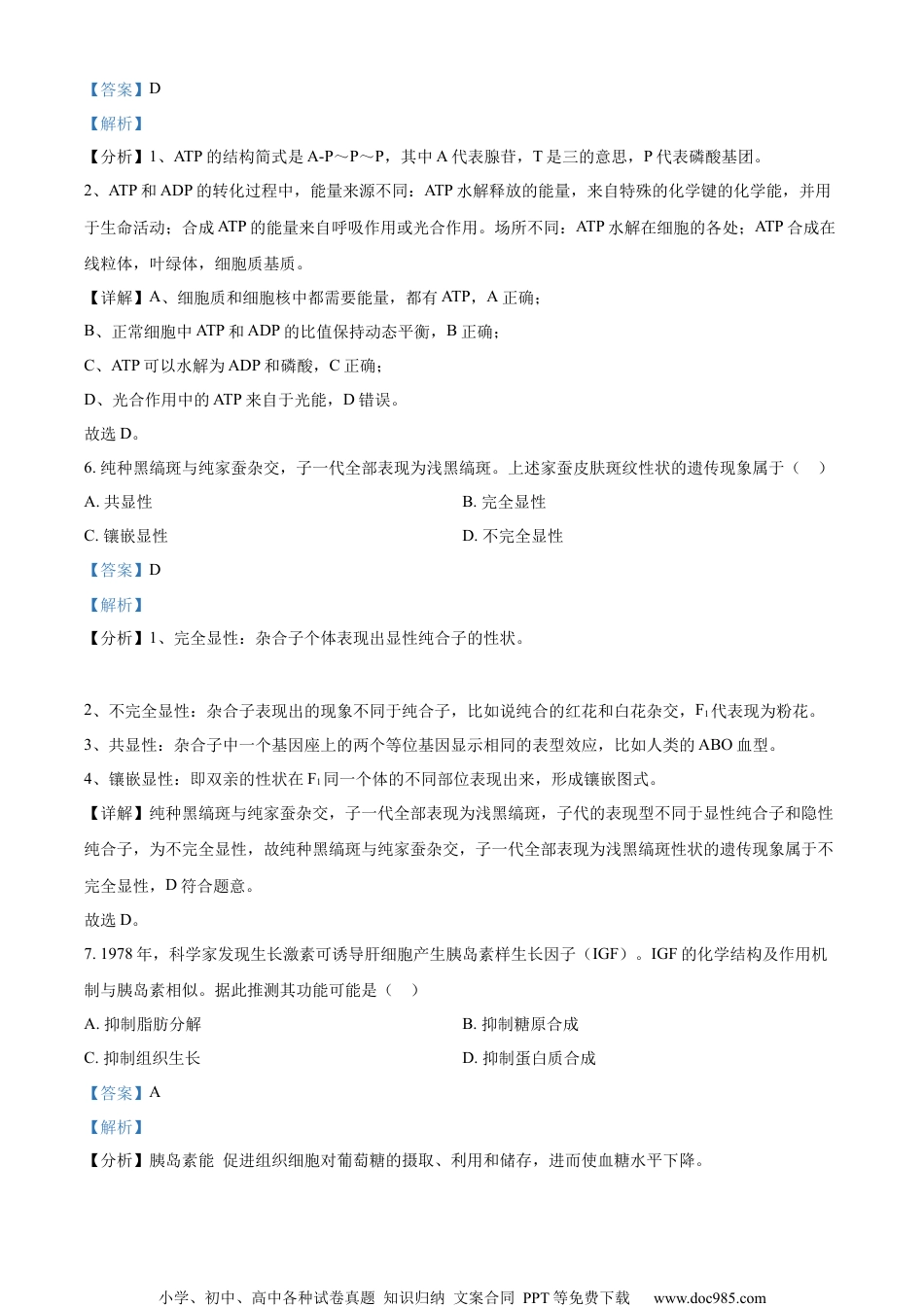 小学、初中、高中各种试卷真题知识归纳文案合同PPT等免费下载www.doc985.com虹口区2021学年第二学期质量调研考试生命科学试卷(高二、高三年级)一、选择题1.低倍镜下观察到蚕豆叶下表皮气孔在视野边缘,欲用高倍镜进一步观察,首步操作是()A.用细调节器节物像清晰度B.移动装片将物像移至视野中央C.转动转换器将物镜换成高倍镜D.用粗调节器调节物镜与载物台的距离【答案】B【解析】【分析】高倍显微镜的操作流程:在低倍镜下观察清楚,找到物像→将物像移到视野中央→转动转换器换用高倍镜观察→调节反光镜或光圈使视野变亮,同时转动细调节器直到物像清晰可见。【详解】低倍镜下观察到蚕豆叶下表皮气孔在视野边缘,欲用高倍镜进一步观察,需要先将蚕豆叶下表皮气孔调到视野的中央,再转动转换器换成高倍镜,换成高倍镜之后不能再调节粗调节器,只能选用细调节器调节物像的清晰度,ACD错误,B正确。故选B。2.人体尿素含量升高可能引发急性肾炎。以下物质摄入过量会加重病情的是()A.淀粉B.水C.脂肪D.蛋白质【答案】D【解析】【分析】蛋白质的元素组成C、H、O、N,脂肪的元素组成为C、H、O,淀粉的元素组成为C、H、O。【详解】淀粉和脂肪均只含有C、H、O三种元素,过量摄入不可能转化为含N的尿素;水摄入过量也不可能转化为含N的尿素;蛋白质中含有N元素,过量摄入在体内可转化为含N的尿素,会导致病情加重。故选D。3.将相同大小的萝卜条置于不同浓度的蔗糖溶液中,一段时间后萝卜条的体积变化如图所示。据图判断,萝卜细胞原生质体的面积与细胞面积之比最小的是()小学、初中、高中各种试卷真题知识归纳文案合同PPT等免费下载www.doc985.comA.①B.②C.③D.④【答案】D【解析】【分析】质壁分离是指原生质体与细胞壁分离,质壁分离发生的条件:(1)具有生物活性的成熟的植物细胞;(2)外界溶液浓度大于细胞液浓度;(3)原生质层的伸缩性大于细胞壁。【详解】萝卜细胞原生质体的面积与细胞面积之比最小,说明原生质质体越小,比值越小,也就是质壁分离的程度越大,比值越小,即萝卜条体积减少率越大,两者的比值越低,ABC错误,D正确。故选D。4.切取燕麦幼苗胚芽鞘的尖端,插入云母片后放在琼脂块上,如图所示。经单侧光照射一段时间后,琼脂块A、B中生长素的含量关系是()A.A>BB.A=BC.A<BD.A>B【答案】B【解析】【分析】分析题图可知,云母片从上插到下,阻止了生长素在尖端的横向运输。【详解】切取燕麦幼苗胚芽鞘的尖端,放在琼脂块上,单侧光照射一段时间,但由于使用云母片从上插到下,阻止了生长素在尖端的横向运输,故A、B端的生长素含量相等,B正确,ACD错误。故选B。5.ATP是细胞生命活动的直接能源物质,下列关于ATP的叙述错误的是()A.细胞质和细胞核中都有ATPB.正常细胞中ATP和ADP的比值相对稳定C.ATP可以水解为ADP和磷酸D.呼吸作用产生的ATP可用于光合作用小学、初中、高中各种试卷真题知识归纳文案合同PPT等免费下载www.doc985.com【答案】D【解析】【分析】1、ATP的结构简式是A-P~P~P,其中A代表腺苷,T是三的意思,P代表磷酸基团。2、ATP和ADP的转化过程中,能量来源不同:ATP水解释放的能量,来自特殊的化学键的化学能,并用于生命活动;合成ATP的能量来自呼吸作用或光合作用。场所不同:ATP水解在细胞的各处;ATP合成在线粒体,叶绿体,细胞质基质。【详解】A、细胞质和细胞核中都需要能量,都有ATP,A正确;B、正常细胞中ATP和ADP的比值保持动态平衡,B正确;C、ATP可以水解为ADP和磷酸,C正确;D、光合作用中的ATP来自于光能,D错误。故选D。6.纯种黑缟斑与纯家蚕杂交,子一代全部表现为浅黑缟斑。上述家蚕皮肤斑纹性状的遗传现象属于()A.共显性B.完全显性C.镶嵌显性D.不完全显性【答案】D【解析】【分析】1、完全显性:杂合子个体表现出显性纯合子的性状。2、不完全显性:杂合子表现出的现象不同于纯合子,比如说纯合的红花和白花杂交,F1代表现为粉花。3、共显性:杂合子中一个基因座上的两个等位基因显示相同的表型效应,比如人类的ABO血型。4、镶嵌显性:即双亲的性状在F1同一个体的不同部位表现出来,形成镶嵌图式。【详解】纯种黑缟斑与纯家蚕...