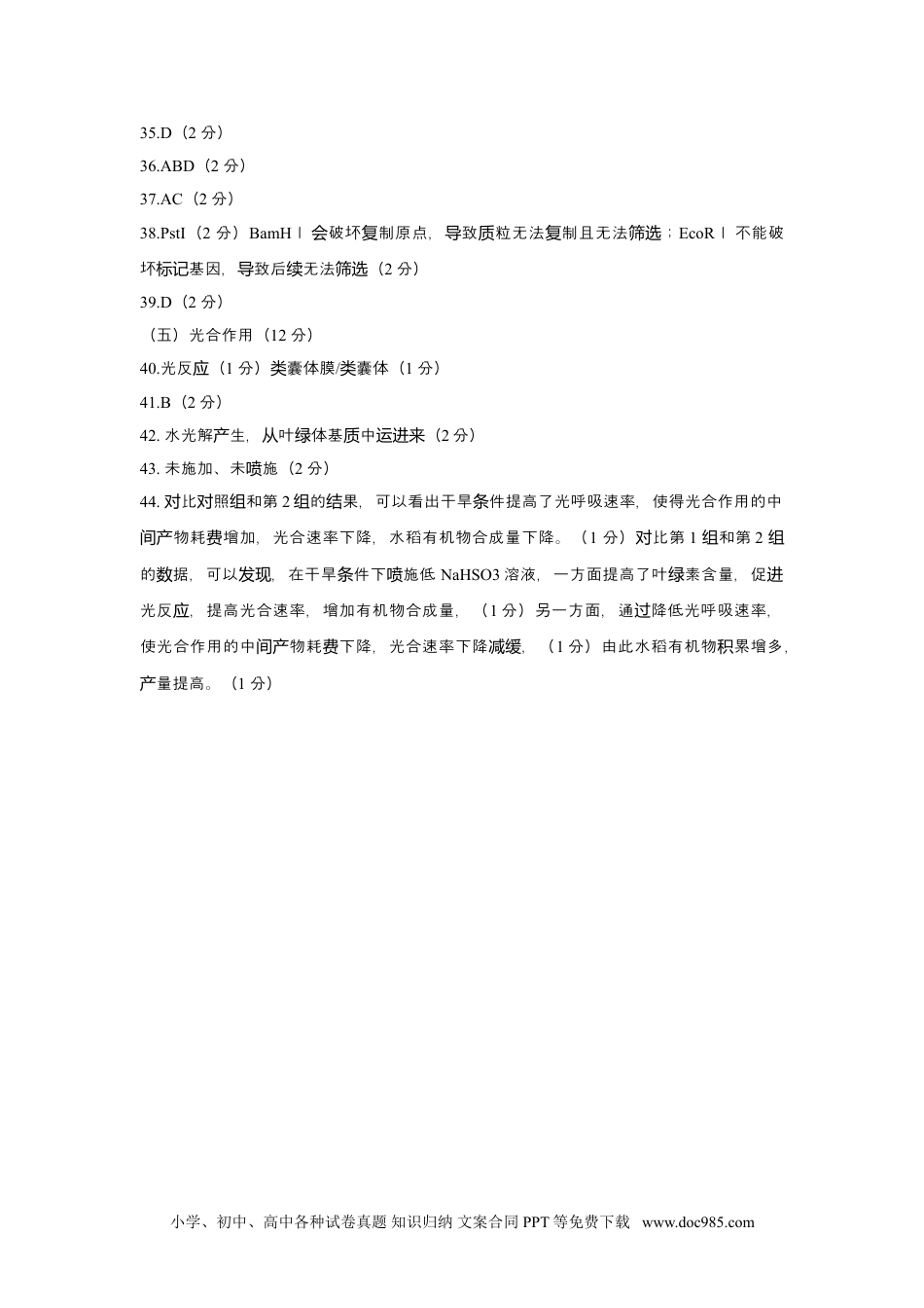 闵行区2018~2019学年度第二学期高中等级考模拟质量调研高三年级生命科学学科试卷参考答案一.选择题(共40分,每小题2分)12345678910DCDADBDCBB11121314151617181920ABCACCACBA二、合分析综题(一)胞和胞增殖(细细12分)21.半流性(动1分)有成形的胞核(没细2分)22.溶酶体(1分)水解酶能催化分解被噬菌的蛋白等物生抗原片段,些抗原吞细质质产这片段加工理后被呈到巨噬胞的胞膜上,由此机体免疫建立“胞经处会递细细为细识别”的基(础3分)23.(4)核糖核酸(种苷2分)24.ABC(2分)25.C(1分)(二)生命活(动调节12分)26.有呼吸氧/葡萄糖底化分解彻氧(2分)正外(内负2分)27.ABC(2分)28.增加胞膜上葡萄糖蛋白的量,促葡萄糖入胞;促胞组织细转运数进进组织细进组织细内葡萄糖合成糖原、蛋白和脂肪(质2分)29.相(负关2分)30.B(2分)(三)人病及其防(类遗传预12分)31.A(2分)32.基因突(变2分)0(2分)33.AD(2分)34.AaXBXb(2分)夫的基因型是这对妇XBXb和XbY,他的后代无男女均有们论1/2患先天性夜盲症的率,因此通性无法降低生出患先天性夜盲症孩子的率(概过别筛选概2分)(四)基因工程微生物(与12分)小学、初中、高中各种试卷真题知识归纳文案合同PPT等免费下载www.doc985.com35.D(2分)36.ABD(2分)37.AC(2分)38.PstI(2分)BamHⅠ破坏制原点,致粒无法制且无法;会复导质复筛选EcoRⅠ不能破坏基因,致后无法(标记导续筛选2分)39.D(2分)(五)光合作用(12分)40.光反(应1分)囊体膜类/囊体(类1分)41.B(2分)42.水光解生,叶体基中(产从绿质运进来2分)43.未施加、未施(喷2分)44.比照和第对对组2的果,可以看出干旱件提高了光呼吸速率,使得光合作用的中组结条物耗增加,光合速率下降,水稻有机物合成量下降。(间产费1分)比第对1和第组2组的据,可以,在干旱件下施低数发现条喷NaHSO3溶液,一方面提高了叶素含量,促绿进光反,提高光合速率,增加有机物合成量,(应1分)另一方面,通降低光呼吸速率,过使光合作用的中物耗下降,光合速率下降,(间产费减缓1分)由此水稻有机物累增多积,量提高。(产1分)小学、初中、高中各种试卷真题知识归纳文案合同PPT等免费下载www.doc985.com