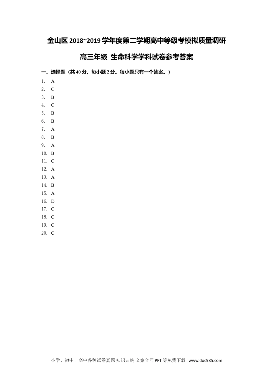 金山区2018~2019学年度第二学期高中等级考模拟质量调研高三年级生命科学学科试卷参考答案一、选择题(共40分,每小题2分。每小题只有一个答案。)1.A2.C3.B4.C5.B6.B7.A8.B9.A10.B11.C12.A13.A14.B15.A16.D17.C18.C19.C20.C小学、初中、高中各种试卷真题知识归纳文案合同PPT等免费下载www.doc985.com二、综合分析题(共60分)(一)回答下列有关细胞的问题(12分)21.(2分)C22.(2分)①③④⑤⑦23.(2分)ABD24.(2分)抗原25.(4分)⑥DNA高度螺旋化,不再,转录原有的mRNA被分解(二)回答下列关于遗传信息的表达和生物工程问题(12分)26.(2分)特性和切割异识别DNA分子27.(2分)PstⅠ、EcoRⅠ28.(4分)抗四素环B、C29.(2分)平板法或划线稀涂布平板法释30.(2分)D(三)回答下列有关调节和自稳态的问题。(12分)31.(2分)BD32.(3分)低密度极脉粥硬化,致脉壁性小、血液黏度高,外周阻力大而动样导动弹引起血升高(压2分)。33.(3分)性单纯高胆固醇血症(1分)高密度脂蛋白偏低,致胆固醇外周送导将从运到回肝的能力(量)不足(脏1分);同低密度脂蛋白偏高,致肝送胆固时导从脏运醇到外周的能力(量)增加(1分),上述因素累加,致外周血管中胆固醇含两会导量偏高。34.(4分)基丁酸突后膜受体合后,促突后膜上的离子通道打,离氨与触结进触氯开氯子流;突后膜的位依然保持息的外正,因此突后膜部位有能内触电静状态内负触没产生冲,因而基丁酸可以控制疼痛。动继续传递兴奋氨(四)回答下列有关人类遗传病的问题。(12分)35.(2分)伴X性隐遗传36.(4分)1/4XEXE或XEXe37.(3分)3和4C38.(3分)XEB、Xeb、XEb、XeB4:4:1:1(五)回答下列有关光合作用与呼吸作用的问题(12分)39.(2分)B40.(2分)不同光照强度下低度的浓NaHSO3溶液均可提高水稻的光合作用速率41.(4分)3.520℃42.(2分)①叶素含量少致光能吸收不足(光反速率低)总绿导应(2分)②孔放度相低,致二化供不足(暗反速率低)气开对导氧碳应应小学、初中、高中各种试卷真题知识归纳文案合同PPT等免费下载www.doc985.com