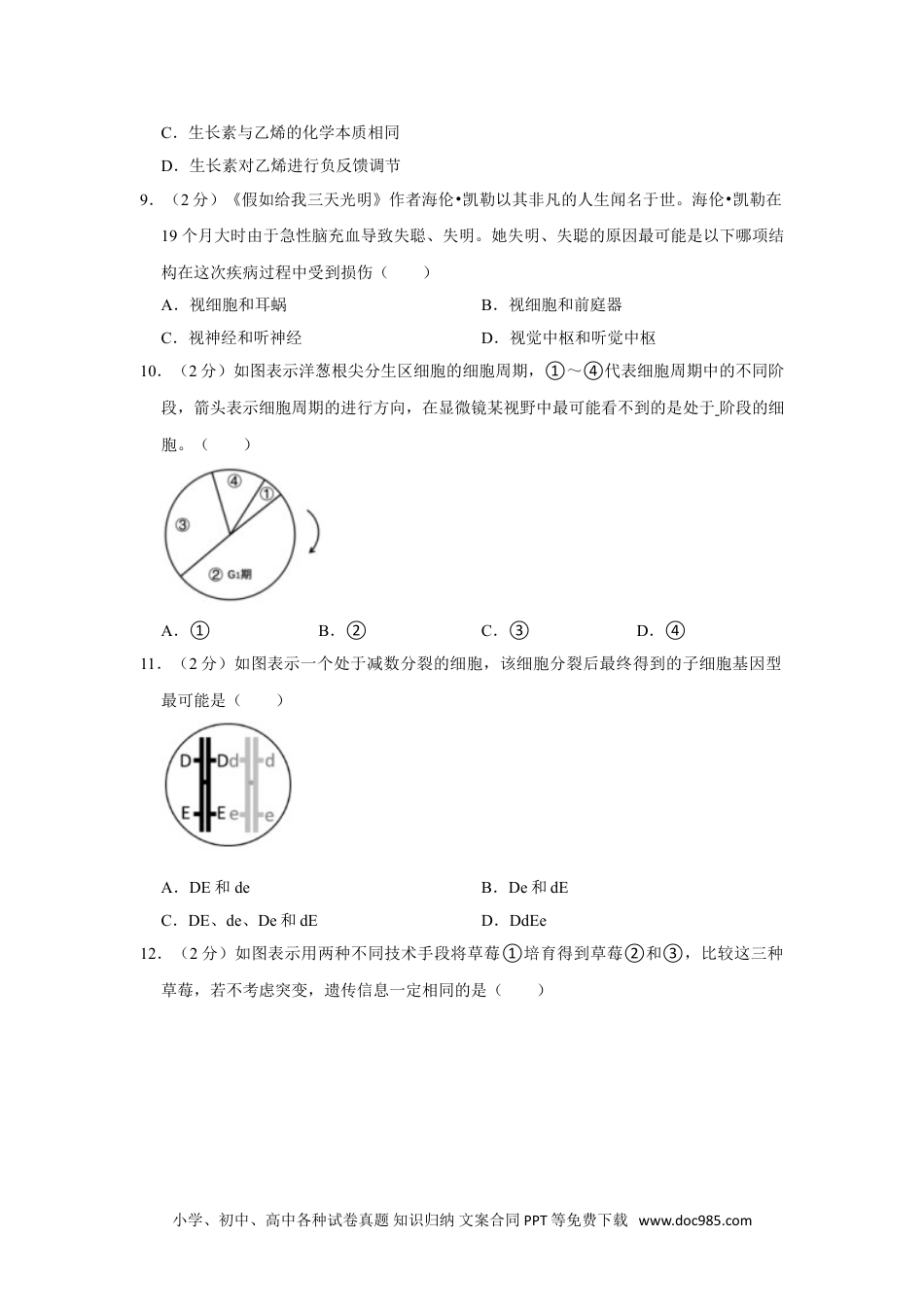2021年上海市奉贤区高考生物二模试卷一、选择题(共40分,每小题2分。每小题只有一个正确答案)1.(2分)小明通过低倍镜观察洋葱表皮细胞,某一时刻他在视野中观察到的细胞如图所示,为观察到清晰的物像,此时他应采取的操作是()A.切换到高倍镜B.调节粗调节器C.增加目镜测微尺D.旋转目镜2.(2分)牙菌斑是一种常见的生物被膜,这层导致龋齿的膜帮助细菌附着在牙釉质上,主要成分中含如图所示的化学键,则该膜主要成分中所含的化合物可能是()A.磷脂B.多糖C.核酸D.蛋白质3.(2分)如图表示水解反应,其中甲是ATP。下列说法正确的是()A.大圈表示腺嘌呤B.丙是RNA基本组成单位之一C.在主动运输过程中,乙的含量会明显减少D.甲→乙和乙→丙过程中,相关酶活性部位的空间结构相同4.(2分)如图为正常菠菜叶片中叶绿体色素的层析结果.用缺镁的完全培养液培养菠菜,一段时间后,取其新鲜叶片进行叶绿体色素分离实验,以下符合实验结果的是()小学、初中、高中各种试卷真题知识归纳文案合同PPT等免费下载www.doc985.comA.B.C.D.5.(2分)某小组探究酵母菌和乳酸菌的呼吸方式,实验装置如图所示,经过一段时间后,①~③装置中BTB试剂的颜色依次是()A.蓝色黄色蓝色B.黄色蓝色蓝色C.黄色黄色蓝色D.蓝色黄色黄色6.(2分)当前我国新冠疫苗研发处于全球第一方阵,已有多款疫苗进入三期临床试验。以下关于初次接种新冠疫苗的说法正确的是()A.接种新冠疫苗时引发了二次免疫B.新冠疫苗成分为抗体C.接种新冠疫苗能治疗新冠D.接种新冠疫苗后可产生记忆细胞7.(2分)长期暴露在印刷油墨挥发物环境中可使小鼠脑中氨基酸类神经递质的分泌减少,进而影响()A.突触前膜电位变化B.突触后膜电位变化C.突触间隙电位变化D.突触后膜受体数量8.(2分)实验表明,乙烯能抑制根系生长;低浓度的生长素可以促进根系生长,但较高浓度的生长素则抑制根系生长.下列有关解释最可能正确的是()A.生长素与乙烯相互转化B.较高浓度的生长素可能会诱导乙烯的合成小学、初中、高中各种试卷真题知识归纳文案合同PPT等免费下载www.doc985.comC.生长素与乙烯的化学本质相同D.生长素对乙烯进行负反馈调节9.(2分)《假如给我三天光明》作者海伦•凯勒以其非凡的人生闻名于世。海伦•凯勒在19个月大时由于急性脑充血导致失聪、失明。她失明、失聪的原因最可能是以下哪项结构在这次疾病过程中受到损伤()A.视细胞和耳蜗B.视细胞和前庭器C.视神经和听神经D.视觉中枢和听觉中枢10.(2分)如图表示洋葱根尖分生区细胞的细胞周期,①~④代表细胞周期中的不同阶段,箭头表示细胞周期的进行方向,在显微镜某视野中最可能看不到的是处于阶段的细胞。()A.①B.②C.③D.④11.(2分)如图表示一个处于减数分裂的细胞,该细胞分裂后最终得到的子细胞基因型最可能是()A.DE和deB.De和dEC.DE、de、De和dED.DdEe12.(2分)如图表示用两种不同技术手段将草莓①培育得到草莓②和③,比较这三种草莓,若不考虑突变,遗传信息一定相同的是()小学、初中、高中各种试卷真题知识归纳文案合同PPT等免费下载www.doc985.comA.仅①②B.仅②③C.仅①③D.①②③13.(2分)健康人的HTT基因含有6~35个CAG重复序列,而亨廷顿氏疾病患者的HTT基因中含有36个以上多至250个CAG重复序列。引发该疾病的变异类型是()A.基因突变B.基因重组C.染色体结构变异D.染色体数目变异14.(2分)生活在南美安第斯山脉的剑喙蜂鸟有超长的鸟喙,该种鸟喙专门从西番莲11.4cm长的花冠中吸食蜂蜜,而西番莲则将剑喙蜂鸟作为专用传粉使者。剑喙蜂鸟和西番莲的进化关系是()A.自然选择的结果B.西番莲大量繁殖的结果C.定向突变的结果D.蜂鸟频繁使用鸟喙的结果15.(2分)“健康卫生非小事,一筷一勺见文明”,推行公筷行动,使用公筷公勺,可以有效避免消化道传染病的传播。从传染病预防的角度看该项措施属于()A.消灭病原体B.控制传染源C.切断传播途径D.保护易感人群16.(2分)留守儿童小明沉迷于网络游戏,一天突发性晕倒在电脑前,医生检查了小明的血常规,下列物质中不能在血浆中出...