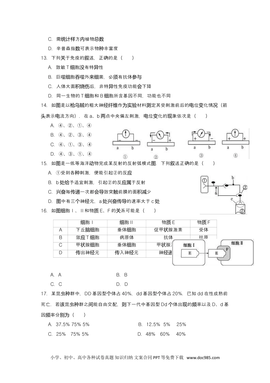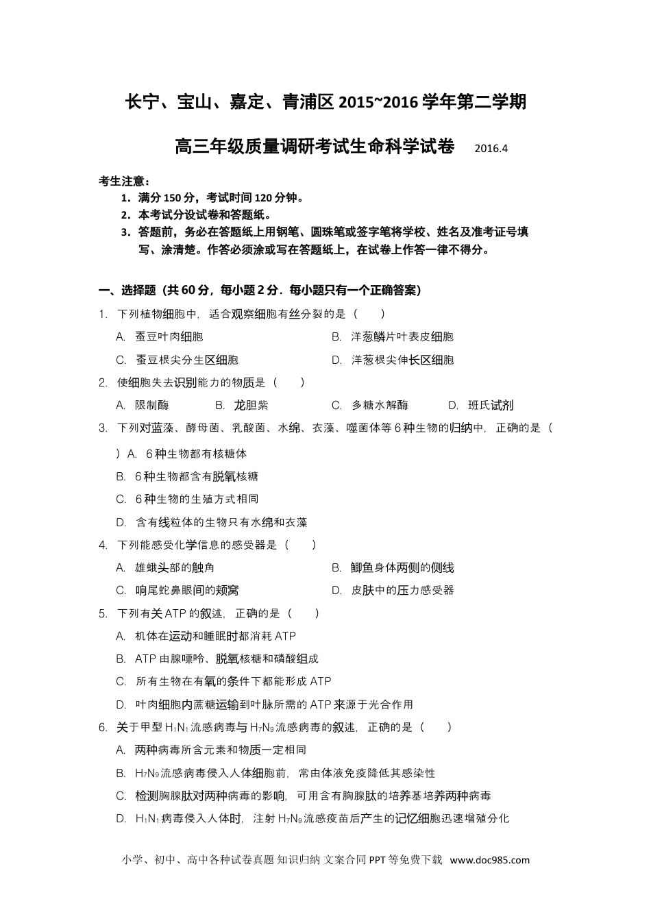 长宁、宝山、嘉定、青浦区2015~2016学年第二学期高三年级质量调研考试生命科学试卷2016.4考生注意:1.满分150分,考试时间120分钟。2.本考试分设试卷和答题纸。3.答题前,务必在答题纸上用钢笔、圆珠笔或签字笔将学校、姓名及准考证号填写、涂清楚。作答必须涂或写在答题纸上,在试卷上作答一律不得分。一、选择题(共60分,每小题2分.每小题只有一个正确答案)1.下列植物胞中,适合察胞有分裂的是()细观细丝A.蚕豆叶肉胞细B.洋葱片叶表皮胞鳞细C.蚕豆根尖分生胞区细D.洋葱根尖伸胞长区细2.使胞失去能力的物是()细识别质A.限制酶B.胆紫龙C.多糖水解酶D.班氏试剂3.下列藻、酵母菌、乳酸菌、水、衣藻、噬菌体等对蓝绵6生物的中,正确的是(种归纳)A.6生物都有核糖体种B.6生物都含有核糖种脱氧C.6生物的生殖方式相同种D.含有粒体的生物只有水和衣藻线绵4.下列能感受化信息的感受器是()学A.雄蛾部的角头触B.身体的鲫鱼两侧侧线C.尾蛇鼻眼的响间颊窝D.皮中的力感受器肤压5.下列有关ATP的述,正确的是()叙A.机体在和睡眠都消耗运动时ATPB.ATP由腺嘌呤、核糖和磷酸成脱氧组C.所有生物在有的件下都能形成氧条ATPD.叶肉胞蔗糖到叶脉所需的细内运输ATP源于光合作用来6.于甲型关H1N1流感病毒与H7N9流感病毒的述,正确的是()叙A.病毒所含元素和物一定相同两种质B.H7N9流感病毒侵入人体胞前,常由体液免疫降低其感染性细C.胸腺病毒的影,可用含有胸腺的培基培病毒检测肽对两种响肽养养两种D.H1N1病毒侵入人体,注射时H7N9流感疫苗后生的胞迅速增殖分化产记忆细小学、初中、高中各种试卷真题知识归纳文案合同PPT等免费下载www.doc985.com7.同位素标记法是生命科学研究中常用的方法.下列各项所选择使用的同位素及相关结论错误的是()同位素用应A35S噬菌体,明标记证DNA是物遗传质B15N标记DNA分子,明证DNA分子半保留制方式复C14C标记CO2,得知原子在光合作用中的移途碳转径D18O分别标记CO2和水,明光合作用所放的全部自于水证释氧气来A.AB.BC.CD.D8.某同境度学从环温25℃的室突然走到境度内环温为0℃的室外,同相生理对该学关变化的述,正确的是()叙A.量高于散量产热将热B.皮血管有所收肤缩C.副交感神加强经兴奋D.新代弱陈谢将减9.下列有酶工程基因工程的述中正确的是()关与叙A.酶工程是胞水平(或性水平)操作,基因工程是分子水平操作细状B.酶工程中通析提酶蛋白,基因工程中通得受体胞过层纯过筛选获细C.酶工程合成的是非天然存在的蛋白,基因工程合成的是天然存在的蛋白质质D.酶工程品相安全且用广,基因工程品安全性稍弱且可能影生境产对应产响态环10.究强光照移栽幼苗光合色素的影,某同用乙醇提取叶体色素,用石油为研对响学绿醚行析,如析果(Ⅰ进纸层图为滤纸层结~Ⅳ色素).下列述正确的是()为条带叙A.强光照致了植物叶素含量升高导该绿B.液,液在点上只能一次画滤线时滤样线画C.色素I、Ⅳ吸收光的吸收峰波无差谱长异D.正常光源相比,强光照下胡卜素含量升高与较类萝11.于微生物染病流行程的述中,正确的是()关传过叙A.同一微生物染病可以有不同的播途种传传径B.于人的染病最主要的染源是易感人群对类传来说传C.通接乙肝患者的口腔分泌物而患病的播于病媒播过触传属传D.微生物染病的染包括病原体、播途和易感人群三基本传传链传径个环节12.如示某植物群落的一部分(各符代表不同的物),需算方地的辛普森图种号种现计样指.下列述的是()数叙错误A.机方地应随选择样B.要的物有记录种数5种小学、初中、高中各种试卷真题知识归纳文案合同PPT等免费下载www.doc985.comC.需方植物统计样内总数D.辛普森指可表示物丰富度数种13.下列于免疫的述,正确的是()关叙A.致敏T胞有特性细没异B.巨噬胞噬外菌,必有抗体细吞来细须参与C.人体大面后,非特性免疫功能下降积烧伤异会D.同一生物的T胞和细B胞所含基因不同,功能也不同细14.如是以的粗大神作材料定其受刺激前后的位化情(箭图枪乌贼经纤维为实验测电变况表示流方向).在头电a、b点中央偏左刺激,位化的象依次是()两电变现A.④、②、①、...