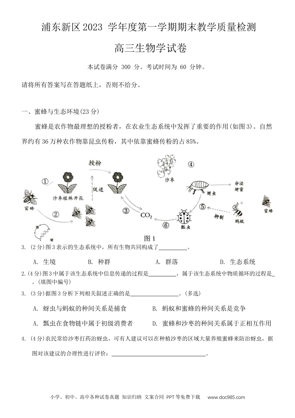 小学、初中、高中各种试卷真题知识归纳文案合同PPT等免费下载www.doc985.com浦东新区2023学年度第一学期期末教学质量检测高三生物学试卷本试卷满分300分。考试时间为60分钟。请将所有答案写在答题纸上,否则不给分。一、蜜蜂与生态环境(23分)蜜蜂是农作物最理想的授粉者,在农业生态系统中发挥了重要的作用(如图3)。自然界约有36万种农作物靠昆虫传粉,其中依靠蜜蜂传粉的占85%。3.(2分)图3表示的生态系统中,所有生物共同构成了。A.生境B.种群A.群落D.生态系统2.(4分)图3中属于该生态系统中信息传递的过程是,属于该生态系统中物质循环的过程是。(填图中编号)3.(3分)据图3分析下列相关叙述正确的是。(多选)A.蚜虫与蚂蚁的种间关系是捕食B.蚂蚁和蜜蜂的种间关系是竞争A.瓢虫在食物链中属于初级消费者D.蜜蜂和沙枣的种间关系属于正相互作用4.(4分)农民常给沙枣打药治蚜虫,可有人建议可以在种植沙枣的区域大量养殖蜜蜂来防治蚜虫,据图对该建议的合理性进行评价:。小学、初中、高中各种试卷真题知识归纳文案合同PPT等免费下载www.doc985.com高三生物学试卷第3页共30页小学、初中、高中各种试卷真题知识归纳文案合同PPT等免费下载www.doc985.com蜜蜂是唯一原地过冬的授粉昆虫,但有时由于某些因素导致过冬时,蜂巢中的几亿只蜜蜂都消失了,称为“蜜蜂蜂群崩溃症候群”。捕食者、栖息地破坏、杀虫剂的使用等因素都会影响蜜蜂的种群数量。5.(3分)蜜蜂通常在春季繁殖,则冬季期间影响蜜蜂种群密度的最主要因素是。(编号选填)①出生率②死亡率③迁入率④迁出率⑤性别比例⑥年龄结构6.(2分)图2是该生态系统中部分食物网,假设营养级间的能量传递效率为30%,且胡蜂的食物由50%植物、30%蜜蜂和40%蝗虫构成。如果胡蜂每日需要能量300kJ,则至少需要植物提供kJ的能量。7.(3分)蜜蜂越冬时,会围成一团,工蜂包裹在蜂王的外围,以维持蜂巢的正常温度。近年来研究表明:杀虫剂会影响蜜蜂正常的生理功能。图3中a图是外界环境-33℃时测定的蜂巢内部温度图,图3中b图是使用杀虫剂处理蜂群不同时间后每只蜜蜂AO₂产生量。请根据图示推测“蜜蜂蜂群崩溃症候群”现象出现的原因。二、社交挫败应激症(22分)将实验小鼠放入攻击性极强小鼠的领地,被多次攻击后,实验小鼠会出现“社交挫败应激(SDS)”。科学家发现SDS会引起小鼠脑部VTA区某些神经元活性显著增强,PVN区与LH区也会产生变化,肾上腺皮质激素水平(表征SDS程度的指标)会显著升高,抑制T淋巴细胞活化,图4是上述过程示意图。高三生物学试卷第2页共30页小学、初中、高中各种试卷真题知识归纳文案合同PPT等免费下载www.doc985.com8.(2分)据图4分析,小鼠体内参与SDS调节的系统有(多选)A.神经系统B.内分泌系统A.消化系统D.免疫系统9.(2分)小鼠出现SDS现象,激活VTA区释放GABA(神经递质)的神经元,使突触后神经元受抑制。图5是该突触传递的过程。据图5分析,下列叙述正确的是。A.通过主动运输释放GABAB.GABA被转运进入突触后神经元A.突触后膜Na⁺内流D.突触后膜不发生电位反转30.(2分)结合已有知识分析与GABA定向运输、分泌有关的细胞结构有(多选)。A.细胞骨架B.线粒体A.高尔基体D.中心体33.(2分)小鼠出现SDS后,推测激素a的含量变化可能符合(编号选填)。高三生物学试卷第3页共30页小学、初中、高中各种试卷真题知识归纳文案合同PPT等免费下载www.doc985.com32.(5分)图4中调控小鼠体内肾上腺皮质激素释放量的相关激素有。上述激素之间相互作用以实现调节,请推测这样的调节方式的意义在于(多选)A.有利于激素信号的逐级放大B.有利于对靶细胞的精准调节A.有利于内环境中激素含量的稳定D.有利于不断增加对靶细胞的调节强度33.(2分)下列关于SDS小鼠免疫功能的推测正确的是(多选)A.肾上腺皮质激素可以作为信号分子调节细胞免疫B.肾上腺皮质激素可以为T淋巴细胞的代谢提供能量A.相比对照组,SDS小鼠的免疫系统的功能增强D.相比对照组,SDS小鼠更容易发生感染和肿瘤睡眠主要分为浅睡眠和深睡眠。科学家发现,SDS会改变小鼠睡眠,并对社交压力产生影响,结果如图6。34.(7分)据图6分析SDS对睡眠的影响为。据图判断,睡眠会(加剧/缓解)小鼠的SDS症状。综合上述...