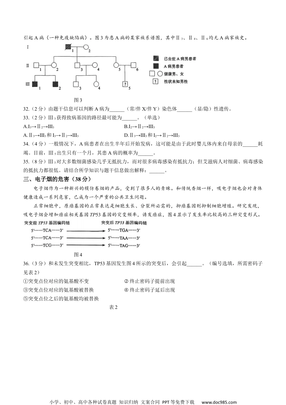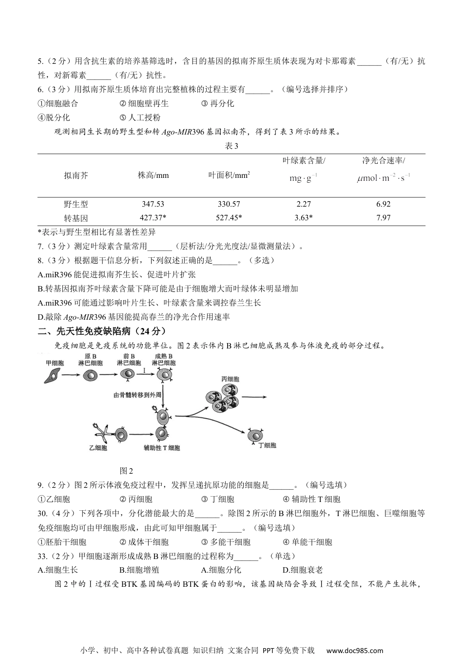 小学、初中、高中各种试卷真题知识归纳文案合同PPT等免费下载www.doc985.com静安区2023学年度第一学期期末教学质量调研高中生物学试卷2024.03考生须知:3.答题前,请将你的姓名及准考证号认真填、涂在试卷和答题纸上。2.本试卷共8页,满分为300分。考试时间为60分钟。3.所有答案必须涂(单选题、多选题、编号选填题)或写在答题纸的相应位置上。一、拟南芥(39分)拟南芥世代短、子代多,遗传背景清楚,是被科研工作者广泛使用的模式生物。研究基因的功能也常用拟南芥。春兰具有很高的观赏价值,为喜阴植物,栽培养护较为困难。miR396是植物体内的一类小RNA,与植物生长发育密切相关。为研究miR396对春兰叶片和光合作用的影响,科研人员利用拟南芥研究了转录出miR396的基因Ago-MIR396的功能。图3是部分实验过程,其中Kamr表示卡那霉素抗性基因,Neor表示新霉素抗性基因,ori表示复制起点,I~Ⅵ表示实验过程。图33.(2分)选择春兰叶片作为实验材料提取DNA的原因可能是______。(单选)A.只有叶肉细胞中才含有Ago-MIR396基因B.只有叶肉细胞中的Ago-MIR396基因才能转录出miR396A.相比其他组织细胞,叶肉细胞多且容易被破碎D.相比其他组织细胞,叶肉细胞中的核DNA更多2.(3分)利用PAR技术获取Ago-MIR396需要PAR扩增仪及PAR体系。下列各项中,属于PAR体系的有______。(编号选填)①引物②耐热DNA连接酶③耐热DNA聚合酶④耐热DNA解旋酶⑤四种核糖核苷三磷酸⑥四种脱氧核苷三磷酸3.(3分)图3所示Ⅰ~Ⅵ中,表示构建表达载体的是______。该过程一般包括“切”和“接”两个步骤,其中“切”指用限制性内切核酸酶切割______。4.(2分)用酶解法制备拟南芥原生质体时,一般使用______酶和______酶。小学、初中、高中各种试卷真题知识归纳文案合同PPT等免费下载www.doc985.com5.(2分)用含抗生素的培养基筛选时,含目的基因的拟南芥原生质体表现为对卡那霉素______(有/无)抗性,对新霉素______(有/无)抗性。6.(3分)用拟南芥原生质体培育出完整植株的过程主要有______。(编号选择并排序)①细胞融合②细胞壁再生③再分化④脱分化⑤人工授粉观测相同生长期的野生型和转Ago-MIR396基因拟南芥,得到了表3所示的结果。表3拟南芥株高/mm叶面积/mm2叶绿素含量/净光合速率/野生型347.53330.572.276.92转基因427.37*527.45*3.63*7.97*表示与野生型相比有显著性差异7.(3分)测定叶绿素含量常用______(层析法/分光光度法/显微测量法)。8.(3分)根据题干信息分析,下列叙述正确的是______。(多选)A.miR396能促进拟南芥生长、促进叶片扩张B.转基因拟南芥叶绿素含量下降可能是由于细胞增大而叶绿体未明显增加A.miR396可能通过影响叶片生长、叶绿素含量来调控春兰生长D.敲除Ago-MIR396基因能提高春兰的净光合作用速率二、先天性免疫缺陷病(24分)免疫细胞是免疫系统的功能单位。图2表示体内B淋巴细胞成熟及参与体液免疫的部分过程。图29.(2分)图2所示体液免疫过程中,发挥呈递抗原功能的细胞是______。(编号选填)①乙细胞②丙细胞③丁细胞④辅助性T细胞30.(4分)下列各项中,分化潜能最大的是______。除图2所示的B淋巴细胞外,T淋巴细胞、巨噬细胞等免疫细胞均可由甲细胞形成,由此可知甲细胞属于______。(编号选填)①胚胎干细胞②成体干细胞③多能干细胞④单能干细胞33.(2分)甲细胞逐渐形成成熟B淋巴细胞的过程称为______。(单选)A.细胞生长B.细胞增殖A.细胞分化D.细胞衰老图2中的Ⅰ过程受BTK基因编码的BTK蛋白的影响,该基因缺陷会导致Ⅰ过程受阻,不能产生抗体,小学、初中、高中各种试卷真题知识归纳文案合同PPT等免费下载www.doc985.com引起A病(一种免疫缺陷病)。图3为患A病的某家族系谱图,其中Ⅱ3、Ⅱ4、Ⅱ6均无A病家族史。图332.(2分)由题干信息可以判断A病为______(常/伴X/伴Y)染色体______(显/隐)性遗传。33.(2分)Ⅲ3获得致病基因的路径最可能为______。(单选)A.I3→Ⅱ2→Ⅲ3B.I2→Ⅱ2→Ⅲ3A.Ⅱ3→Ⅲ3和I3→Ⅱ2→Ⅲ3D.Ⅱ3→Ⅲ3和I2→Ⅱ2→Ⅲ334.(4分)一般情况下,A病患者在出生半年后开始发病,这可能是由于此时婴儿体内来自母亲的______耗竭。目前,Ⅲ5...