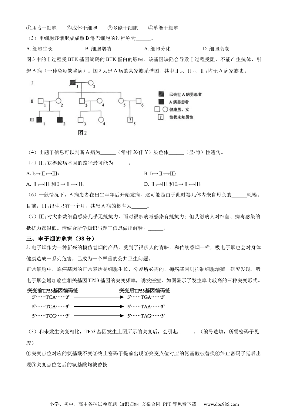 小学、初中、高中各种试卷真题知识归纳文案合同PPT等免费下载www.doc985.com静安区2023学年度第一学期期末教学质量调研高中生物学试卷考生须知:3.答题前,请将你的姓名及准考证号认真填、涂在试卷和答题纸上。2.本试卷共8页,满分为300分。考试时间为60分钟。3.所有答案必须涂(单选题、多选题、编号选填题)或写在答题纸的相应位置上。一、拟南芥(39分)3.拟南芥世代短、子代多,遗传背景清楚,是被科研工作者广泛使用的模式生物。研究基因的功能也常用拟南芥。春兰具有很高的观赏价值,为喜阴植物,栽培养护较为困难。miR396是植物体内的一类小RNA,与植物生长发育密切相关。为研究miR396对春兰叶片和光合作用的影响,科研人员利用拟南芥研究了转录出miR396的基因Ago-MIR396的功能。图3是部分实验过程,其中Kamr表示卡那霉素抗性基因,Neor表示新霉素抗性基因,ori表示复制起点,I~Ⅵ表示实验过程。(3)选择春兰叶片作为实验材料提取DNA的原因可能是______。A.只有叶肉细胞中才含有Ago-MIR396基因B.只有叶肉细胞中的Ago-MIR396基因才能转录出miR396A.相比其他组织细胞,叶肉细胞多且容易被破碎D.相比其他组织细胞,叶肉细胞中的核DNA更多(2)利用PAR技术获取Ago-MIR396需要PAR扩增仪及PAR体系。下列各项中,属于PAR体系的有______。(编号选填)①引物②耐热DNA连接酶③耐热DNA聚合酶④耐热DNA解旋酶⑤四种核糖核苷三磷酸⑥四种脱氧核苷三磷酸(3)图所示Ⅰ~Ⅵ中,表示构建表达载体的是______。该过程一般包括“切”和“接”两个步骤,其中“切”指用限制性内切核酸酶切割______。(4)用酶解法制备拟南芥原生质体时,一般使用______酶和______酶。小学、初中、高中各种试卷真题知识归纳文案合同PPT等免费下载www.doc985.com(5)用含抗生素的培养基筛选时,含目的基因的拟南芥原生质体表现为对卡那霉素______(有/无)抗性,对新霉素______(有/无)抗性。(6)用拟南芥原生质体培育出完整植株的过程主要有______。(编号选择并排序)①细胞融合②细胞壁再生③再分化④脱分化⑤人工授粉观测相同生长期的野生型和转Ago-MIR396基因拟南芥,得到了如表所示的结果。拟南芥株高/mm叶面积/mm2叶绿素含量/净光合速率/野生型347.53330.572.276.92转基因427.37*527.45*3.63*7.97*表示与野生型相比有显著性差异(7)测定叶绿素含量常用______(层析法/分光光度法/显微测量法)。(8)根据题干信息分析,下列叙述正确的是______。A.miR396能促进拟南芥生长、促进叶片扩张B.转基因拟南芥叶绿素含量下降可能是由于细胞增大而叶绿体未明显增加A.miR396可能通过影响叶片生长、叶绿素含量来调控春兰生长D.敲除Ago-MIR396基因能提高春兰的净光合作用速率二、先天性免疫缺陷病(24分)2.免疫细胞是免疫系统的功能单位。图3表示体内B淋巴细胞成熟及参与体液免疫的部分过程。(3)图3所示体液免疫过程中,发挥呈递抗原功能的细胞是______。(编号选填)①乙细胞②丙细胞③丁细胞④辅助性T细胞(2)下列各项中,分化潜能最大的是______。除图2所示的B淋巴细胞外,T淋巴细胞、巨噬细胞等免疫细胞均可由甲细胞形成,由此可知甲细胞属于______。(编号选填)小学、初中、高中各种试卷真题知识归纳文案合同PPT等免费下载www.doc985.com①胚胎干细胞②成体干细胞③多能干细胞④单能干细胞(3)甲细胞逐渐形成成熟B淋巴细胞的过程称为______。A.细胞生长B.细胞增殖A.细胞分化D.细胞衰老图3中的Ⅰ过程受BTK基因编码的BTK蛋白的影响,该基因缺陷会导致Ⅰ过程受阻,不能产生抗体,引起A病(一种免疫缺陷病)。图2为患A病的某家族系谱图,其中Ⅱ3、Ⅱ4、Ⅱ6均无A病家族史。(4)由题干信息可以判断A病为______(常/伴X/伴Y)染色体______(显/隐)性遗传。(5)Ⅲ3获得致病基因的路径最可能为______。A.I3→Ⅱ2→Ⅲ3B.I2→Ⅱ2→Ⅲ3A.Ⅱ3→Ⅲ3和I3→Ⅱ2→Ⅲ3D.Ⅱ3→Ⅲ3和I2→Ⅱ2→Ⅲ3(6)一般情况下,A病患者在出生半年后开始发病,这可能是由于此时婴儿体内来自母亲的______耗竭。目前,Ⅲ5出生只有一个月,其患A病的概率为______。(7)Ⅲ3对大多数细菌感染几乎无抵抗力,而对很多病毒感染有抵抗力;但艾...