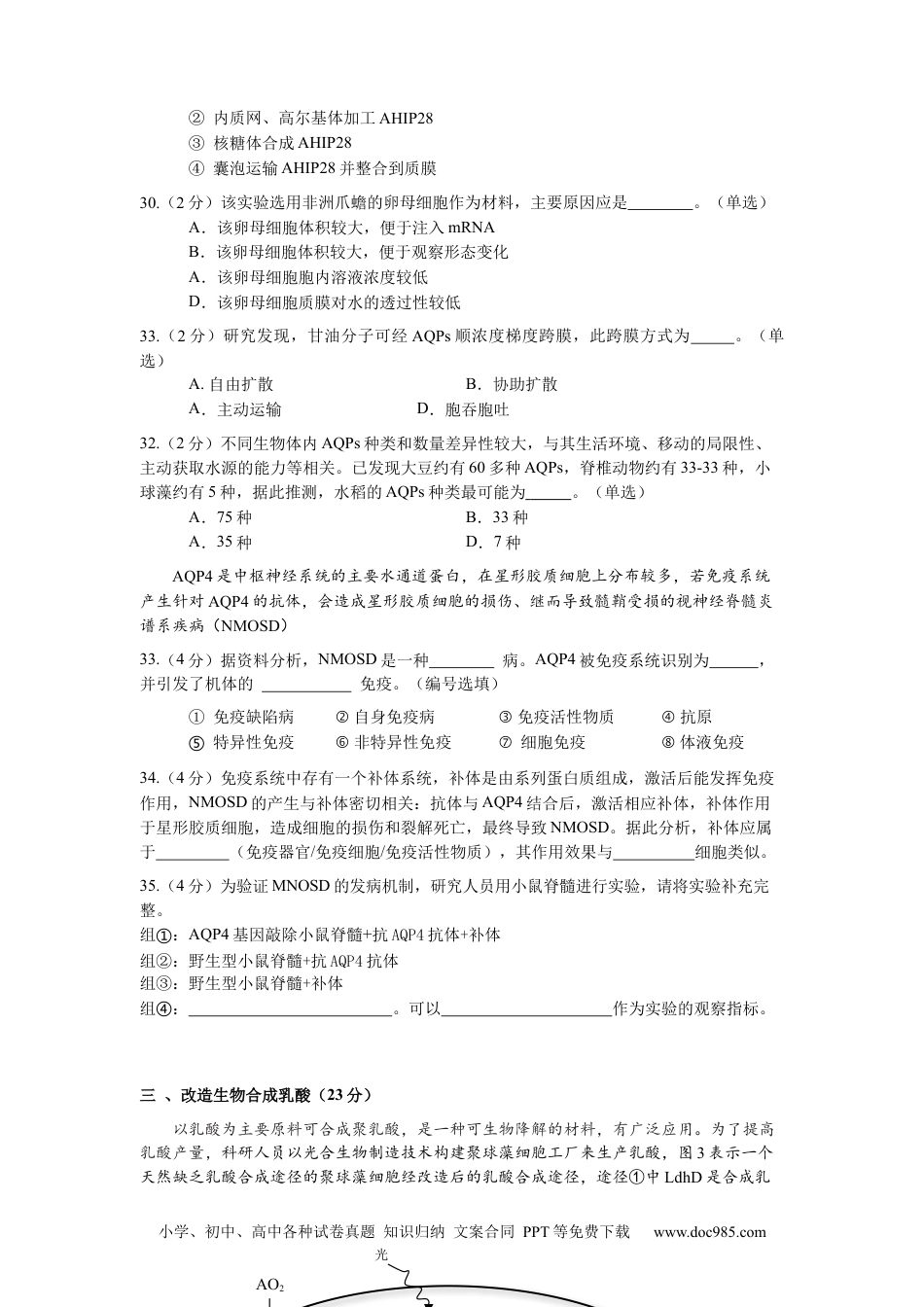 小学、初中、高中各种试卷真题知识归纳文案合同PPT等免费下载www.doc985.com2023学年第一学期期末高三年级生物学科等级考质量监测试卷考生注意:3.试卷满分300分,考试时间60分钟。2.所有答案必须填涂或填写在答题纸上,做在试卷上一律不得分。3.单选题只有一个正确答案,多选题有两个及以上正确答案,编号选填题有一个或多个正确答案。4.答题前,在答题纸上填写姓名、班级、学校和准考证号。一、退化草地的修复(23分)围栏封育作为草地管理的基本方式,具有投资少、见效快、简单易行等优点,是退化草地生态修复应用最广泛的途径之一。在以牦牛、马为主要牧畜的某轻度退化草场部分区域进行围栏封育处理,封育区内禁止放牧,研究人员获得了之后4年草地植物群落的数据变化如表3。注:同列的字母不同表示差异显著3.(2分)本研究获取的AK组数据来自(围栏封育区的当年/围栏外的自由放牧区)较为合理。2.(2分)草地植物群落在该草地生态系统中具有的作用有。(多选)A.作为该系统能量流动的起点B.作为生产者参与该系统的组成A.可与牧畜之间进行信息传递D.仅参与系统物质循环中的碳循环3.(3分)分析数据结合已学知识,推测围栏封育后植物群落密度、高度变化的可能原因有。(多选)A.围栏避免了牧畜的采食和践踏B.环境容纳量增大A.可食牧草繁殖后代的概率增加D.可食牧草和毒害草竞争加剧4.(4分)草地中高原雪兔主要取食一些低矮的喜阳草本,牦牛喜食株高较高的莎草科植物,若不考虑其他影响因素,随着围栏封育时间的增加,封育区内高原雪兔的种群数量会,请简述你所持观点的理由。5.(2分)系统可如图3所示分为封闭系统和开放系统,若将围栏封育区和自由放牧区视作两个单独的生态系统,则围栏封育区属于(封闭/开放)系统。输入输出BAA系统组分系统内相互作用系统边界BAA表3处理可食牧草生物量(g/m2)毒害草生物量(g/m2)密度(枝/m2)高度(mm)AK(对照)347.3a323.5a3933.7a69.0a第3年359.7a296.8b3923.0a74.4a第2年565.5b287.6b2333.6b89.2b第3年966.3A245.4A2254.7b333.8A第4年960.3A249.3A2253.9b332.3A小学、初中、高中各种试卷真题知识归纳文案合同PPT等免费下载www.doc985.com6.(4分)可建议在围栏封育后第年重新放牧,结合表中数据简述理由。基因发生同义突变不会改变其编码的蛋白质结构,非同义突变则相反。分子进化理论认为,可根据基因的非同义突变速率Ka和同义突变速率Ks的比值ω(Ka/Ks)来衡量基因受自然选择压力的大小。牦牛和黄牛是近缘物种,牦牛一般生活在高寒低氧的高海拔地区,黄牛主要生活在低海拔地区。7.(2分)已知部分氨基酸对应的密码子,苯丙氨酸:5’-UUU-3’、5’-UUA-3’组氨酸:5’-AAU-3’、5’-AAA-3’丝氨酸:5’-UAA-3’、5’-UAA-3’、5’-UAG-3’、5’-UAU-3’牦牛基因组分析中,所发现编码链的以下突变为非同义突变的是。(编号选填)①5’-AAT-3’→5’-AAA-3’②5’-TTA-3’→5’-TAA-3’③5’-TAG-3’→5’-TAA-3’5’-TAG-3’④→5’-TAT-3’8.(4分)自然选择对同义突变和非同义突变的压力是不一样的,如果非同义突变能使生物更好地适应环境,则其被保留固定的速率(Ka)会较(低/不变/高),结合相关信息推测,与黄牛相比,牦牛基因组中ω值明显较高的基因可能有。(多选)A.毛色相关基因B.低氧应答相关基因A.免疫相关基因D.线粒体功能相关基因二、水通道蛋白(22分)科学家发现一种质膜蛋白AHIP28并推测其可能与水分子进出细胞相关,将AHIP28的mRNA注入到非洲爪蟾的卵母细胞,一段时间后将注入和未注入mRNA的两组卵母细胞置于低浓度溶液,持续观察细胞变化结果如图2,初步证明科学家的推测是正确的。随后在许多动物植物、微生物中相继发现了类似运输水的通道蛋白,并将其统称为水通道蛋白(AQPs)。9.(4分)结合图文判断,(甲组/乙组)为注入了AHIP28蛋白mRNA的卵母细胞。该组细胞在置入低浓度溶液前细胞内发生了。(选择编号并按照正确的顺序进行排列)①细胞核AHIP28基因转录图2乙组甲组0.5min3.5min2.5min3.5min图3小学、初中、高中各种试卷真题知识归纳文案合同PPT等免费下载www.doc985.com②内质网、高尔基体加工AHIP2...