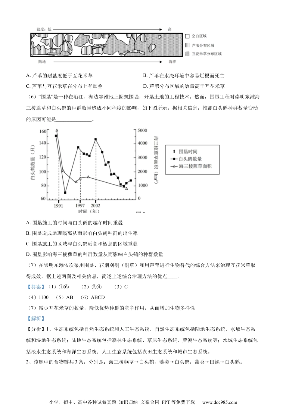小学、初中、高中各种试卷真题知识归纳文案合同PPT等免费下载www.doc985.com虹口区2022学年度第一学期期终学生学习能力诊断测试高三生物学试卷1.湿地的生物与环境上海崇明东滩傍海依江,咸淡水交汇,独特的生态环境孕育了丰富的生态资源,每年吸引数百万候鸟到此栖息、觅食。(1)崇明东滩是天然湿地,该生态系统属于____________。(用下列编号选填)①自然生态系统②人工生态系统③水域生态系统④陆地生态系统⑤海洋生态系统⑥湿地生态系统(2)崇明东滩独特的生态环境吸引了大量候鸟越冬,计算候鸟单位时间各物种数量变化最重要的依据是______________。(用下列编号选填)①出生率②死亡率③迁入率④迁出率⑤性别比例⑥年龄结构(3)崇明东滩候鸟生物多样性高,且已形成有序的鸟类生态位。以绿头鸭和白头鹤为例,结合表中信息,分析崇明东滩鸟类物种相对稳定的原因可能是______________。鸟类种类活动区域觅食种类觅食时间绿头鸭崇明东滩南部团结沙、东旺沙海三棱藨草、藻类、田螺等夜晚白头鹤崇明东滩南部团结沙、东旺沙海三棱藨草、藻类、田螺等白天A.活动区域重叠B.觅食种类相似C.觅食时间交错D.种间竞争剧烈(4)假设白头鹤的食物由50%海三棱藨草、30%田螺和20%藻类组成,田螺仅以藻类为食,且该生态系统能量从生产者到消费者的传递效率为10%,从消费者到消费者的能量传递效率为20%。据表分析,如果一只白头鹤每日需要50kJ的能量,至少需要_______________kJ的藻类。20世纪90年代,崇明东滩引入外来物种“互花米草”用作固滩护堤。然而,互花米草繁殖能力极强,兼具耐盐等特性,对当地生态系统造成了一定的破坏。(5)“生物替代”是根据植物群落演替的规律,由本地物种取代外来入侵植物的一种生态防治技术。有人认为,用“芦苇”通过生物替代的方法来治理“互花米草”不合适。结合下图信息分析,以下证据能支持该观点的是______________。小学、初中、高中各种试卷真题知识归纳文案合同PPT等免费下载www.doc985.comA.芦苇的耐盐度低于互花米草B.芦苇在水淹环境中容易烂根而死亡C.芦苇与互花米草在分布上有重叠D.芦苇分布区域的数量高于互花米草(6)“围垦”是一种在沿江、海边等滩地上圈筑围堤,开垦土地的工程技术。然而,围垦工程对崇明东滩海三棱藨草和白头鹤的种群数量造成不同程度的影响,如下图所示。据相关信息,推测白头鹤种群数量变动的原因可能是______________。A.围垦施工的时间与白头鹤的越冬时间重叠B.围垦造成地理隔离从而影响白头鹤种群的出生率C.围垦施工的区域与白头鹤觅食和栖息的区域重叠D.围垦影响海三棱藨草的种群数量从而影响白头鹤的种群数量(7)在崇明东滩依次采用围垦、花期刈割(割草)和用芦苇进行生物替代的综合方法来治理互花米草取得成效。据上述两图及相关信息,简述上述综合治理方法的优点____。【答案】(1)①⑥(2)③④(3)C(4)1100(5)AB(6)ABCD(7)减少互花米草的数量,降低优势种群的竞争作用,从而增加生物多样性【解析】【分析】1、生态系统包括自然生态系统和人工生态系统,自然生态系统包括陆地生态系统、水域生态系统和湿地生态系统;陆地生态系统包括森林生态系统、草原生态系统、荒漠生态系统等;水域生态系统包括淡水生态系统和海洋生态系统;人工生态系统包括农田生态系统和城市生态系统。2、该题中的食物链共3条,分别是:海三棱燕草→白头鹤,藻类→白头鹤,藻类→田螺→白头鹤。小学、初中、高中各种试卷真题知识归纳文案合同PPT等免费下载www.doc985.com3、互花米草入侵后,一方面互花米草与本地植物的竞争中逐渐占据优势,导致海三棱蔗草、芦苇等植物的数量下降,多数鸟类均不采食互花米草,而以海三棱蔗草、芦苇等植物为食,从而导致鸟类种群数量和多样性下降,另一方面互花米草的大量繁殖造成潮沟堵塞,导致鱼类、底栖动物数量下降,而鱼类、底栖动物是鸟类的食物来源之一,从而导致鸟类种群数量和多样性下降。【小问1详解】生态系统包括自然生态系统和人工生态系统,自然生态系统包括陆地生态系统、水域生态系统和湿地生态系统,故崇明东滩是天然湿地,该生态系统属于①自然生态系统、⑥湿地生态系统...