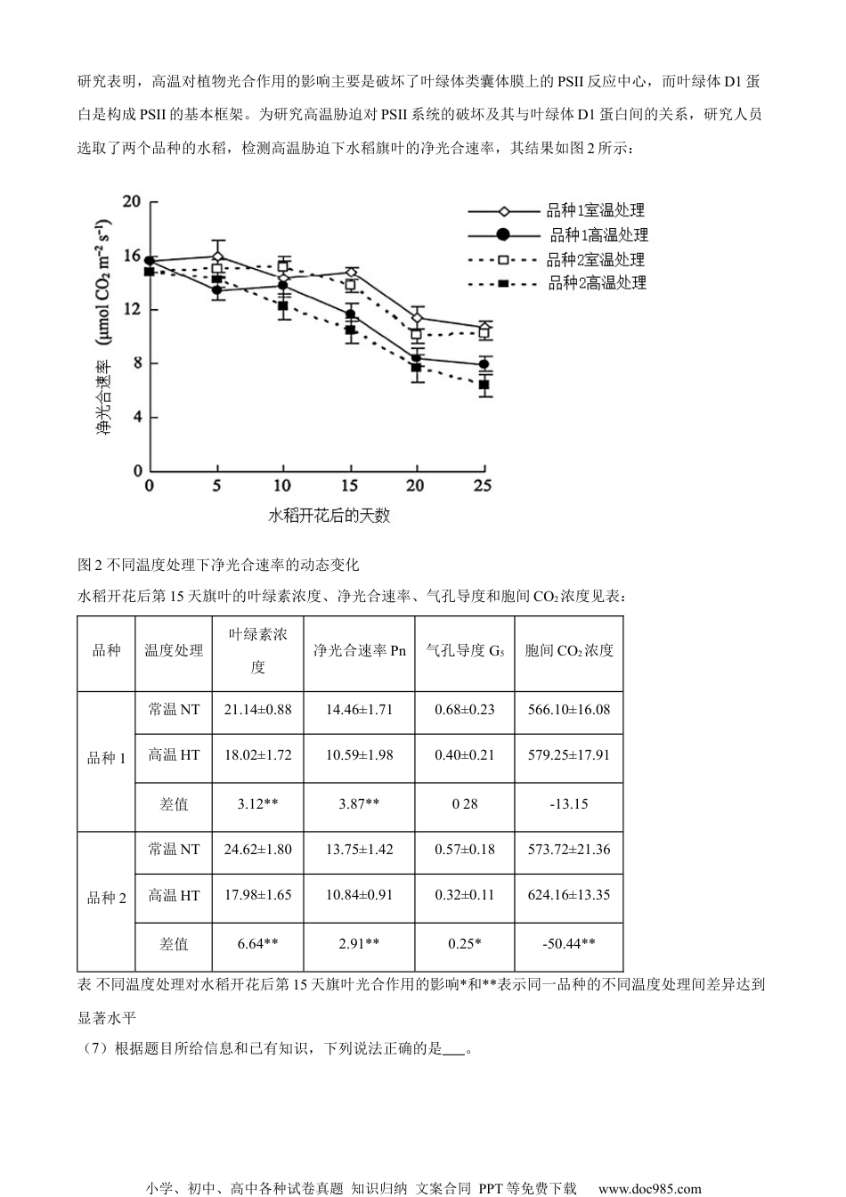 小学、初中、高中各种试卷真题知识归纳文案合同PPT等免费下载www.doc985.com高三生物学(考试时间60分钟满分100分)考生注意:本考试分设试卷和答题纸两部分。所有答案必须涂(编号选填或选择题)或写(简答题)在答题纸上;做在试卷上一律不得分。一、细胞与代谢1.叶绿体内大约有95%的蛋白质是由核基因控制合成的,以前体蛋白的形式与叶绿体膜上受体作用再经过TOC-TIC蛋白复合体转运至叶绿体中,其过程如图1所示:图1TOC-TIC将核基因控制的前体蛋白转运进叶绿体示意图(1)前体蛋白进入叶绿体的方式属于。(单选)A.自由扩散B.协助扩散C.主动运输D.胞吞(2)前体蛋白进入叶绿体的过程体现了叶绿体内膜具有的特点或功能有____(编号选填)①一定的流动性②控制物质进出③参与信息交流(3)光合色素分布在______(填图中字母)上,其作用是________。(4)下列①~⑤是图1中相应结构或物质,其中以磷脂和蛋白质为主要成分的结构是_____;核糖核酸分布于_______;碳反应发生于________。(编号选填)①核膜②细胞质③叶绿体基质④前体蛋白⑤TOC-TIC复合体(5)转运肽基质加工酶(SPP)将前体蛋白加工成成熟蛋白的过程中可能改变了前体蛋白的。A.氨基酸数目B.空间结构C.氨基酸序列D.肽键结构(6)参与叶绿体蛋白合成和转运的细胞器有_________。(编号选填)①核糖体②内质网③高尔基体④溶酶体⑤线粒体⑥中心体小学、初中、高中各种试卷真题知识归纳文案合同PPT等免费下载www.doc985.com研究表明,高温对植物光合作用的影响主要是破坏了叶绿体类囊体膜上的PSII反应中心,而叶绿体D1蛋白是构成PSII的基本框架。为研究高温胁迫对PSII系统的破坏及其与叶绿体D1蛋白间的关系,研究人员选取了两个品种的水稻,检测高温胁迫下水稻旗叶的净光合速率,其结果如图2所示:图2不同温度处理下净光合速率的动态变化水稻开花后第15天旗叶的叶绿素浓度、净光合速率、气孔导度和胞间CO2浓度见表:品种温度处理叶绿素浓度净光合速率Pn气孔导度G5胞间CO2浓度品种1常温NT21.14±0.8814.46±1.710.68±0.23566.10±16.08高温HT18.02±1.7210.59±1.980.40±0.21579.25±17.91差值3.12**3.87**0.28-13.15品种2常温NT24.62±1.8013.75±1.420.57±0.18573.72±21.36高温HT17.98±1.6510.84±0.910.32±0.11624.16±13.35差值6.64**2.91**0.25*-50.44**表不同温度处理对水稻开花后第15天旗叶光合作用的影响*和**表示同一品种的不同温度处理间差异达到显著水平(7)根据题目所给信息和已有知识,下列说法正确的是。小学、初中、高中各种试卷真题知识归纳文案合同PPT等免费下载www.doc985.comA.高温胁迫会影响水稻旗叶对光的吸收B.高温对水稻品种1的净光合速率影响更大C.高温对气孔导度的影响没有其对光合速率的影响明显D.高温会影响叶绿体中酶的重复利用(8)根据题干所给信息和已有知识,高温胁迫下水稻的净光合速率______(增大/不变/减小),请说明你的判断依据___________________【答案】(1)C(2)②(3)①.c.②吸收、转化、传递光能(4)①...①②②③③(5)AB(6)①⑤(7)ABCD(8)①.减小②.叶绿素浓度降低,气孔导度也降低,而胞间CO2浓度升高【解析】【分析】光合作用整个过程中是合成有机物并储存光能的过程。具体过程分光反应阶段和暗反应阶段。光反应阶段中,色素吸收、传递光能,并将光能变为ATP活跃的化学能。暗反应过程中将ATP活跃的化学能转变成化合物中稳定的化学能。分析题图:a为叶绿体外膜,b为叶绿体内膜,c为类囊体薄膜。【小问1详解】分析题图,TOC-TIC蛋白复合体相当于位于叶绿体膜上的载体蛋白,其转运前体蛋白至叶绿体中,需要消耗能量,方式属于主动运输,C符合题意。故选C。【小问2详解】前体蛋白通过TOC-TIC蛋白复合体进入叶绿体,TOC-TIC蛋白复合体相当于位于叶绿体膜上的载体蛋白,这体现了叶绿体膜具有②控制物质进出的功能。故选②。【小问3详解】光合色素可以吸收、传递、转化光能,其分布在叶绿体中的类囊体薄膜上,图中c为类囊体薄膜。【小问4详解】生物膜的主要成分为磷脂和蛋白质,细胞膜、细胞器膜和核膜都属于生物膜,故以磷脂和蛋白质为主要成分的结构是①核...