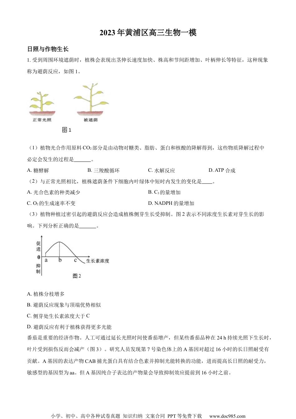 小学、初中、高中各种试卷真题知识归纳文案合同PPT等免费下载www.doc985.com2023年黄浦区高三生物一模日照与作物生长1.受到周围环境遮荫时,植株会表现出茎伸长速度加快、株高和节间距增加、叶柄伸长等特征,这种现象称为避荫反应,如图1。(1)植物光合作用原料CO2部分是由动物对糖类、脂肪、蛋白和核酸的降解得到,这些物质降解过程中必定会发生的过程是。A.糖酵解B.三羧酸循环C.水解反应D.ATP合成(2)与正常光照相比,植株遮荫条件下细胞内叶绿体中短时内发生的变化是。A.光合色素的种类减少B.C3的量增加C.O2的生成速率不变D.NADPH的量增加(3)植物种植过密引起的避荫反应会造成植株侧芽生长受抑制。图2表示不同浓度生长素对芽生长的影响。下列分析正确的是。A.植株分枝增多B.避荫反应现象与顶端优势相似C.侧芽处生长素浓度大于CD.避荫反应有利于植株获得更多光能番茄是重要的经济作物。人工可通过延长光照时间使番茄增产,但某些番茄品种在24h持续光照下生长时,叶片受到损伤反而会减产(图3)。研究人员发现第7号染色体上的A基因对超过16小时的长日照耐受有贡献。A基因的表达产物CAB捕光蛋白具有结合色素并抑制光能转换的功能,进而提高长日照的耐受力,敏感型的基因型为aa。但A基因纯合子表达的产物量会导致抑制效应提前到16小时之前。小学、初中、高中各种试卷真题知识归纳文案合同PPT等免费下载www.doc985.com(4)科研人员在进行图3数据所示的实验中的自变量是_____________。在光照16小时下的实验时,应设置的合理实验条件是_____________。(填写下列编号)①保持大气湿度恒定②保持光照强度不变③保持二氧化碳浓度不变④选取若干株同一品种的番茄⑤所选取的番茄植物生长发育状况保持基本一致(5)据图4信息可知,大棚提高番茄产量可采用的措施包括_____________。(6)据题干和图4中的信息,阐述⑥低于④,但却与②无显著性差异的可能原因是__________。肌肉收缩缺损综合征2.骨骼肌的收缩受运动神经元支配(如图1所示)。神经激活后,信号通过T小管向下深入肌肉。位于肌纤维膜上的DHPR受体蛋白感应去极化信号,并开启肌浆网(Ca2+存储点)终端处的Ca2+通道蛋白RYR1。Ca2+从肌浆网内被释放进肌纤维浆,进而刺激肌原纤维节收缩。研究发现,MTM1蛋白能维持DHPR与RYR1的接触和功能;DNM2蛋白能抑制T-小管的形成。编码上述蛋白的基因(同名,用斜体表示)在染色体上的定位以及导致肌肉收缩缺损综合征的性质列在表中。小学、初中、高中各种试卷真题知识归纳文案合同PPT等免费下载www.doc985.com(1)图1中肌膜的物质组成包括_____________。(填写下列编号)①磷脂②脂肪③固醇④蛋白质⑤多糖(2)DHPR受体蛋白接受信息后结构变化,从而开启Ca2+通道蛋白RYR1。机体内驱动DHPR受体蛋白结构变化的直接能源是。A.蛋白质B.脂肪C.葡萄糖D.腺苷三磷酸(3)根据表及图2中各基因的致病条件,填充表中空白部分。(已知8号无致病基因)基因名称定位染色体致病条件致病基因DHPR1号显性DNM219号患者个体的等位基因序列不一致②MTMI①参见图2RYRI19号患者个体的等位基因均发生突变(4)若仅考虑表1中基因DNM2和RYR1,假设某女性个体是针对这两对基因的杂合体,那么在其减数分裂形成的卵细胞中,含有的致病基因的个数可能是_____________。(填写下列编号)①0个②1个③2个④3个⑤4个(5)测序研究发现,DHPR基因内编码精氨酸的第1239位密码子编码序列(即非模板链序列)5’-CGT-3’中G突变为A(变成组氨酸密码子编码序列),是致病的主要因素。由此判断在患者体内,当DHPR-mRNA翻译至第1239位密码子时,运载相应氨基酸的tRNA反密码子序列是5’-_____________-3’。(6)为了针对性治疗因上述基因突变所致的肌肉收缩缺损综合征,科研人员开发了能特异性抑制某些突变基因高水平表达的所谓单链反义核酸药物。该药物能与目标致病性(突变性)mRNA发生碱基互补的单链RNA。结合所学知识判断,此类核酸药物的工作原理是。A.阻止核糖体与mRNA结合B.促进DNA聚合酶合成DNAC.抑制RNA聚合酶生成mRNAD.阻隔氨酰tRNA与mRNA结合糖尿病的治疗3.糖尿病的治疗是现代医学仍未很好解决的难题。研究人员通过多...