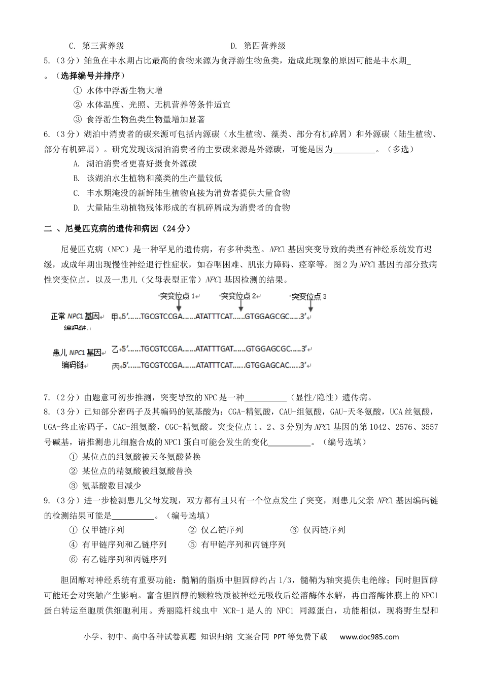 小学、初中、高中各种试卷真题知识归纳文案合同PPT等免费下载www.doc985.com2024学年第一学期宝山区期末高三年级生物学科等级考质量监测试卷考生注意:1.试卷满分100分,考试时间60分钟。2.所有答案必须填涂或填写在答题纸上,做在试卷上一律不得分。3.单选题只有一个错误答案,多选题有两个及以上错误答案,编号选填题有一个或多个错误答案。4.答题前,在答题纸上填写姓名、班级、学校和准考证号。一、水位波动对湖泊生态的影响(18分)某湖泊与河流之间有水文连通,降水较多的季节河流水位上涨会倒灌入湖泊,降水较少的季节湖泊流水入河,导致湖泊水位的周期性波动如图1,甲、乙、丙分别为不同区域的湖堤和湖基底。表1是该湖泊中鲌鱼的主要食物来源及占比。食物时期食草鱼类食杂食鱼类食鱼鱼类食浮游生物鱼类虾枯水期19.7%47.2%2.3%24.8%6.0%丰水期14.2%12.3%5.0%54.2%14.3%1.(3分)在近期对该湖泊的一次科研调查中极少量发现一种外来鱼类,若湖泊环境不发生重大变化,预测该外来鱼类五年内种群数量的变化可能为。(多选)A.逐渐减少直至在该湖泊灭绝B.呈“J”型曲线增长C.先快速增长,后急剧下降D.呈“S”型曲线增长2.(2分)12月到第二年7月的时间段内,图1中发生群落演替最明显的区域是。(编号选填)①甲②乙③丙3.(4分)湖泊枯水期到丰水期的水位变化是生态系统的直接体现,水位变化同时带来的水体深度、水体浑浊度等变化也会影响该湖泊生态系统的。(编号选填)①物质循环②能量流动③信息交流4.(3分)从表1可推测,鲌鱼在该湖泊生态系统中可处于。(多选)A.第一营养级B.第二营养级小学、初中、高中各种试卷真题知识归纳文案合同PPT等免费下载www.doc985.comC.第三营养级D.第四营养级5.(3分)鲌鱼在丰水期占比最高的食物来源为食浮游生物鱼类,造成此现象的原因可能是丰水期。(选择编号并排序)①水体中浮游生物大增②水体温度、光照、无机营养等条件适宜③食浮游生物鱼类生物量增加显著6.(3分)湖泊中消费者的碳来源可包括内源碳(水生植物、藻类、部分有机碎屑)和外源碳(陆生植物、部分有机碎屑)。研究发现该湖泊消费者的主要碳来源是外源碳,可能是因为。(多选)A.湖泊消费者更喜好摄食外源碳B.该湖泊水生植物和藻类的生产量较低C.丰水期淹没的新鲜陆生植物直接为消费者提供大量食物D.大量陆生动植物残体形成的有机碎屑成为消费者的食物二、尼曼匹克病的遗传和病因(24分)尼曼匹克病(NPC)是一种罕见的遗传病,有多种类型。NPC1基因突变导致的类型有神经系统发育迟缓,或成年期出现慢性神经退行性症状,如吞咽困难、肌张力障碍、痉挛等。图2为NPC1基因的部分致病性突变位点,以及一患儿(父母表型正常)NPC1基因检测的结果。7.(2分)由题意可初步推测,突变导致的NPC是一种(显性/隐性)遗传病。8.(3分)已知部分密码子及其编码的氨基酸为:CGA-精氨酸,CAU-组氨酸,GAU-天冬氨酸,UCA丝氨酸,UGA-终止密码子,CAC-组氨酸,CGC-精氨酸。突变位点1、2、3分别为NPC1基因的第1042、2576、3557号碱基,请推测患儿细胞合成的NPC1蛋白可能会发生的变化。(编号选填)①某位点的组氨酸被天冬氨酸替换②某位点的精氨酸被组氨酸替换③氨基酸数目减少9.(3分)进一步检测患儿父母发现,双方都有且只有一个位点发生了突变,则患儿父亲NPC1基因编码链的检测结果可能是。(编号选填)①仅甲链序列②仅乙链序列③仅丙链序列④有甲链序列和乙链序列⑤有甲链序列和丙链序列⑥有乙链序列和丙链序列胆固醇对神经系统有重要功能:髓鞘的脂质中胆固醇约占1/3,髓鞘为轴突提供电绝缘;同时胆固醇可能还会对突触产生影响。富含胆固醇的颗粒物质被神经元吸收后经溶酶体水解,再由溶酶体膜上的NPC1蛋白转运至胞质供细胞利用。秀丽隐杆线虫中NCR-1是人的NPC1同源蛋白,功能相似,现将野生型和小学、初中、高中各种试卷真题知识归纳文案合同PPT等免费下载www.doc985.comNCR-1基因缺失型秀丽隐杆线虫进行系列实验,结果如图3、图4。(标注的字母不同代表有显著差异)10.(2分)秀丽隐杆线虫有两种性别,两种性别个体常染色体组成相同,若性染色体为XX是雌雄同体,若为X则是雄性...