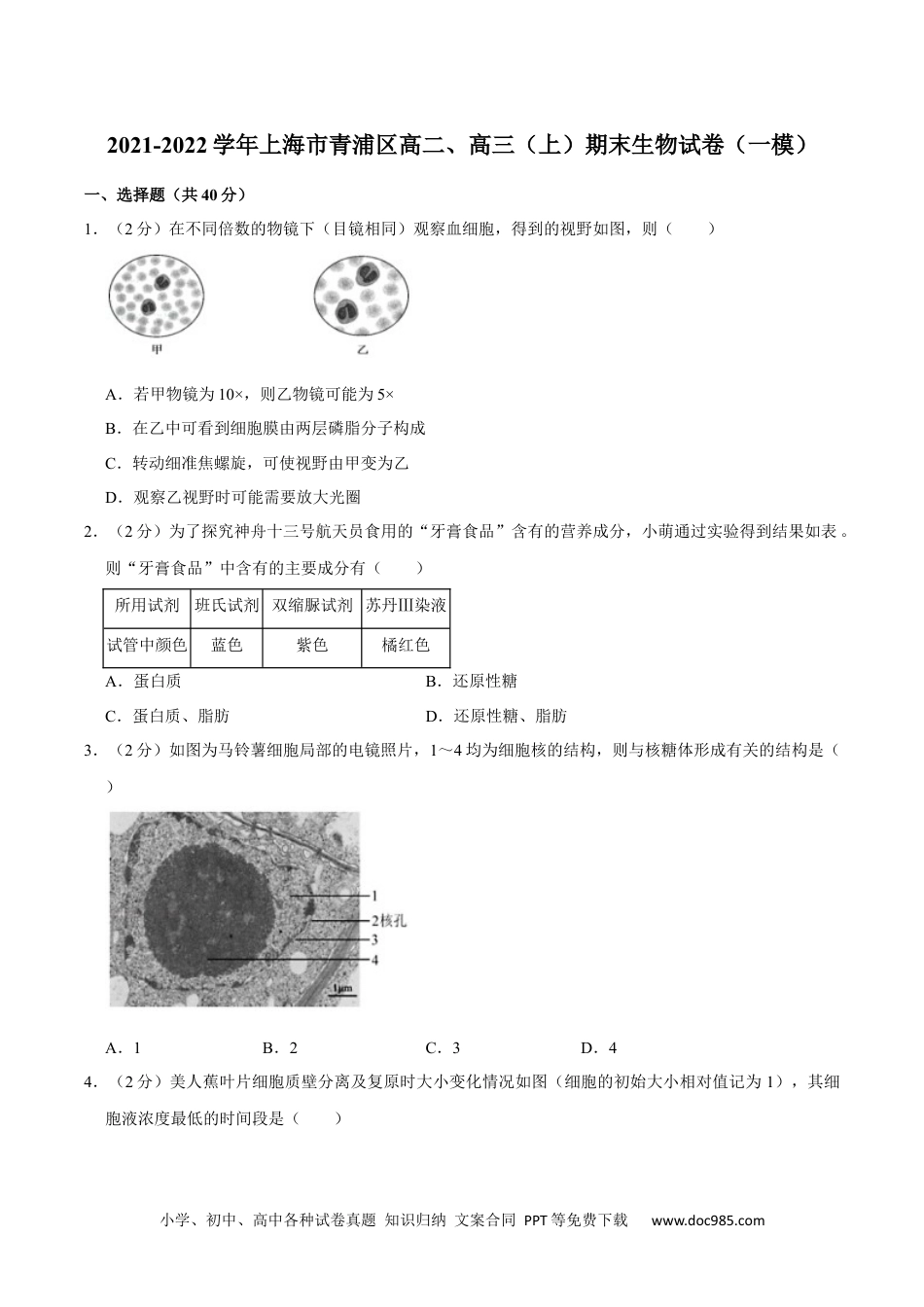 小学、初中、高中各种试卷真题知识归纳文案合同PPT等免费下载www.doc985.com2021-2022学年上海市青浦区高二、高三(上)期末生物试卷(一模)一、选择题(共40分)1.(2分)在不同倍数的物镜下(目镜相同)观察血细胞,得到的视野如图,则()A.若甲物镜为10×,则乙物镜可能为5×B.在乙中可看到细胞膜由两层磷脂分子构成C.转动细准焦螺旋,可使视野由甲变为乙D.观察乙视野时可能需要放大光圈2.(2分)为了探究神舟十三号航天员食用的“牙膏食品”含有的营养成分,小萌通过实验得到结果如表。则“牙膏食品”中含有的主要成分有()所用试剂班氏试剂双缩脲试剂苏丹Ⅲ染液试管中颜色蓝色紫色橘红色A.蛋白质B.还原性糖C.蛋白质、脂肪D.还原性糖、脂肪3.(2分)如图为马铃薯细胞局部的电镜照片,1~4均为细胞核的结构,则与核糖体形成有关的结构是()A.1B.2C.3D.44.(2分)美人蕉叶片细胞质壁分离及复原时大小变化情况如图(细胞的初始大小相对值记为1),其细胞液浓度最低的时间段是()小学、初中、高中各种试卷真题知识归纳文案合同PPT等免费下载www.doc985.comA.a~bB.b~cC.c~dD.d~e5.(2分)“古法制饴”过程如下:将萌发的小麦种子打碎,与蒸熟冷却的糯米(含淀粉)搅拌均匀,保温6h后大火熬至粘稠得到麦芽糖,则()A.打碎的小麦为反应进行提供能量B.打碎的小麦为反应提供生物催化剂C.“大火”为反应提供适宜温度D.“古法制饴”属于脱水缩合反应6.(2分)研究人员将乳酸脱氢酶基因导入普通酵母,检测后证明转基因酵母具有两条无氧呼吸途径。推测转基因酵母无氧呼吸终产物有()①丙酮酸②CO2③H2O④乳酸⑤乙醇A.①②③B.②③⑤C.②④⑤D.①③④7.(2分)“植物细胞有丝分裂观察”实验中观察到数量最多的细胞类型是()A.B.C.D.8.(2分)将某月季植株进行如图操作,正常情况下不可能属于幼苗1或幼苗2的细胞是()小学、初中、高中各种试卷真题知识归纳文案合同PPT等免费下载www.doc985.comA.B.C.D.9.(2分)如图为某反射弧的部分结构,其中a、b、c表示相关结构,则()A.从a到c构成一个完整反射弧B.兴奋在b处的传递是双向的C.刺激c,在a上能测到电位变化D.刺激a,在c上能测到电位变化10.(2分)如图所示,用燕麦胚芽鞘进行实验,一段时间后,胚芽鞘不会弯曲生长的是()A.①B.②C.③D.④11.(2分)“跳台滑雪”是冬奥会的比赛项目,运动员在跳台末端飞出时不会出现的是()A.交感神经兴奋,瞳孔放大B.肾上腺素分泌增多,心跳加快C.呼吸中枢兴奋,呼吸频率加快D.皮肤毛细血管舒张,面色苍白12.(2分)下列对图中①②③④(人体内不同部位的液体)叙述合理的是()小学、初中、高中各种试卷真题知识归纳文案合同PPT等免费下载www.doc985.comA.①②③④共同组成内环境B.②来自①并流回③C.神经递质可以存在于③中D.③中的K+浓度高于④中的13.(2分)国家速滑馆“冰丝带”运用高科技手段保证室内温度为16℃,观众从寒冷的室外进入馆内后,会出现()A.骨骼肌战栗B.汗液分泌减少C.甲状腺激素分泌增加D.促甲状腺激素分泌减少14.(2分)白化病是基因突变引起黑色素酶先天缺陷所致,据图判断()A.①是转录,以DNA的两条链为模板B.①过程中以四种脱氧核苷酸为原料C.②是翻译,在细胞核中进行D.白化病是基因通过控制酶的合成而间接控制性状的实例15.(2分)如图为牵牛花DNA分子中控制花色的三个基因,其中Ⅰ、Ⅱ无遗传效应。则()A.Ⅰ、Ⅱ中发生碱基对的替换不属于基因突变B.生物的一种性状均受多对等位基因的控制C.a、b、c三个基因互为等位基因D.a基因中某一碱基对发生改变一定导致花色改变16.(2分)为保留转基因奶牛的优良性状,育种工作者采用如图方式对其进行繁育,则()小学、初中、高中各种试卷真题知识归纳文案合同PPT等免费下载www.doc985.comA.丙的遗传物质都来自乙B.丙的性别与甲不一定相同C.该过程体现了乙体细胞的全能性D.该过程运用了细胞核移植技术17.(2分)人类指甲髌骨综合征是由常染色体显性基因N引起的,该基因往往与ABO血型系统中的IA基因连锁。现有一对基因型为和的夫妇,...