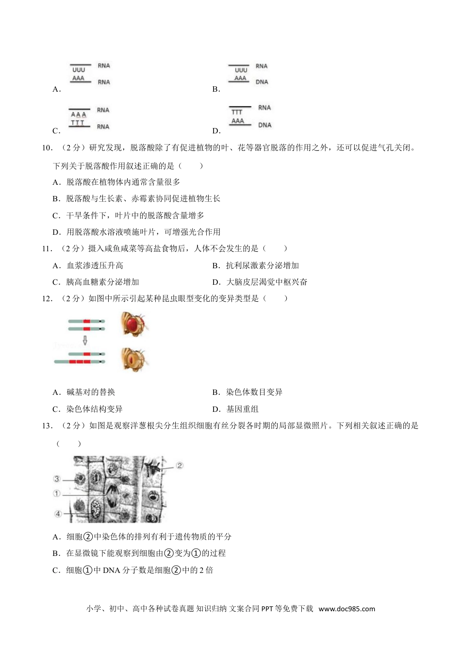 2021-2022学年上海市浦东新区高二、高三(上)期末生物试卷(一模)一、选择题(共40分,每小题2分。每小题只有一个正确答案)1.(2分)下列大分子物质均由单体组成,其中单体种类最多的是()A.DNAB.血红蛋白C.淀粉D.纤维素2.(2分)如图为显微镜高倍镜下测量细胞长度的示意图,下列相关叙述正确的是()A.可直接测得该细胞的实际长度B.图中所示为物镜测微尺C.转为低倍镜后,读数会变大D.可通过旋转目镜调整测微尺的位置3.(2分)图为细胞内发生的某一化学反应,据图判断该反应的类型是()A.合成反应B.水解反应C.氧化分解反应D.转氨基作用4.(2分)中国科学院首次人工创建了自然界不存在的生命﹣﹣人造单染色体酵母,其与天然酵母细胞形态结构、功能相似,但仅含有一条“超级染色体”。下列关于人造单染色体酵母的叙述正确的是()A.没有以核膜为界限的细胞核B.在核糖体中合成蛋白质C.葡萄糖是其直接能源物质D.遗传信息储存在RNA中5.(2分)如果人体通过摄入大量蛋白质来减肥,有时候会适得其反,因为此时机体内部加强发生的过程是()A.糖类的氧化分解B.脂肪的氧化分解小学、初中、高中各种试卷真题知识归纳文案合同PPT等免费下载www.doc985.comC.转氨基作用D.脱氨基作用6.(2分)牛痘病毒和天花病毒是两种不同的病毒,接种牛痘疫苗能预防天花,其原因是两种病毒具有图所示的相同成分()A.①②③B.仅①②C.仅①D.仅③③7.(2分)如图为土豆的一种常见的繁殖过程示意图,下列相关叙述正确的是()A.图中土豆繁殖方式为出芽生殖B.该过程发生了基因重组C.通常①处和②处细胞中的DNA相同D.该方式产生的后代表现型更丰富8.(2分)双钩黄芪是一种能够吸收土壤中重金属硒的植物,下列相关叙述错误的是()A.土壤中的硒以离子形式被植物吸收B.植物从土壤中吸收硒的方式为自由扩散C.硒的吸收可能需要消耗能量D.硒的吸收需要载体9.(2分)如图表示某细胞中的部分结构,下列选项中发生在图中颗粒状结构中的过程是()小学、初中、高中各种试卷真题知识归纳文案合同PPT等免费下载www.doc985.comA.B.C.D.10.(2分)研究发现,脱落酸除了有促进植物的叶、花等器官脱落的作用之外,还可以促进气孔关闭。下列关于脱落酸作用叙述正确的是()A.脱落酸在植物体内通常含量很多B.脱落酸与生长素、赤霉素协同促进植物生长C.干旱条件下,叶片中的脱落酸含量增多D.用脱落酸水溶液喷施叶片,可增强光合作用11.(2分)摄入咸鱼咸菜等高盐食物后,人体不会发生的是()A.血浆渗透压升高B.抗利尿激素分泌增加C.胰高血糖素分泌增加D.大脑皮层渴觉中枢兴奋12.(2分)如图中所示引起某种昆虫眼型变化的变异类型是()A.碱基对的替换B.染色体数目变异C.染色体结构变异D.基因重组13.(2分)如图是观察洋葱根尖分生组织细胞有丝分裂各时期的局部显微照片。下列相关叙述正确的是()A.细胞②中染色体的排列有利于遗传物质的平分B.在显微镜下能观察到细胞由②变为①的过程C.细胞①中DNA分子数是细胞②中的2倍小学、初中、高中各种试卷真题知识归纳文案合同PPT等免费下载www.doc985.comD.细胞④中不存在同源染色体14.(2分)桥本氏甲状腺炎是一种常见的甲状腺疾病,患者血液中可检测出抗甲状腺细胞的抗体,随病情发展,许多患者会表现为甲状腺功能减退,称为桥本氏甲减。下列相关叙述正确的是()A.该抗体能特异性结合甲状腺素B.患者体内促甲状腺素含量偏低C.患者会表现出体温偏高的症状D.患者神经系统兴奋性较低15.(2分)光线进入小鼠眼球刺激视网膜后,产生的信号通过如图所示过程传至高级中枢,产生视觉。下列相关上述信号产生及传递过程的叙述错误的是()A.光刺激感受器,感受器会产生电信号B.产生视觉的高级中枢在大脑皮质C.该过程中信号的传递是双向的D.该过程中有电信号与化学信号之间的转换16.(2分)如图表示一个处于有丝分裂过程中的精原细胞,该细胞分裂后得到的子细胞,若再进行减数分裂,不考虑变异的情况下,最终得到的生殖细胞的基因型可能是()A.DdB.DeC.ddeeD.DdEe17.(2分)研究发现,在线粒体内膜两侧存在...