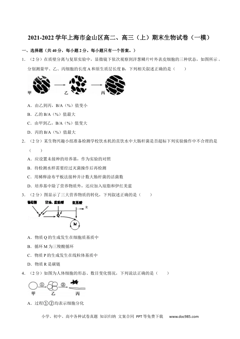 小学、初中、高中各种试卷真题知识归纳文案合同PPT等免费下载www.doc985.com2021-2022学年上海市金山区高二、高三(上)期末生物试卷(一模)一、选择题(共40分,每小题2分。每小题只有一个答案。)1.(2分)在质壁分离与复原实验中,显微镜下依次观察到洋葱鳞片叶外表皮细胞的三种状态,如图所示。分别测量甲、乙、丙细胞的长度A和原生质层长度B,下列相关叙述正确的是()A.由乙到丙,B/A(%)值变小B.乙的B/A(%)值最大C.由甲到乙,B/A(%)值变大D.丙的B/A(%)值最大2.(2分)某生物兴趣小组准备检测学校饮水机的直饮水中大肠杆菌是否超标下列实验操作中不合理的是()A.应设置未接种的培养基,作为实验的对照B.待检测水样需要经过灭菌操作后再检测C.用稀释涂布平板法接种并计数大肠杆菌的活菌数D.培养基中除了营养物质外,还应加入琼脂和伊红美蓝3.(2分)图显示了三大营养物质的转化,下列叙述正确的是()A.物质Q的生成发生在细胞质基质中B.循环M为三羧酸循环C.物质P的生成发生在线粒体基质中D.物质R是碳链4.(2分)如图为人体细胞的形态、数目变化情况,下列说法正确的是()A.过程①②均表示细胞分化小学、初中、高中各种试卷真题知识归纳文案合同PPT等免费下载www.doc985.comB.过程①②中遗传物质均发生了改变C.过程②中不可能出现染色体的复制D.过程②中细胞全能性的大小不变5.(2分)检测斑马鱼在静止时及相同强度运动后肌肉中乳酸含量,结果如图。下列叙述正确的是()A.对照组在运动中斑马鱼的耗能明显增大B.运动训练对斑马鱼的产能机理没有影响C.运动训练可降低无氧呼吸在运动中的供能比例D.运动训练可降低斑马鱼静止时的无氧呼吸强度6.(2分)用32P标记噬菌体的DNA,用35S标记噬菌体的蛋白质,用这种噬菌体去侵染不含32P和35S的大肠杆菌,则若干代后的子代噬菌体中()A.不可能检测到32PB.可以检测到35SC.可能检测到32P和35SD.大部分检测不到32P7.(2分)如图是甲、乙两种细胞的细胞周期示意图(h表示小时),下列关于这两种细胞的叙述,正确的是()A.c→c为一个细胞周期B.两种细胞S期的时长不同C.甲细胞比乙细胞分裂慢D.两种细胞分裂期时长占比不同小学、初中、高中各种试卷真题知识归纳文案合同PPT等免费下载www.doc985.com8.(2分)使用显微镜目镜测微尺在低倍镜10×下测量变形虫,测得虫体长占10格,转换高倍镜40×后虫体所占格数为()A.5格B.10格C.20格D.40格9.(2分)滥用抗生素是产生“超级细菌”(对绝大多数抗生素具耐药性的细菌)的重要原因。下列叙述正确的是()A.抗生素诱导细菌产生抗药性突变B.抗生素对突变细菌进行了不定向选择C.原来的细菌种群中少数个体有抗药性基因D.长期滥用抗生素后,细菌基因频率发生改变从而出现新物种10.(2分)某同学利用选择培养基成功分离出了土壤中的自生固氮菌,得到了如图所示的实验结果,以下说法正确的是()A.该实验使用了划线法接种B.该实验使用了液体培养基C.该实验使用了无碳培养基D.该实验使用了无氮培养基11.(2分)食用被诺如病毒(NV)污染的食物会导致呕吐与腹泻,人体胃酸能杀死部分NV属于()A.特异性免疫B.天然免疫C.非特异性免疫D.人工免疫12.(2分)急性早幼粒细胞白血病是最凶险的一种白血病,发病机理如图所示,其中字母代表位于常染色体上的基因。导致该病发生的原因是()A.基因突变B.易位C.倒位D.交叉互换13.(2分)根据所学知识,对图中d、e两点生长素浓度的分析合理的是()小学、初中、高中各种试卷真题知识归纳文案合同PPT等免费下载www.doc985.comA.若d点对应的浓度为a,则e点对应c点的浓度B.若d点对应的浓度为b,则e点对应c点的浓度C.若d点对应的浓度为a,则e点对应b点的浓度D.若d点对应的浓度为c,则e点对应a点的浓度14.(2分)植物A的两对相对性状分别为黄色对白色为显性,饱满对皱缩为显性,现有黄色饱满植株(基因型为AaBb)与一隐性纯合子杂交,得到如下表的后代。根据这一结果,可以得出的结论是()表现型黄色饱满黄色皱缩白色饱满白色皱缩数目145341350151A.A、B基因连锁,两者遵循基因的完全连锁B.A...