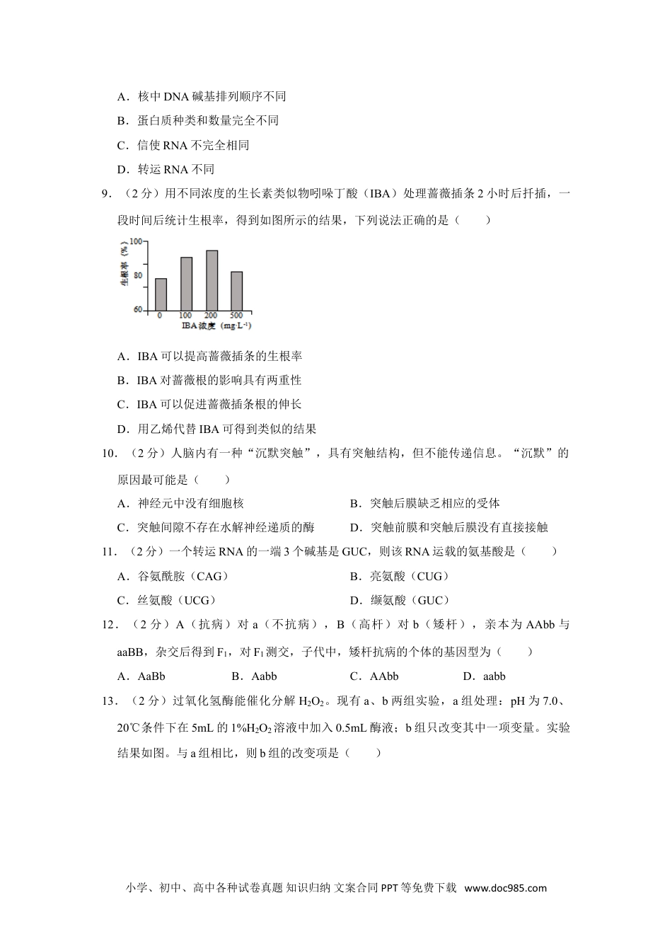 2020-2021学年上海市黄浦区高二、高三(上)期末生物试卷(一模)一、选择题(共40分,每小题2分。每小题只有一个正确选项。)1.(2分)某同学的体检报告显示,她的血红蛋白含量偏低,这可能是因为她体内缺乏()A.I+B.Fe2+C.Na+D.Ca2+2.(2分)如图是某种细胞器的电镜照片,该细胞器()A.能消化进入细胞内的异物B.能提供代谢所需能量C.能参与蛋白质的合成D.存在于动植物细胞中3.(2分)如图表示某化合物内的部分结构,则含此结构的化合物很可能是()A.ATPB.抗体C.DNAD.磷脂4.(2分)生殖是物种得以延续的重要保证。下列属于有性生殖的是()A.酵母菌的出芽生殖B.未受精的卵发育成雄峰C.培养胡萝卜韧皮部细胞获得植株D.涡虫等低等动物的再生现象5.(2分)如图是低倍镜下蚕豆叶下表皮保卫细胞长度测量的局部视野。下列叙述正确的是()小学、初中、高中各种试卷真题知识归纳文案合同PPT等免费下载www.doc985.comA.换高倍镜可使图示保卫细胞移至视野中央B.换高倍镜后应调节粗调节器使物像清晰C.换高倍镜后目镜测微尺每小格代表的长度增加D.换高倍镜后图示保卫细胞所占的格数增加6.(2分)下列能正确表示脂蛋白结构的是()A.B.C.D.7.(2分)下列有关实验操作或实验结果的描述,正确的是()A.探究酵母菌的呼吸方式不可以用是否产生二氧化碳来确定B.组织样液中滴加双缩脲试剂显示蓝色说明成分中含有蛋白质C.用无水酒精可以提取分离叶绿体色素D.在观察牛蛙的脊髓反射现象实验中,环割脚趾皮肤的目的是破坏效应器8.(2分)如图所示为来自同一人体的两种细胞,造成这两种细胞结构和功能不同的原因是()小学、初中、高中各种试卷真题知识归纳文案合同PPT等免费下载www.doc985.comA.核中DNA碱基排列顺序不同B.蛋白质种类和数量完全不同C.信使RNA不完全相同D.转运RNA不同9.(2分)用不同浓度的生长素类似物吲哚丁酸(IBA)处理蔷薇插条2小时后扦插,一段时间后统计生根率,得到如图所示的结果,下列说法正确的是()A.IBA可以提高蔷薇插条的生根率B.IBA对蔷薇根的影响具有两重性C.IBA可以促进蔷薇插条根的伸长D.用乙烯代替IBA可得到类似的结果10.(2分)人脑内有一种“沉默突触”,具有突触结构,但不能传递信息。“沉默”的原因最可能是()A.神经元中没有细胞核B.突触后膜缺乏相应的受体C.突触间隙不存在水解神经递质的酶D.突触前膜和突触后膜没有直接接触11.(2分)一个转运RNA的一端3个碱基是GUC,则该RNA运载的氨基酸是()A.谷氨酰胺(CAG)B.亮氨酸(CUG)C.丝氨酸(UCG)D.缬氨酸(GUC)12.(2分)A(抗病)对a(不抗病),B(高杆)对b(矮杆),亲本为AAbb与aaBB,杂交后得到F1,对F1测交,子代中,矮杆抗病的个体的基因型为()A.AaBbB.AabbC.AAbbD.aabb13.(2分)过氧化氢酶能催化分解H2O2。现有a、b两组实验,a组处理:pH为7.0、20℃条件下在5mL的1%H2O2溶液中加入0.5mL酶液;b组只改变其中一项变量。实验结果如图。与a组相比,则b组的改变项是()小学、初中、高中各种试卷真题知识归纳文案合同PPT等免费下载www.doc985.comA.酶液中酶的浓度B.H2O2溶液的浓度C.反应过程的温度D.反应过程的pH14.(2分)正常情况下,在人的初级卵母细胞经减数分裂形成卵的过程中,一个细胞中含有的X染色体条数最多为()A.1B.2C.3D.415.(2分)如表是某中年男子血液化验单中的部分数据,据所学知识判断下列表述正确的是()项目测定值单位参考范围促甲状腺激素5.9μU/mL1.4~4.4A.该男子可能甲状腺功能亢进B.该男子可能胰岛功能亢进C.该男子可能甲状腺功能减退D.该男子可能垂体功能减退16.(2分)如图为人体某细胞内发生的部分代谢途径,下列表述正确的是()A.①所示的反应类型为氧化分解反应B.该细胞膜上有胰高血糖素受体,但无肾上腺素受体C.脂肪酸需转化为丙酮酸后,才能进入三羧酸循环D.胰高血糖素作用于该细胞后能促进①过程17.(2分)如图表示人体发热到降温的体温变化曲线,导致ab段和cd段体温变化的事件小学、初中、高中各种试卷真题知识归纳文案合同PPT等免费下载www.doc985.com分别是()A.血...