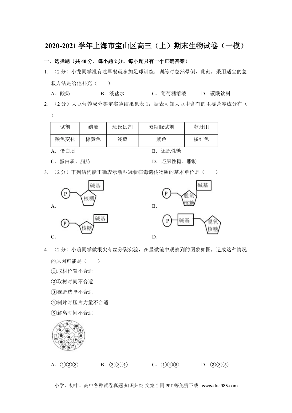 2020-2021学年上海市宝山区高三(上)期末生物试卷(一模)一、选择题(共40分,每小题2分。每小题只有一个正确答案)1.(2分)小龙同学没有吃早餐就参加足球训练,训练时忽然晕倒,此刻,采用适宜的急救方法是给他补充()A.酸奶B.淡盐水C.葡萄糖溶液D.碳酸饮料2.(2分)大豆营养成分鉴定实验结果见表1,据表可知大豆中含有的主要营养成分有()试剂碘液班氏试剂双缩脲试剂苏丹Ⅲ颜色变化棕黄色浅蓝紫色橘红色A.蛋白质B.还原性糖C.蛋白质、脂肪D.还原性糖、脂肪3.(2分)下列结构能正确表示新型冠状病毒遗传物质的基本单位是()A.B.C.D.4.(2分)小萌同学做根尖有丝分裂实验,在显微镜中观察到的图象如图,造成这种情况的原因可能是()①取材位置不合适②取材时间不合适③视野选择不合适④制片时压片力量不合适⑤解离时间不合适A.①②③B.②③④C.①④⑤D.②③⑤小学、初中、高中各种试卷真题知识归纳文案合同PPT等免费下载www.doc985.com5.(2分)如图为小萌对玉米胚芽鞘所做的部分实验,实验说明()A.生长素促进幼苗尖端下部背光侧生长,抑制向光侧生长B.胚芽鞘直立或弯曲生长均与单侧光照射有关C.玉米各器官对生长素的灵敏度不同D.感受单侧光的部位是胚芽鞘顶端6.(2分)如图是浆细胞形成抗体的亚显微结构示意图,下列叙述正确的是()A.①中合成⑦B.④能形成细胞壁C.⑤能吞噬病原体D.⑧产生氧气同时释放能量7.(2分)菜农切割如图姜块中完整的芽来繁殖大姜,这属于()A.孢子生殖B.营养繁殖C.出芽生殖D.有性生殖8.(2分)如图中,甲图表示处于细胞分裂某时期的细胞图象,乙图表示细胞分裂的不同时期与每条染色体DNA含量变化的关系。甲图细胞处于图乙中的()小学、初中、高中各种试卷真题知识归纳文案合同PPT等免费下载www.doc985.comA.AB段B.BC段C.CD段D.DE段9.(2分)如图是反射弧五个组成部分关系示意图,司机看到红灯刹车与其反射弧组成对应关系正确的是()A.①为眼角膜B.②是视神经C.③是下丘脑D.④是手臂肌肉10.(2分)如图是狗精巢细胞内两条染色体的变化过程示意图,字母和数字代表基因。此变化过程属于()A.染色体倒位B.基因突变C.染色体重复D.染色体易位11.(2分)一次性过量饮水会造成人体细胞肿胀,功能受损,可用静脉滴注高浓度盐水(质量分数为1.8%的NaCl溶液)对患者进行治疗,其原理是()A.提高细胞外液的离子浓度B.抑制尿液的形成C.降低细胞内液的离子浓度D.减少细胞外液液体总量12.(2分)细胞呼吸原理已被广泛应用于生产实践。如表有关措施中,错误的是()小学、初中、高中各种试卷真题知识归纳文案合同PPT等免费下载www.doc985.com选项应用措施目的A种子贮存晒干降低自由水含量,降低细胞呼吸B乳酸菌制作酸奶先通气,后密封加快乳酸菌繁殖,有利于乳酸发酵C水果保鲜低温降低酶的活性,降低细胞呼吸D栽种庄稼疏松土壤促进根有氧呼吸,利于吸收矿质离子A.AB.BC.CD.D13.(2分)如图是结核杆菌进入人体,免疫细胞之间相互作用的部分模式图,下列相关叙述正确的是()A.细胞A是致敏T细胞B.细胞B可能是巨噬细胞C.细胞C可能是记忆B淋巴细胞D.细胞D能特异性识别或杀死病菌14.(2分)搬运工从25℃的室外进入﹣2℃仓库清理物品,其体内甲状腺激素含量及酶活性的变化情况依次为()A.升高、降低B.降低、升高C.升高、不变D.降低、不变15.(2分)如图为小萌根据细胞融合技术的方法,设计生产破伤风杆菌抗体的实验操作过程。下列表述不正确的是()A.①从脾脏收集B淋巴细胞B.②促进两两细胞的融合C.③促进细胞分化为杂交瘤细胞小学、初中、高中各种试卷真题知识归纳文案合同PPT等免费下载www.doc985.comD.④筛选产生抗体的杂交瘤细胞16.(2分)利用枯草芽孢杆菌制备蛋白酶,以下符合该酶分离纯化的正确流程是()①改变pH使酶沉淀②发酵液过滤③冷冻干燥④层析法提纯蛋白酶A.③①④②B.②①④③C.③④②①D.②④①③17.(2分)如图所示为动物初级精母细胞中的两对同源染色体,其减数分裂过程中,同源染色体发生交叉互换形成了如图所示的四个精子,则来自同一个次级精母细胞的...