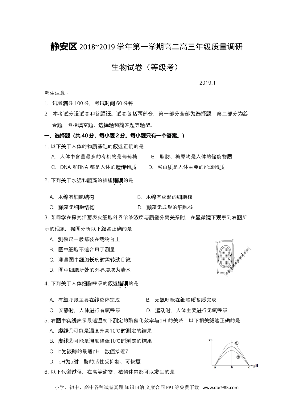 静安区2018~2019学年第一学期高二高三年级质量调研生物试卷(等级考)2019.1考生注意:1.卷分试满100分,考试时间60分。钟2.本考分卷和答。卷包括部分,第一部分全部,第二部分试设试题纸试两为选择题为综合,包括空、和答等型。题填题选择题简题题一、选择题(共40分,每小题2分。每小题只有一个答案。)1.以下于人体的物基的述正确的是关质础叙A.人体中含量最多的有机物是葡萄糖B.脂肪、糖原均是人体的能物储质C.DNA和RNA都是人体的物遗传质D.蛋白是人体主要的能源物质质2.下列于水和藻的描述关绵颤错误的是A.水有胞绵细结构B.水有成形的胞核绵细C.藻无胞颤细结构D.藻无成形的胞核颤细3.某同在探究洋葱表皮胞外界溶液度壁分离系,在微下察到右所学细浓与质关时显镜观图示的象,据分析以下述正确的是现图叙A.微尺一般都装在物台上测载B.中胞不适合用于量图细测C.量中胞度需目测图细长时转动镜D.中胞所的外界溶液水图细处为清4.下列于人体胞呼吸的述关细叙错误的是A.有呼吸主要在粒体完成氧线B.无呼吸在胞基完成氧细质质C.安,人体行有呼吸静时进氧D.,人体主要行无呼吸运动时进氧5.右中表示最适度下定的酶催化效率图实线温测与pH的系,以下相述正确的是关关叙A.①可能是度升高虚线温10℃定的果时测结B.②可能是度降低虚线温10℃定的果时测结C.b酶的最适为该pH,接近数值7D.pH为a,酶的活性受抑制、可恢时复6.以下代程,在高等物、植物体都可以生的是谢过动内发小学、初中、高中各种试卷真题知识归纳文案合同PPT等免费下载www.doc985.comA.葡萄糖→糖原B.葡萄糖→淀粉C.葡萄糖→脂肪D.葡萄糖→素纤维7.B淋巴胞一般不分裂,但在受到抗原刺激后可增殖分化,上述事明细实说B淋巴胞细为A.增殖胞细B.不增殖胞暂细C.不增殖胞细D.全能干胞细8.如所示酵母菌的生殖方式图为A.分裂生殖B.出芽生殖C.子生殖孢D.繁殖营养9.右是图ATP示意,下列于的述正确的是结构图关该图叙A.①表示腺苷B.②表示ADPC.③表示高能磷酸键D.③比④更容易裂断10.如是正在信息的突部分模式,以下法正确的图传递触结构图说是A.①表示突后膜触B.③表示神经递质C.④表示离子通道D.信息由②至①传11.燕胚芽鞘能表出明的向光性,以下于向光性的解正确的是麦现显关释A.生素由向光往背光,促背光胞伸长侧侧运输进侧细长B.生素由背光往向光,抑制向光胞伸长侧侧运输侧细长C.生素在背光合成量大,促背光胞伸长侧进侧细长D.生素在向光合成量大,抑制向光胞伸长侧侧细长12.某小用右所示卡片搭建组图DNA分子模型,其中“P”有30,“个C”有10,以下法正个说确的是A.“D”表示核糖B.“T”表示尿嘧啶C.若要充分利用“P”和“C”,需60“个D”D.若要充分利用“P”和“C”,需5“个A”13.如表示生在胞中的信息的、表相的生理程,下列法正确的图发细与遗传传递达关过说是小学、初中、高中各种试卷真题知识归纳文案合同PPT等免费下载www.doc985.comA.①表示转录B.②表示翻译C.①生在胞核发细D.②生在胞发细质14.自同一体的神胞和肝胞有多差,以下于者的描述来个经细细诸异关两错误的是A.DNA不完全相同B.RNA不完全相同C.蛋白不完全相同质D.糖不完全相同类15.如所示于有分裂某期的植物胞的照片,据判以下法正确的是图为处丝时细电镜图断说A.胞中有染色体和染色体该细单B.胞已生同源染色体分离该细发C.胞中的该细DNA正在制复D.箭所指位置正在形成胞壁头细16.某同利用培基成功分离出了土壤中的自生固菌,得到了如所学选择养氮图示的果,以下法正确的是实验结说A.使用了法接该实验划线种B.使用了液体培基该实验养C.使用了无培基该实验氮养D.使用了无培基该实验碳养17.右人体卵胞的形成程示意,下列相述正确的是图为细过图关叙A.程①是第二次分裂过减数B.程②是有分裂过丝C.胞细A是初卵母胞级细D.胞细B是卵胞细18.某人从25℃的暖房到温间来0℃的外,机体可能出下列象中的户现现A.骨骼肌非自主栗颤B.汗腺分泌增加C.抗利尿激素分泌增加D.皮血管舒肤张19.如图为健康人的血糖变化情况,此人在13时前仅进食过早餐,以下分析正确的是A.a点,时胰高血糖素分泌增加B.b点,...
