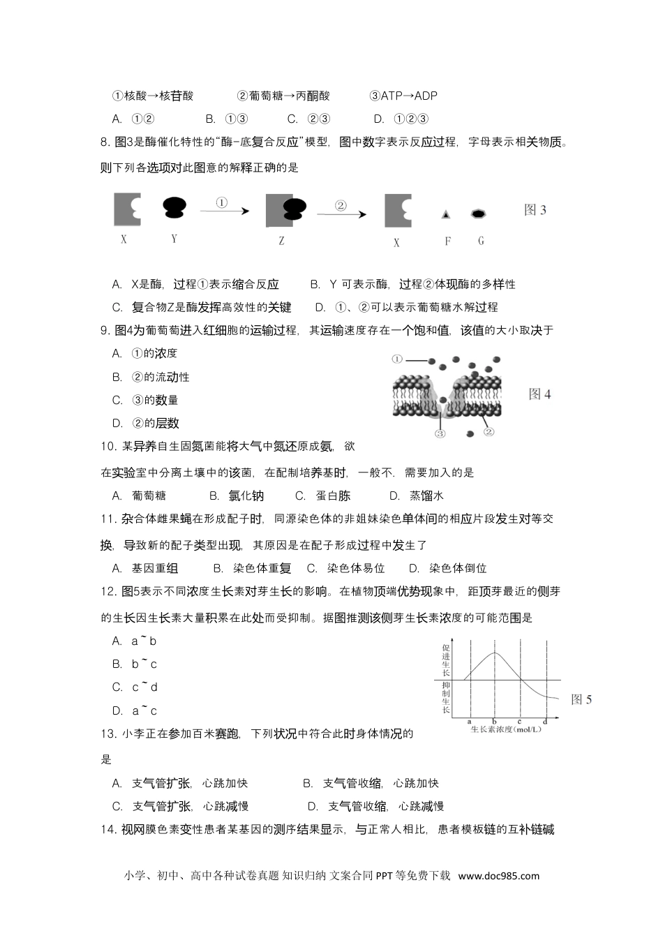 黄浦区2018~2019学年第一学期高二高三年级质量调研生物试卷(等级考)2018.12考生注意:1.卷分试满100分,考试时间60分。钟2.本考分卷和答。卷包括部分,第一部分全部,第二部分试设试题纸试两为选择题为综合,包括空、和答等型。题填题选择题简题题一、选择题(共40分,每小题2分。每小题只有一个答案。)1.原核胞和核胞都有的胞是细真细细结构A.核膜B.核糖体C.粒体线D.内质网2.胞基酸水合形成多化合物,细内氨脱缩肽图1式于几化合物结构属肽A.二肽B.三肽C.四肽D.五肽3.用范操作某未知品的成分行定,所用和溶液规对样进鉴试剂呈色的果如表结1所示,品是该样A.可溶性淀粉溶液B.葡萄糖溶液C.蛋溶液鸡清D.植物油4.使用微目微尺在低倍显镜镜测镜10×下量形虫,得虫体占测变测长10格,高倍转换镜40×后虫体所占格数为A.5格B.10格C.20格D.40格5.幸福老叶的叶脉缺是因叶素合成受影致的。如果要解,幸福树绿为绿响导决这个问题给施加的液中富含树营养应A.Mg2+B.Na+C.Ca2+D.Cl-6.图2某物胞周期中各期,胞分裂期为动细时长该细间时长为A.1hB.4hC.12hD.21h7.下列化反于水解反的是学应属应小学、初中、高中各种试卷真题知识归纳文案合同PPT等免费下载www.doc985.com试剂果结双缩脲试剂紫色丹苏III染液棕色红班氏试剂色蓝表1①核酸→核酸苷②葡萄糖→丙酸酮③ATP→ADPA.①②B.①③C.②③D.①②③8.图3是酶催化特性的“酶-底合反”模型,中字表示反程,字母表示相物复应图数应过关质。下列各此意的解正确的是则选项对图释A.X是酶,程①表示合反过缩应B.Y可表示酶,程②体酶的多性过现样C.合物复Z是酶高效性的发挥关键D.①、②可以表示葡萄糖水解程过9.图4葡萄萄入胞的程,其速度存在一和,的大小取于为进红细运输过运输个饱值该值决A.①的度浓B.②的流性动C.③的量数D.②的层数10.某自生固菌能大中原成,欲异养氮将气氮还氨在室中分离土壤中的菌,在配制培基,一般不.需要加入的是实验该养时A.葡萄糖B.化氯钠C.蛋白胨D.蒸水馏11.合体雌果在形成配子,同源染色体的非姐妹染色体的相片段生等交杂蝇时单间应发对,致新的配子型出,其原因是在配子形成程中生换导类现过发了A.基因重组B.染色体重复C.染色体易位D.染色体倒位12.图5表示不同度生素浓长对芽生的影。在植物长响端顶优势现象中,距芽最近顶的芽侧的生因生素大量长长累积在此而处受抑制。据图推测该芽侧生素度的可能范长浓围是A.a~bB.b~cC.c~dD.a~c13.小李正在参加百米赛跑,下列状况中符合此时身体情况的是A.支气管扩张,心跳加快B.支气管收,缩心跳加快C.支气管扩张,心跳慢减D.支气管收,缩心跳慢减14.视膜色素性网变患者某基因的测序果示,结显与正常人相比,患者模板链的互补链碱小学、初中、高中各种试卷真题知识归纳文案合同PPT等免费下载www.doc985.com基生发改。变据可图推测患者模板上链生的发碱基改是变。。GTGGCCCCGGCCTAA。。。。。GTGGCCCTGGCCTAA。。。正常人测序果结患者测序果结A.G→CB.U→TC.G→AD.C→T15.图6某为雄性物胞一同源染色体动细内对及其上的等位基因,下列法说错误的是A.此胞细为初精级母胞细B.来自父方的染色体单与来自母方的染色体单之生间发了交叉互换C.中含有图8条脱氧核酸苷链D.A与a的分离仅生在发减数第一次分裂16.图7表示人体内主要能源物质X氧化分解的部分途径,其中X、Y、M、N代表物。下列质述叙正确的是A.X是丙酸,在胞基中形成酮细质质B.Y是二碳化合物,在粒体基中形成线质C.M是乳酸和CO2,在胞基中形成细质质D.N是H2O,在粒体膜线内上形成17.人体骨髓中存在少量间充质干胞细(MSC),图8为MSC形成多种组织胞的示意,细图下列述叙正确的是A.组织胞中的细DNA和RNA与MSC中的相同B.MSC不增殖断分化,于属全能干胞细C.程①②是过指MSC的分化程过D.不同诱因素使导MSC分化形成不同型的胞类细18.西版双纳热带植物园中林下(封)闭生境的蝴蝶体色显著深于开阔生境的蝴蝶。通“过蝴蝶”,实验发现封闭生境里深色翅膀蝴蝶被捕食率显著低于亮色翅膀蝴蝶。这种现象体现了A.物种是生物化的基进本单位B.自然选主择导着化的进方向C.定向...