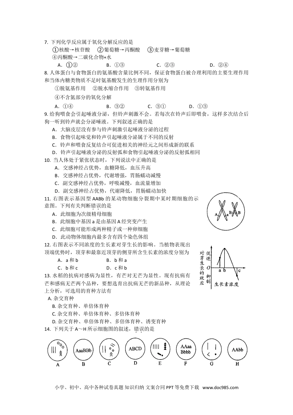杨浦区2016~2017学年度等级考第一次质量调研生命科学试卷2016.12考生注意:1.试卷满分100分,考试时间60分钟。2.本考试分设试卷和答题纸。试卷包括两部分,第一部分全部为选择题,第二部分为综合题,包括填空题、选择题和简答题等题型。3.考生应用2B铅笔、钢笔或圆珠笔将答案直接写在答题纸上。一,单选题(共40分。每小题只有一个正确选项)1.构成细胞内生命物质的主要有机成分是A.蛋白质和核酸B.糖类和蛋白质C.蛋白质和脂质D.糖类和核酸2.如图是细胞发生的一系列变化过程,有关分析正确的是A.过程①表示细胞生长B.过程②表示细胞分化C.过程②染色体数会减半D.过程③表示细胞分裂3.在电子显微镜下,颤藻和水稻叶肉细胞中都能被观察到的结构是A.叶绿体和液泡B.内质网和核糖体C.核糖体和细胞膜D.细胞核和线粒体4.将紫色洋葱表皮细胞置于30%的蔗糖溶液中,光镜下所能看到的现象是①区域1扩大②区域1缩小③区域2紫色变浅④区域2紫色加深⑤原生质层与细胞壁逐渐分离⑥细胞膜、液泡膜结构清晰A.①③⑤B.①④⑤C.②④⑤D.①④⑥5.下列关于测量蚕豆叶下表皮保卫细胞长度的实验操作,正确的是A.要使视野的右下方物像移到视野中央,须将装片移向左上方B.从低倍镜转到高倍镜时,轻轻地转动物镜使高倍镜到位C.高倍镜放大了观察视野,增大了放大倍数D.测量细胞长度时,应尽量使目镜测微尺与被测细胞平行并重叠6.剧烈运动时人体骨骼肌细胞进行呼吸作用,下列叙述中,错误的是A.人剧烈运动时骨骼肌能同时产生乳酸和CO2B.该细胞有氧呼吸产物与酵母菌有氧呼吸的产物相同C.会使溴代麝香草酚蓝水溶液的颜色发生蓝→绿→黄的变化D.该细胞呼吸产物与乳酸菌细胞呼吸的产物相同小学、初中、高中各种试卷真题知识归纳文案合同PPT等免费下载www.doc985.com127.下列化学反应属于氧化分解反应的是①核酸→核苷酸②葡萄糖→丙酮酸③麦芽糖→葡萄糖④丙酮酸→二碳化合物+水A.①②B.①③C.②③D.②④8.人体蛋白与食物蛋白的氨基酸含量比例不同,保证食物蛋白被合理利用的主要生理作用和当体内糖类物质不足时氨基酸发生的生理作用分别为①脱氨基作用②脱水缩合作用③转氨基作用④不含氮部分的氧化分解A.①④B.③②C.③①D.①③9.给狗喂食会引起唾液分泌,但铃声刺激不会。若每次在铃声后即喂食,这样多次结合后狗一听到铃声就会分泌唾液。下列叙述正确的是A.大脑皮层没有参与铃声刺激引起唾液分泌的过程B.食物引起味觉和铃声引起唾液分泌属于不同的反射C.铃声和喂食反复结合可促进相关的神经元之间形成新的联系D.铃声引起唾液分泌的反射弧和食物引起唾液分泌的反射弧相同10.当人体处于紧张状态时,下列说法中正确的是A.交感神经占优势,血糖降低,血压升高B.交感神经占优势,代谢增强,胃肠蠕动减慢C.副交感神经占优势,呼吸减慢,血流量增加D.副交感神经占优势,代谢降低,胃肠蠕动加快11.右图表示基因型AABb的某动物细胞分裂期中某时期细胞的示意图。下列有关判断错误的是A.此细胞为次级精母细胞B.此细胞中基因a是由基因A经突变产生C.此细胞可能形成两种精子或一种卵细胞D.此动物体细胞内最多含有四个染色体组12.右图表示不同浓度的生长素对芽生长的影响。当植物表现出顶端优势时,顶芽和最靠近顶芽的侧芽所含生长素的浓度分别为A.a和bB.b和aC.b和cD.c和b13.水稻的抗病对感病为显性,有芒对无芒为显性。现有抗病有芒和感病无芒两个品种,要想选育出抗病无芒的新品种,从理论上分析,可选用的育种方法有A.杂交育种B.杂交育种、单倍体育种C.杂交育种、单倍体育种、多倍体育种D.杂交育种、单倍体育种、多倍体育种、诱变育种14.下列关于A~H所示细胞图的叙述,错误的是小学、初中、高中各种试卷真题知识归纳文案合同PPT等免费下载www.doc985.com①只有G细胞中含有一个染色体组②只有C、H细胞中含有两个染色体组③只有A细胞中含有三个染色体组④只有E、F细胞中含有四个染色体组A.①②B.①③C.②③D.②④15.人的肤色正常(A)与白化(a)基因位于常染色体上,色觉正常(B)与红绿色盲(b)基因位于X染色体上。一对表现正常的夫妇(但这对夫妇的父亲均是色盲患...