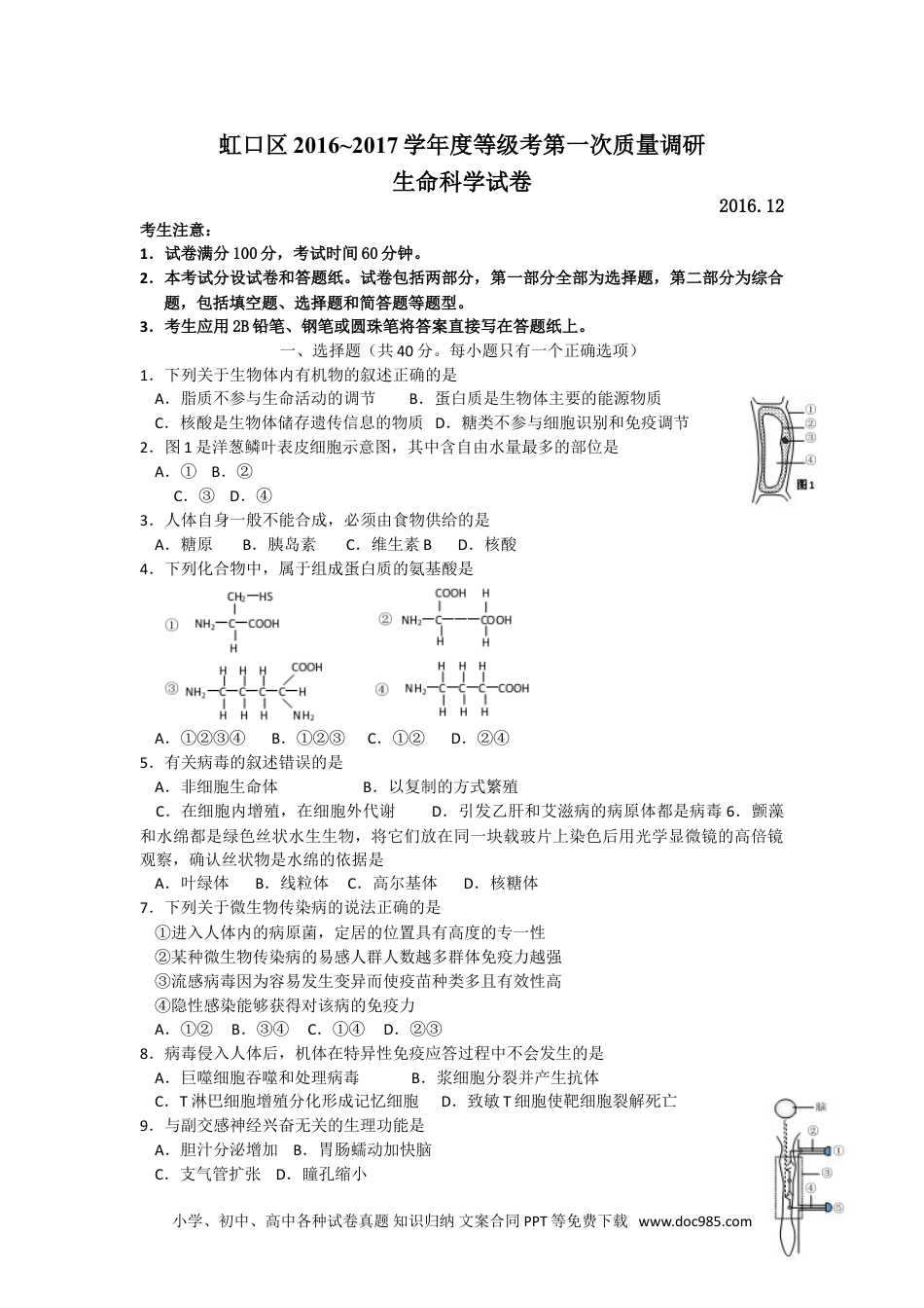 虹口区2016~2017学年度等级考第一次质量调研生命科学试卷2016.12考生注意:1.试卷满分100分,考试时间60分钟。2.本考试分设试卷和答题纸。试卷包括两部分,第一部分全部为选择题,第二部分为综合题,包括填空题、选择题和简答题等题型。3.考生应用2B铅笔、钢笔或圆珠笔将答案直接写在答题纸上。一、选择题(共40分。每小题只有一个正确选项)1.下列关于生物体内有机物的叙述正确的是A.脂质不参与生命活动的调节B.蛋白质是生物体主要的能源物质C.核酸是生物体储存遗传信息的物质D.糖类不参与细胞识别和免疫调节2.图1是洋葱鳞叶表皮细胞示意图,其中含自由水量最多的部位是A.①B.②C.③D.④3.人体自身一般不能合成,必须由食物供给的是A.糖原B.胰岛素C.维生素BD.核酸4.下列化合物中,属于组成蛋白质的氨基酸是A.①②③④B.①②③C.①②D.②④5.有关病毒的叙述错误的是A.非细胞生命体B.以复制的方式繁殖C.在细胞内增殖,在细胞外代谢D.引发乙肝和艾滋病的病原体都是病毒6.颤藻和水绵都是绿色丝状水生生物,将它们放在同一块载玻片上染色后用光学显微镜的高倍镜观察,确认丝状物是水绵的依据是A.叶绿体B.线粒体C.高尔基体D.核糖体7.下列关于微生物传染病的说法正确的是①进入人体内的病原菌,定居的位置具有高度的专一性②某种微生物传染病的易感人群人数越多群体免疫力越强③流感病毒因为容易发生变异而使疫苗种类多且有效性高④隐性感染能够获得对该病的免疫力A.①②B.③④C.①④D.②③8.病毒侵入人体后,机体在特异性免疫应答过程中不会发生的是A.巨噬细胞吞噬和处理病毒B.浆细胞分裂并产生抗体C.T淋巴细胞增殖分化形成记忆细胞D.致敏T细胞使靶细胞裂解死亡9.与副交感神经兴奋无关的生理功能是A.胆汁分泌增加B.胃肠蠕动加快脑C.支气管扩张D.瞳孔缩小小学、初中、高中各种试卷真题知识归纳文案合同PPT等免费下载www.doc985.com10.在牛蛙的脊髓反射实验中,剥除脊蛙右后肢脚趾皮肤,再将其浸入0.5%HCl中,结果无屈腿反射,原因是破坏了图2中结构A.①图2B.②C.③D.④11.图3中字母表示细胞中所含的基因,每个基因不在同一条染色体上,X、Y、Z中含4个染色体组的是A.XB.X、YC.YD.Z12.图4为人的性染色体简图。X和Y染色体有一部分是同源的(图中Ⅰ片段),该部分基因互为等位基因;另一部分是非同源的(图中的Ⅱ-1,Ⅱ-2片段),该部分基因不互为等位基因。人类的血友病基因所处的片段是A.ⅠB.Ⅱ-1C.Ⅱ-2D.Ⅱ-1和Ⅱ-213.家蚕的黄茧和白茧这对性状是由位于两对同源染色体上的两对等位基因控制。控制黄茧的基因是Y,白茧的基因是y,另外一对基因是I和i,有I存在时,可以抑制黄茧基因Y的作用而结白茧。如有两个基因型分别是iiYY和IIyy的家蚕进行杂交获得F1,F1测交后代黄茧与白茧的比例是A.1:3B.3:1C.1:1D.2:114.图5表示人体发热到降温的体温变化曲线,导致ab段和cd段体温变化的事件最有可能分别是A.血管舒张和血管收缩B.添加衣服和减少穿着C.立毛肌舒张和立毛肌收缩D.寒战和出汗15.寒冷刺激可使下丘脑体温调节中枢兴奋,还可使A.副交感神经兴奋B.肾上腺皮质释放肾上腺素C.垂体分泌促甲状腺素释放激素D.甲状腺活动增强16.高动脉血压会引起机体的降压反射。下列有关降压反射的叙述正确的是A.降压反射属于条件反射B.交感神经兴奋性加强C.心输出量增加,血压降低D.依靠负反馈调节使血压稳定17.烧伤、过敏等情况下,毛细血管壁的通透性会异常增高,此时不可能发生A.血浆蛋白随液体渗出毛细血管B.细胞间隙液减少C.血浆渗透压下降D.淋巴液增多18.图6是四种脂蛋白的密度与形态对比图,图中Ⅰ、Ⅱ、Ⅲ、Ⅳ分别是A.CM、VLDL、LDL、HDLB.HDL、LDL、VLDL、CMC.HDL、VLDL、LDL、CMD.CM、LDL、VLDL、HDL小学、初中、高中各种试卷真题知识归纳文案合同PPT等免费下载www.doc985.com19.图7是正常人平卧位时不同血管血压的示意图,下列有关叙述,错误的是A.各段血管的血压并不相同B.血压的降低受血管总截面积影响C.体循环中的微动脉段的血流阻力最大D.用血压计可以测出各段的血压20.影响抗利尿激素分泌...