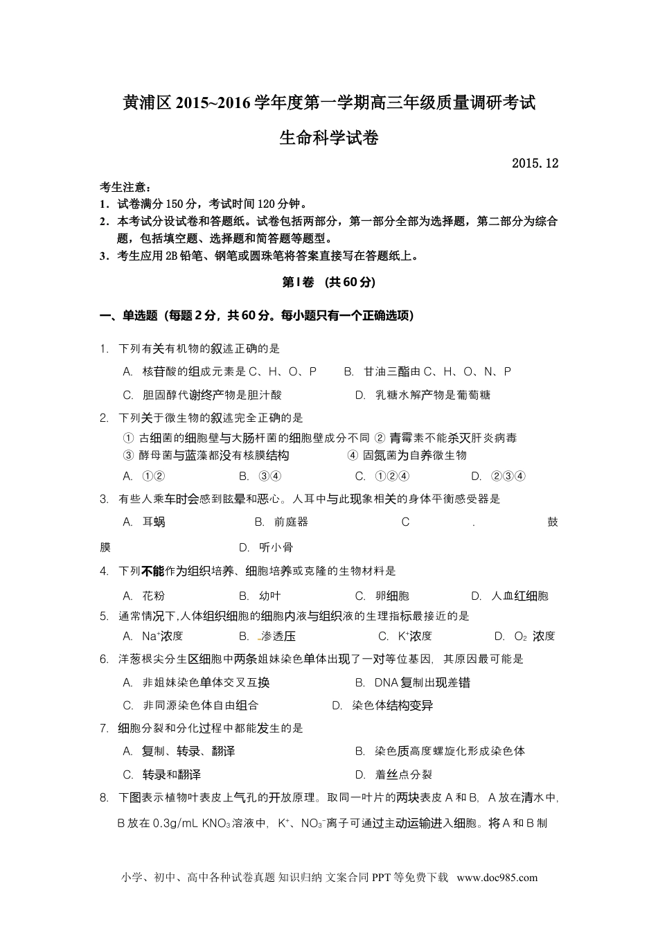黄浦区2015~2016学年度第一学期高三年级质量调研考试生命科学试卷2015.12考生注意:1.试卷满分150分,考试时间120分钟。2.本考试分设试卷和答题纸。试卷包括两部分,第一部分全部为选择题,第二部分为综合题,包括填空题、选择题和简答题等题型。3.考生应用2B铅笔、钢笔或圆珠笔将答案直接写在答题纸上。第I卷(共60分)一、单选题(每题2分,共60分。每小题只有一个正确选项)1.下列有有机物的述正确的是关叙A.核酸的成元素是苷组C、H、O、PB.甘油三由酯C、H、O、N、PC.胆固醇代物是胆汁酸谢终产D.乳糖水解物是葡萄糖产2.下列于微生物的述完全正确的是关叙①古菌的胞壁大杆菌的胞壁成分不同②霉素不能肝炎病毒细细与肠细青杀灭③酵母菌藻都有核膜④固菌自微生物与蓝没结构氮为养A.①②B.③④C.①②④D.②③④3.有些人乘感到眩和心。人耳中此象相的身体平衡感受器是车时会晕恶与现关A.耳蜗B.前庭器C.鼓膜D.听小骨4.下列不能作培、胞培或克隆的生物材料是为组织养细养A.花粉B.幼叶C.卵胞细D.人血胞红细5.通常情下况,人体胞的胞液液的生理指最接近的是组织细细内与组织标A.Na+度浓B.渗透压C.K+度浓D.O2度浓6.洋葱根尖分生胞中姐妹染色体出了一等位基因,其原因最可能是区细两条单现对A.非姐妹染色体交叉互单换B.DNA制出差复现错C.非同源染色体自由合组D.染色体结构变异7.胞分裂和分化程中都能生的是细过发A.制、、翻复转录译B.染色高度螺旋化形成染色体质C.和翻转录译D.着点分裂丝8.下表示植物叶表皮上孔的放原理。取同一叶片的表皮图气开两块A和B,A放在水中清,B放在0.3g/mLKNO3溶液中,K+、NO3-离子可通主入胞。过动运输进细将A和B制小学、初中、高中各种试卷真题知识归纳文案合同PPT等免费下载www.doc985.com成装片在微下持察一段,察到的表皮临时显镜续观时间观气孔情是况A.A、开启B关闭B.A、关闭B开启C.A、关闭B先后开启关闭D.A、开启B先后关闭开启9.下列生命科究程中所的技(方法)恰的是学研过选择术当A.用析法提取叶体色素纸层绿B.用18O标记CO2,明证CO2是光合作用原料C.用重捕法鼠的群密度标记调查种D.用微显镜观察染色体确基因突认变10.假目的基因有设1020基,其表物是一多,如考止密子,个碱对达产条肽链虑终码则多中这条肽链至少含有的原子氧数A.339B.340C.341D.34211.下列于生物多性的述,关样叙错误的是A.生物生物之、生物无机境的共同化致生物多性与间与环进导样B.地可以候、化水,体了生物多性的接价湿调节气净污现样间值C.基因重致多等位基因的生,而形成多性组导种产从遗传样D.就地保是生物多性最有效的保护对样护12.甲表示四不同的物在一物胞外的相度差。通乙所示的程图种质个动细内对浓异过图过来持胞外度差的物是维细内浓异质A.Na+B.CO2C.素胰岛D.K+13.右表示胞呼吸作用的程,其中①图细过~③代表有生理程生的所,甲、乙代表关过发场有的物。下列相述正确的是关质关叙A.①和②都是粒体的成部分线组B.在②和③中都能生大量的产ATPC.在②和③中所含酶的相同种类D.甲、乙分代表丙酸、别酮[H]14.下列有胞物含量比的系,正确的是关细内质值关A.胞合水细内结/自由水的比,子萌比休眠高值种发时时小学、初中、高中各种试卷真题知识归纳文案合同PPT等免费下载www.doc985.com失水吸水保卫细胞保卫细胞B.人体胞细内O2/CO2的比,粒体比胞基高值线内细质质C.神膜经纤维内K+/Na+的比,作位比息位高值动电时静电时D.适宜件下光合作用程中条过C5/C3的比,停止供值应CO2后比停止前的高15.下列于人体关生命活动调节程的述,过叙正确的是A.大量水→垂体饮放释的抗利尿激素增加→尿量增加→渗透定压稳B.炎境热环→大皮体中脑层温调节枢兴奋→散增加热→体温定稳C.饥饿→高血糖素分泌增加胰→肌糖原分解→血糖定稳D.烈剧运动→乳酸增加→体液中的某些离子冲缓→pH相值定对稳16.在胞分裂程中细过出了甲、乙现两种情况,情及其果的解正确的是则对这两种况结释①甲图分裂的果出染色体目结会现数变异②乙图分裂致基因突会导变③甲中有一同源染色体未分离图对④乙的子胞中有染色体片段重缺失的象图细复...