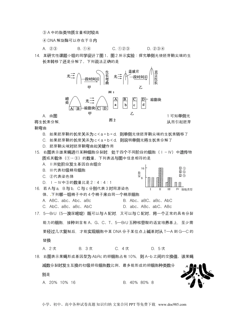 松江区2014~2015学年度第一学期高三年级质量调研考试生命科学试卷2015.1考生注意:1.试卷满分150分,考试时间120分钟。2.本考试分设试卷和答题纸。试卷包括两部分,第一部分全部为选择题,第二部分为综合题,包括填空题、选择题和简答题等题型。3.考生应用2B铅笔、钢笔或圆珠笔将答案直接写在答题纸上。一.选择题(共60分,每小题2分。每小题只有一个正确答案)1.下列藻中于原核生物的是类属A.甲藻B.衣藻C.藻颤D.硅藻2.下列有病毒的述,正确的是关叙A.植物病毒为DNA病毒,物病毒含有动既DNA又含有RNAB.病毒的衣定了病毒抗原特性壳决异C.病毒一般要在人工培基上培养养D.一病毒一般可以同感染物胞和植物胞种时动细细3.如所示:甲中①②表示目,③④表示物,⑤⑥表示物玻片之的距离图图镜镜镜与载间,乙和丙分表示不同物下察到的像。下面描述正确的是别镜观图A.①比②放大倍大,③比④放大倍小数数B.把野里的本中的乙丙,视标从图转为时应选用③,同提升筒时镜C.乙丙,正确从转为的序:器调节顺转动转换→光圈→移本→调节动标转动细器调节D.若使物像放大倍最大,甲中的合一般是②③⑤数图组4.tRNA具有基酸的功能,右转运氨图tRNA携的基酸是带氨(各括中的容相基酸的密子)选项号内为应氨码A.精酸(氨CGC)B.丙酸(氨GCG)C.甘酸(氨GGC)D.脯酸(氨CCG)5.指出下列一请哪项不是量性数状A.人的高矮B.成熟豌豆的株高C.玉米的穗长D.奶牛的泌乳量6.下列三生物象生的机理依次种学现产于属①小白鼠注射一定量的素后,小白鼠休克给胰岛②菌入人体后,机体生特性的抗体之合,而抑制菌繁殖当细进产异与结从细③小猪听到主人“”叫就奔向主人噜噜声A.体液、免疫、反射调节调节B.反射、体液免疫、激素调节C.体液、敏反、反射调节过应D.反射、自身免疫、体液调节7.相菌和植物胞而言,物胞离体培更需注培基的渗透,是因对细细动细养关养压这为动物胞细A.有胞壁,培基的渗透更敏感没细对养压B.渗透高于菌或植物胞的渗透压远细细压小学、初中、高中各种试卷真题知识归纳文案合同PPT等免费下载www.doc985.comCGCC.有成熟大液泡,渗透能力差没压调节D.生慢,各生段境的渗透要求不同长缓长阶对环压8.于人体水和无机平衡的述中,正确的是关内盐调节叙A.血渗透降低,引起口渴浆压时[源来:科学网]B.抗利尿激素使小管胞重吸收能力弱肾细减C.机体失水,抗利尿激素分泌少时减D.抗利尿激素使小管胞吸水能力增强肾细9.核胞具有一些能著增大膜面、有利于酶的附着以提高代效率的。下列真细显积谢结构不于此的是属类结构A.神胞的突经细树B.粒体的线嵴C.甲腺胞的状细内质网D.叶体的基粒绿10.右基酸和图为氨Na+出小管上皮胞的示意。下表中正确的是进肾细图选项选项管腔中基酸氨→上皮胞细管腔中Na+→上皮胞细上皮胞中细氨基酸→液组织A主动运输被动运输主动运输B被动运输被动运输被动运输C被动运输主动运输被动运输D主动运输被动运输被动运输11.获2013年尔的科家了囊泡相的基因及其表蛋白的功能,揭诺贝奖学发现与运输关达示了信如何引囊泡精确放物。突小泡于囊泡,以下相述,号导释运输触属关叙错误的是A.神元中的粒体突小泡的提供了能量经线为触运输B.神元特有的基因定了突小泡的方式经决触运输C.突前膜的特定蛋白定了神的放位置触决经递质释D.突小泡中物的放受到神冲的影触运输释经动响12.右是洋葱根尖模式,于示的相述正确的是图结构图关图关叙A.存在胞周期的主要是细区1的胞细B.DNA象主要生在转录现发区2胞中细C.区2、3胞的物生了改细遗传质发变D.区3的胞高度分化,不具胞全能性细细13.人体体液行物交的示意,其中述正确图为进质换图叙的是①A、B、C、D依次淋巴为液、血、液浆组织、胞液细内②乙胆可以存在于酰碱C中[源来:学#科#网]小学、初中、高中各种试卷真题知识归纳文案合同PPT等免费下载www.doc985.comDABC③A中的脂物含量相高类质对较④DNA解旋酶可以存在于B内A.②③B.①④C.①②③D.②③④14.某究性小的同了研课题组学设计图1、图2所示:探究光使胚芽鞘尖端的生实验单侧素移了是分解了。下列法正确的是长转还说A.由图1可知光单侧生素分...