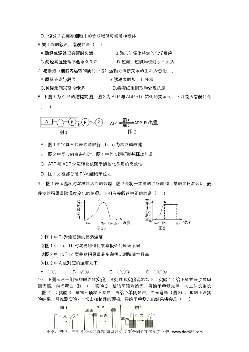 普陀区2014~2015学年度第一学期高三年级质量调研考试生命科学试卷2015.1考生注意:1.试卷满分150分,考试时间120分钟。2.本考试分设试卷和答题纸。试卷包括两部分,第一部分全部为选择题,第二部分为综合题,包括填空题、选择题和简答题等题型。3.考生应用2B铅笔、钢笔或圆珠笔将答案直接写在答题纸上。一、选择题(每小题2分,共60分)1.人在面急情,不出的象是临紧况时会现现()A.交感神性占经兴奋优势B.心跳呼吸加快,代速度增加谢C.上腺素分泌增加肾D.胃蠕加快肠动2.成年人的膳食中若缺少某生素就出相的缺乏症,如坏血病、脚病等都种维会现应气属于生素缺乏症,出些症所缺少的生素依次是()维现这状维①生素维B1②生素维C③生素维A④生素维DA.②①B.③②C.③④D.④①3.一物胞某胞器的分行分析,对动细细组进发现A、T、C、G、U五基的相含量分种碱对是别35%、0%、30%、20%、15%。胞器完成的生命活是则该细动()A.合结mRNA,合成多肽链B.加工蛋白,分泌到胞外质细C.出星射,形成体发线纺锤D.行有呼吸,生进氧产CO24.下列物的成部分中(圈中部分),相同的是(质组结构)A.Ⅰ和ⅡB.Ⅱ和ⅢC.Ⅲ和ⅣD.Ⅳ和Ⅰ5.某有机物分子的分子式链状为C22H34O13N6,其水解后共生下列产3基酸:种氨据此判,下列法的是断说错误()A.一有机分子水解需要消耗个该5水分子,生个产6基酸个氨B.分子中存在该1谷酸个氨C.分子中存在该1游离的基和个氨4游离的基个羧小学、初中、高中各种试卷真题知识归纳文案合同PPT等免费下载www.doc985.comD.分子在核胞中的合成所可能是核糖体该真细场6.于酶的述,的是(关叙错误)A.酶低理失活经温处会暂时B.酶只能催化特定的化反学应C.酶高理不永久失活经温处会D.酸、均使酶永久失活过过碱7.囊泡(胞物的小泡)无直接系的生命活是与细内运输质运输关动()A.壁分离原质与复B.素的加工和分泌胰岛C.神元的经间兴奋传递D.噬胞取和理抗原吞细摄处8.下图1为ATP的,结构简图图2为ATP与ADP相互化的系式。下列法的是转关说错误()A.图1中字母A代表的是腺,苷b、c高能磷酸为键B.图2中反向右行,应进时图1中的c裂放能量键断并释C.ATP与ADP快速化依于酶催化作用的高效性转赖D.图1方框部分是RNA位之一结构单9.图1表示度淀粉酶活性的影;温对响图2是一定量的淀粉酶和足量的淀粉混合后将,麦芽糖的累量度化的情。下列有述中正确的是()积随温变况关叙①图1中T0淀粉酶的最适度为温②图1中Ta、Tb淀粉酶催化效率低的原理不同时极③图2中Tb~Tc芽糖累量最多明此酶活性最高麦积说时④图2中A点的度对应温为T0A.①②B.③④C.①②③D.①②④10.下示意一植物向光性,其理和象如下:图组实验处实验现实验1:予植物芽端给顶单光照,向光曲(侧弯图1);实验2:植物芽端遮光,再予光照,向上伸生顶给单侧长长(图2);实验3:植物芽端下遮光,再予光照,向光曲(顶给单侧弯图3)。根据上述实果,可推验结测实验4:切去植物芽的端,再予光顶给单侧的果是()结将会小学、初中、高中各种试卷真题知识归纳文案合同PPT等免费下载www.doc985.comA.不曲,不向上伸弯长B.向光曲单侧弯C.伸,是否曲不确定长弯D.不曲,是否伸不能确定弯长11.用脊蛙行反射弧分析,破坏左后肢的部分,察左右后肢刺激的收进实验当结构观对缩反,果应结下表。据表见1分析,反射弧中被破坏的部分可能是()A.感受器B.感受器和入神传经C.入神和效器传经应D.效器应12.如表示某植物光合速率境因素之的系,甲光合作用的生速率,图与环间关图为氧气产乙是定的放速率。图测氧气释请据分析下列中的是图选项错误()A.甲中图OS段的限制因素是光照强度,主要影响光合作用程的光反过应B.甲中图B、C点出差的主要限制因素是度两现异温C.若呼吸速率不,由乙可知,变图B点光照强度为4千勒克斯D.在甲图C点,若光照不,增加变CO2供,应则C5少,减ATP增加13.恐反射是一件反射,其建立的程如,下列述不正确的是惧种条过图叙()A.甲中,音于无刺激图声属关B.乙表示强化程图过C.丙中的老鼠已形成恐反射,若期只予音刺激,恐反射消退图惧长给声则惧D.若丙中的老鼠予刺激,此刺激件刺激对图给电击则时电击为条14...