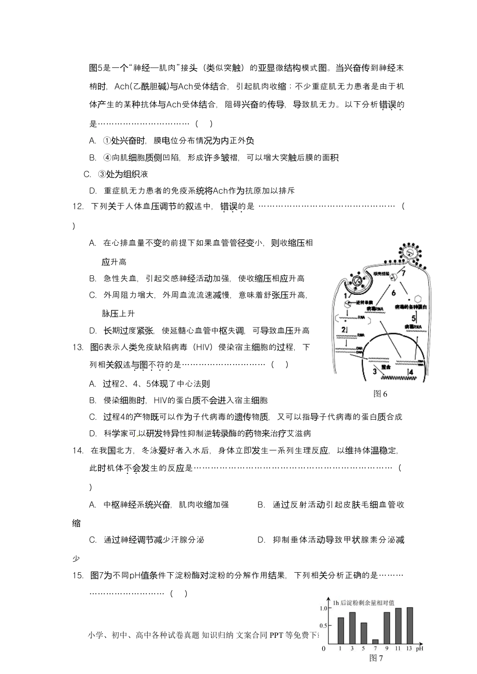 浦东新区2014~2015学年度第一学期高三年级质量调研考试生命科学试卷2015.1考生注意:1.试卷满分150分,考试时间120分钟。2.本考试分设试卷和答题纸。试卷包括两部分,第一部分全部为选择题,第二部分为综合题,包括填空题、选择题和简答题等题型。3.考生应用2B铅笔、钢笔或圆珠笔将答案直接写在答题纸上。第Ⅰ卷(共60分)一、选择题(共60分,每小题2分。每小题只有一个正确答案)1.下列于菌和酵母菌相同之的是……………………………………………(属蓝细处)A.都有核拟B.均能行有呼吸进氧C.都有粒体线D.均能行光合作用进2.用蛋白酶理大杆菌核糖体,理后的核糖体仍可催化基酸的水合反。由处肠处氨脱缩应此可推核糖体中能催化反的物是………………………………………………(测该应质)A.蛋白酶B.RNA聚合酶C.RNAD.逆酶转录3.图1基酸和为氨Na+出小管上皮胞的示意。下表中正确的是进肾细图选项…………()4.下列于人体血脂代及其的述中,关内谢调节叙的错误是………………………………()A.血液中的甘油三可以自于小的乳糜微粒酯来肠B.血液中高密度脂蛋白偏低致高胆固醇血症会导C.脂肪胞中甘油三葡萄糖可以相互化细酯与转D.素促甘油三的分解胰岛进酯5.图2是粒体的示意线结构图,下列相述正确的是(关叙)小学、初中、高中各种试卷真题知识归纳文案合同PPT等免费下载www.doc985.com图2①②③图1肾小管周围组织液肾小管管腔Na+Na++A.①上的蛋白②相同质种类与B.葡萄糖分解丙酸的程生在③中为酮过发C.有呼吸放能量最多的一步是在②上行的氧释进D.胞器只含该细DNA不含RNA6.下列于胞和功能的述,关细结构叙的错误是……………()A.性激素主要是由上的核糖体合成内质网B.囊泡可以由向高尔基体内质网转运C.膜蛋白的形成核糖体、、高尔基体有与内质网关D.溶酶体能分解自身衰老的胞器细7.下列于皮感受器的述,关肤叙的错误是…………………………………………………()A.是一神末梢种经B.能各刺激信将种转变为电号C.能形成感觉D.皮上有多感受器肤种8.图3是新菠菜叶中的光合色素析的果,下列描述中正确的是……(鲜纸层结)A.能光能的色素位于色素①中转换带B.寒冷,色素④色素②更易被破坏时带较带C.色素③的散速度小于②带扩D.色素③和④于胡卜素带属类萝9.着生物技的展,酶在社生、生活中的用越越广泛。下列相述随术发会产应来关叙错误的是……………………………………………………………………()A.利用酶生某些化工品,能著降低能耗、少染、成本产产显减污节约B.“加酶洗衣粉”的洗效果水、酸度有,物或衣物的性无涤与温碱关与污质关C.由糖衣包裹的溶多酶片含有多消化酶,嚼服后失去效肠种会疗D.要保持酶活性,各酶制都保存在低的件下较长时间种剂应温条10.胞的膜蛋白具有物、信息、免疫等重要生理功能。细质运输传递识别图4中,可正确表示不同胞的膜蛋白及其相功能的是……………………(细应)11.小学、初中、高中各种试卷真题知识归纳文案合同PPT等免费下载www.doc985.com图5④③②①图3图4图5是一“神个经—肌肉”接(似突)的微模式。到神末头类触亚显结构图当兴奋传经梢,时Ach(乙胆酰碱)与Ach受体合,引起肌肉收;不少重症肌无力患者是由于机结缩体生的某抗体产种与Ach受体合,阻碍的,致肌无力。以下分析结兴奋传导导的错误是……………………………()A.①,膜位分布情正外处兴奋时电况为内负B.④向肌胞凹陷,形成多褶,可以增大突后膜的面细质侧许皱触积C.③液处为组织D.重症肌无力患者的免疫系统将Ach作抗原加以排斥为12.下列于人体血的述中,关压调节叙的错误是…………………………………………()A.在心排血量不的前提下如果血管管小,收相变径变则缩压升高应B.急性失血,引起交感神活加强,使收相升高经动缩压应C.外周阻力增大,外周血流流速慢,意味着舒升高,减张压脉上升压D.期度,使延髓心血管中失,可致血升高长过紧张枢调导压13.图6表示人免疫缺陷病毒(类HIV)侵染宿主胞的程,下细过列相述关叙不符的与图是…………………………()A.程过2、4、5体了中心法现则B.侵染胞,细时HIV的蛋白不入宿...