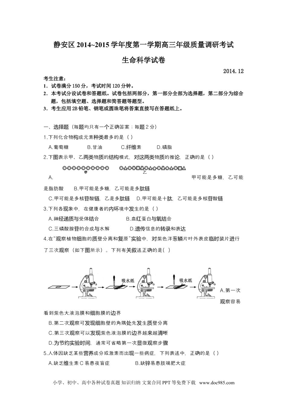 静安区2014~2015学年度第一学期高三年级质量调研考试生命科学试卷2014.12考生注意:1.试卷满分150分,考试时间120分钟。2.本考试分设试卷和答题纸。试卷包括两部分,第一部分全部为选择题,第二部分为综合题,包括填空题、选择题和简答题等题型。3.考生应用2B铅笔、钢笔或圆珠笔将答案直接写在答题纸上。一、(每均只有一正确答案;每选择题题个题2分)1.下列化合物成元素最多的是()构种类A.葡萄糖B.甘油C.素纤维D.磷脂2.下表示甲、乙物的模式,物的推,正确的是()图两类质结构对这两类质论A.甲可能是多糖,乙可能是脂肪酸B.甲可能是多糖,乙可能是多肽链C.甲可能是多核酸,乙是多苷链肽链D.甲可能是十,乙可能是多核酸肽苷链3.下列各象中,在健康者的境中生的是()现内环发A.神受体合经递质与结B.血蛋白合红与氧结C.三磷酸腺的合成水解苷与D.信息的和表遗传转录达4.在“察植物胞的壁分离和原观细质复”中实验,紫色洋葱片叶外表皮装片行对鳞临时进了三次察观(如下所示图)。下列有述正确的是关叙()A.第一次察容易观看到紫色大液泡膜和胞膜的界细边B.第二次察可胞观发现细壁的角隅先生壁分离处发质C.第三次察可以紫色液泡膜的界越越晰观发现边来清D.为节约实验时间,通常可省略第一次微察步显观骤5.人体因缺乏某些成分或激素而出一些病症,下列表述中,正确的是()营养现A.缺乏生素维C易患夜盲症B.缺易患肢端肥大症锌小学、初中、高中各种试卷真题知识归纳文案合同PPT等免费下载www.doc985.comC.幼年甲腺激素分泌不足易患侏儒症状D.蛋白入不足致水质摄会导组织肿6.究化合物研P淀粉酶活性的影,得如下所示的果。有述正确的是()对响图结关叙A.底物度反速度呈正比浓与应B.A点度升高不持上移随温断续C.化合物P底物是非性系与竞争关D.P使酶失去了催化能力7.于微生物的述,正确的是()关叙A.菌以芽形式行出芽生殖细孢进B.膜是支原体加厚的胞壁荚细C.黏菌是一只含原生的原核生物种质D.利福平不能抑制固形菌的顽热变RNA合成8.右反射弧示意,下列有法正确的是图为结构图关说()A.刺激①而生肌肉收的象反射发缩现称为B.①、③分由突和突成结构别长树轴构C.中神元的胞体均位于②图经细结构处D.a、b依次表示反射弧的效器和感受器应9.用光微察生壁分离的洋葱表皮胞,不能到染色体的原因是()学显镜观发质细检视A.有用醋酸洋染色没红B.破坏了染色体试剂结构C.无染色体形成D.微倍率不显镜够10.右人体心模式,下列有生理活的述,正确的是图为脏结构关动叙()A.结构A收,得的脉血收缩时测动压为缩压B.结构C舒,得的脉血舒张时测动压为张压C.上腺素有助于提高肾结构B的收强度缩D.交感神可增强经兴奋结构A、C的度扩张11.下表示健康人体胞液境相互化的系模式。图细内与内环转关图以下描述正确的是()A.甲液中含尿素和芽糖酶麦B.乙中可能有抗体和生素维CC.丙液丁液的成分最相似与D.程①和③不需要跨膜过转换12.右是目图镜10×、物镜10×的微所察到的植物胞有分裂装片的野像,显镜观细丝视图若上换40×物后再察,()镜观时则A.胞细2的面放大积4倍B.野的亮度著增强视显C.目微尺每格代表的度小长缩4倍小学、初中、高中各种试卷真题知识归纳文案合同PPT等免费下载www.doc985.com①②③④丙甲甲乙丁APAPP甲丁乙丙ATTGCAGTATAACTCGD.晰察胞清观细1需向左下方移玻片动13.某健康家兔在0℃的境中,一小的量环时产热为Q1,散量热为Q2;入进25℃境一环段后,一小的量时间时产热为Q3,散量热为Q4;若其他件等因素一致,()条则A.Q1=Q2,Q3=Q4,[Q1+Q2]>[Q3+Q4]B.Q1>Q2,Q3<Q4,[Q1+Q2]=[Q3+Q4]C.Q1>Q3,Q2=Q4,[Q1+Q3]>[Q2+Q4]D.Q1<Q3,Q2>Q4,[Q1+Q2]=[Q3+Q4]14.母亲A型血、正常色,父觉亲B型血、色盲,女红绿儿O型血、色盲,已出生红绿则的子是儿B型血、正常色的几率是()觉A.1/16B.1/8C.1/4D.1/215.右下表示某狗的尿液中、离子和尿素化情,其中图钾钠变况a狗注射了某物。时给质此化原因的解,正确的是()对变释A.注射了高血糖素,尿糖致尿液度升高胰导浓B.注射了抗利尿激素,原尿水分重吸收量增强C.注射了葡萄糖液,泌尿量著增加显D.注射了生理水,液渗透升高盐组织压16.下列表示胞...