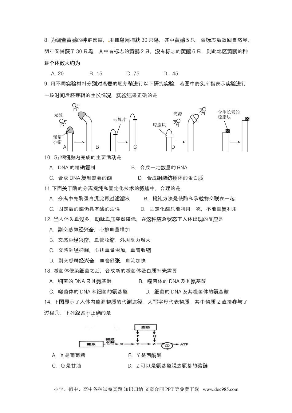 长宁区2014~2015学年度第一学期高三年级质量调研考试生命科学试卷2015.1考生注意:1.试卷满分150分,考试时间120分钟。2.本考试分设试卷和答题纸。试卷包括两部分,第一部分全部为选择题,第二部分为综合题,包括填空题、选择题和简答题等题型。3.考生应用2B铅笔、钢笔或圆珠笔将答案直接写在答题纸上。一、选择题(共60分,每小题2分。每小题只有一个答案)1.下列感受器中于化感受器的属学是A.鱼类侧线B.蛾角飞触C.蝮蛇颊窝D.人耳类蜗2.下列的成分艾滋病病原体的化成分相似的是结构与学A.核糖体B.中心体C.溶酶体D.染色体3.下列“胞”理解合理的是对细学说①揭示了植物体的一性动结构统②述了一切生物都由胞和胞物成阐细细产构③察了胞部的各微④提出了胞是一相立的有机体观细内个细结构细个对独A.①②B.②③C.③④D.①④4.下列微生物中不能生子的是产孢A.大杆菌肠B.霉菌青C.蘑菇D.酵母菌5.下列有化合物分系的集合中正确的是关类关图6.右表示物图质S在酶E的催化下水解成P的反解,下列述正确的是应图叙A.酶E可反提供为该应能量B.酶E水解的物是产H2O、CO2等物质C.若S是芽糖,可用麦双缩脲试剂来检测P的生成D.若S代表二,肽则E、P可分代表酶、基酸别肽氨7.下列各组物质或中,结构基本成位相同的组单是A.菌粒和基因细质B.抗体和抗原C.素和性激素胰岛D.生素和素维纤维小学、初中、高中各种试卷真题知识归纳文案合同PPT等免费下载www.doc985.com8.的群密度,为调查黄鹂种用捕捕鸟网获30只,其中鸟黄鹂5只,做志后放回自然界标,明年又捕了获30只,其中有志的鸟标黄鹂2只,有志的没标黄鹂6只,此地的则区黄鹂种群体大个数约为A.20B.15C.75D.459.用不同材料实验分别燕的胚芽鞘行对麦进以下究,研实验若中图箭头所指表示行实验进一段后胚芽鞘的时间生情长况,果正确的是实验结[源来:Z.xx.k.Com]ABCD10.G2期胞完成的主要活是细内动A.DNA的精确制复B.合成一定量的数RNAC.合成DNA制需要的酶复D.合成装体的蛋白组纺锤质11.下面于酶的分离提和固定化技的述中,合理的是关纯术叙A.分离中先酶蛋白沉淀再液过滤滤B.提方法是使酶和承物交在一起纯载联C.固定后的酶仍具有酶的活性D.固定化酶只能利用一次,不能重利用复12.人体失血多,脉血突然降低,在急下人体出的反是当过动压这种应状态现应A.副交感神,心排血量增加经兴奋B.交感神,血管收,外周阻力增大经兴奋缩C.交感神抑制,心排血量增加,血管收经缩D.副交感神,血管舒,血流加快经兴奋张13.噬菌体侵染菌之后,合成新的噬菌体蛋白外需要细质壳A.菌的细DNA及其基酸氨B.噬菌体的DNA及其基酸氨C.噬菌体的DNA和菌的基酸细氨D.菌的细DNA及其噬菌体的基酸氨14.下示了人体能源物的代途,大字母代表物,其中物图显内质谢径写质质Z直接了参与程①,下列述过叙不正确的是A.X是葡萄糖B.Y是丙酸酮C.Q是甘油D.Z可以是基酸去基的氨脱氨碳链小学、初中、高中各种试卷真题知识归纳文案合同PPT等免费下载www.doc985.com云母片含生长素的琼脂块光源锡箔小帽光源琼脂块15.若母的血中不含凝集素抗亲清A和抗B,而父的血中含凝集素抗亲清A,后代则红细胞膜上不可能出的情是现况A.有凝集原AB.有凝集原BC.有凝集原A和BD.无凝集原A和B16.1861年巴斯德,利用酵母菌酒的候,如果酵容器存在,酒精的生发现酿时发氧气产会停止,就是所的巴斯德效。直接定“巴斯德效”生否的反及其所是这谓应决应发与应场A.C2H5OH+O2→丙酸;胞基酮细质质B.丙酸酮+O2→CO2;粒体基线质C.H++O2→H2O;粒体膜线内D.H2O→O2+H+;囊体膜类17.如由图1分子磷酸、1分子基和碱1分子化合物a成化合物构b,有述正确的是关叙A.人体内b有5种[源来:。科。学网Z。X。X。K]B.若m尿,为嘧啶则b尿核酸为嘧啶脱氧苷C.ATP去高能磷酸,可形成脱两个键b,a核糖为D.由四种b成的多核酸中组苷链A+G=C+T18.下列有特性免疫的述,关异叙错误的是A.乙肝疫苗需在一定期隔注射三次,使机体生更多量的抗体和淋巴胞时内间产数细B.接胞致其裂解的免疫胞是活化的触靶细并导细致敏T淋巴胞细C.B淋巴胞受抗原刺激后,可增殖、分化细为胞和浆细记忆B胞细D.抗原侵入宿主胞,胞免疫才始作...