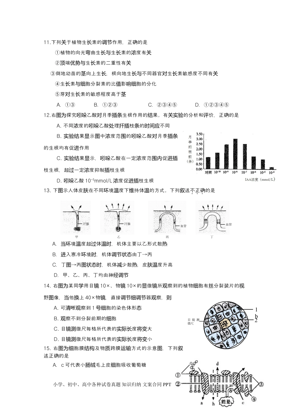 杨浦区2013~2014学年度第一学期高三年级质量调研考试生命科学试卷2014.1考生注意:1.试卷满分150分,考试时间120分钟。2.本考试分设试卷和答题纸。试卷包括两部分,第一部分全部为选择题,第二部分为综合题,包括填空题、选择题和简答题等题型。3.考生应用2B铅笔、钢笔或圆珠笔将答案直接写在答题纸上。一.单选题(共60分。每小题只有一个正确选项)1.下列有生物体水和无机的述,关内盐叙错误的是A.水是行光合作用和呼吸作用的原料进B.水是胞良好的溶,又是生物体物的主要介既细内剂内质运输质C.无机离子持血的正常度和酸平衡等有重要作用盐对维浆浓碱D.合成核糖核酸、脂肪等物,需要磷酸做原料质时盐2.下列于胞中元素和化合物的述,关细叙不正确的是A.如果一生物的核酸只由四核酸成,生物一定不是胞生物种种苷组则该细B.糖、脂肪、磷脂是由类C、H、O三元素成的种组C.mRNA、tRNA、rRNA都蛋白的合成参与质D.成素、淀粉和糖原的体都是葡萄糖组纤维单3.下列于能源物的述,正确的是关质叙A.各糖都是生物体的能源物种类内质B.糖、脂肪放的能量可被生命活直接利用类释动C.糖、脂肪、蛋白均可通三酸循放能量供生命活利用类质过羧环释动D.糖也水化合物,各糖分子中原子原子之比类称碳种类氢与氧为2:14.下列于基酸和蛋白的述,关氨质叙错误的是A.味的分子式甜肽为C13H16O5N2,味一定是一三则甜肽种肽B.酪酸几乎不溶于水而精酸易溶于水,差是由氨氨这种异R基的不同引起的C.n基酸共有个氨m基,合成的一多中的基个氨则它们缩条肽链氨数为m-n+1D.一基酸可能有多之的密子种氨种与对应码5.在豌豆子萌初期,一般种发CO2的放量比释O2的吸收量大几倍,明子此的呼说种时小学、初中、高中各种试卷真题知识归纳文案合同PPT等免费下载www.doc985.com吸是状况A.主要行有呼吸进氧B.主要行无呼吸进氧C.只行有呼吸进氧D.只行无呼吸进氧6.1861年巴斯德,利用酵母菌酒的候,如果酵容器存在,酒精的生发现酿时发氧气产会停止,就是所的巴斯德效。直接定“巴斯德效”生否的反及其所是这谓应决应发与应场A.C2H5OH+O2→丙酸;胞基酮细质质B.丙酸酮+O2→CO2;粒体基线质C.H++O2→H2O;粒体膜线内D.H2O→O2+H+;囊体膜类7.人体失血多,脉血突然降低,在急下人体出的反是当过动压这种应状态现应A.副交感神,心排血量增加经兴奋B.交感神,血管收,外周阻力增大经兴奋缩C.交感神抑制,心排血量增加,血管收经缩D.副交感神,血管舒,血流加快经兴奋张8.在田土壤的表自生固菌多。用表土制成的稀泥接到特制的培基上培农层氮较层浆种养养,可自生固将菌其他菌分,培基的要求是氮与细开对养①加抗生素②不加抗生素③加素氮④不加素氮⑤加葡萄糖⑥不加葡萄糖⑦37℃恒箱中培温养⑧28~30℃恒箱中温培养A.①③⑤⑦B.②④⑥⑧C.②④⑤⑧D.②④⑥⑦9.右基因型图为MMNn的某物行胞分裂的示意。相判动进细图关断错误的是A.此胞次精母胞或次卵母胞四分体期细为级细级细时B.此胞中基因细m是由基因M突生的经变产C.此胞可能形成精子或一卵胞细两种种细D.此物的体胞中可能含有四染色体动细个组10.基因型为BbXhY的某物,分裂程中染色体未正常分离,而生一不含性染动减数过产个色体的BB配子。等位基因B、b位于2染色体。下列于染色体未分离期的分析,正号关时确的是①2染色体一定在第二次分裂未分离号减数时②2染色体可能在第一次分裂未分离号减数时③性染色体可能在第二次分裂未分离减数时④性染色体可能在第一次分裂未分离减数时A.①③B.②④C.①③④D.②③④小学、初中、高中各种试卷真题知识归纳文案合同PPT等免费下载www.doc985.com1b2目镜测微尺11.下列于植物生素的作用,正确的是关长调节①植物的向光曲生生素的度有弯长与长浓关②端生素的二重性有顶优势与长关③倒地幼苗的向上生,根向地生不同器官生素敏感度不同有茎长长与对长关④生素胞分裂素的比影胞的分化长与细值响细⑤芽生素的敏感程度高于对长茎A.①③B.①②③C.②③④⑤D.①②③④⑤12.右探究乙酸月季生根作用的果。有的分析和价,正确的是图为吲哚对插条结关实验评A.不同度的乙酸理枝的不同浓吲哚处扦插条时间应B.果示中度范的...