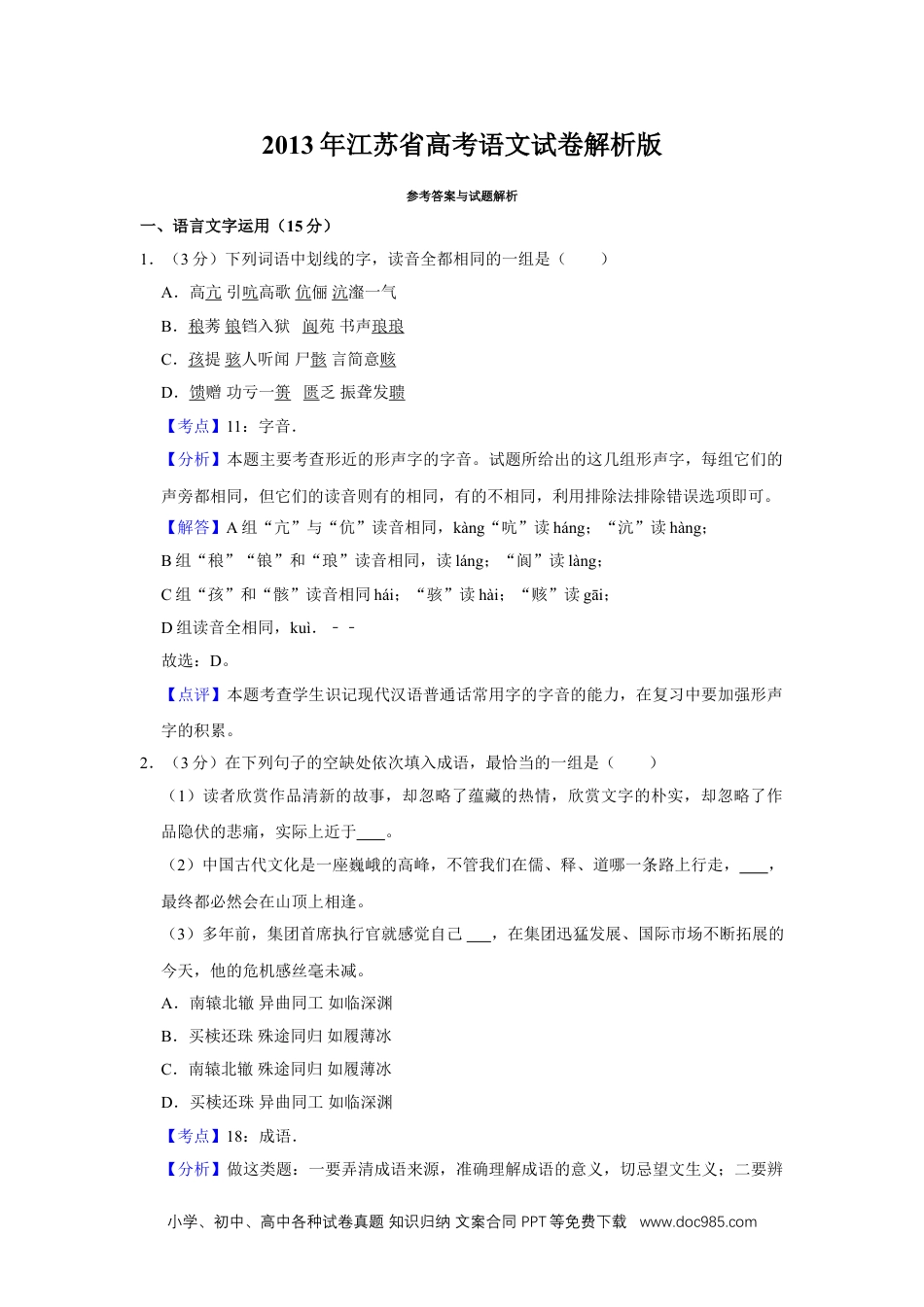 2013年江苏省高考语文试卷解析版参考答案与试题解析一、语言文字运用(15分)1.(3分)下列词语中划线的字,读音全都相同的一组是()A.高亢引吭高歌伉俪沆瀣一气B.稂莠锒铛入狱阆苑书声琅琅C.孩提骇人听闻尸骸言简意赅D.馈赠功亏一篑匮乏振聋发聩【考点】11:字音.菁优网版权所有【分析】本题主要考查形近的形声字的字音。试题所给出的这几组形声字,每组它们的声旁都相同,但它们的读音则有的相同,有的不相同,利用排除法排除错误选项即可。【解答】A组“亢”与“伉”读音相同,kàng“吭”读háng;“沆”读hàng;B组“稂”“锒”和“琅”读音相同,读láng;“阆”读làng;C组“孩”和“骸”读音相同hái;“骇”读hài;“赅”读gāi;D组读音全相同,kuì.﹣﹣故选:D。【点评】本题考查学生识记现代汉语普通话常用字的字音的能力,在复习中要加强形声字的积累。2.(3分)在下列句子的空缺处依次填入成语,最恰当的一组是()(1)读者欣赏作品清新的故事,却忽略了蕴藏的热情,欣赏文字的朴实,却忽略了作品隐伏的悲痛,实际上近于。(2)中国古代文化是一座巍峨的高峰,不管我们在儒、释、道哪一条路上行走,,最终都必然会在山顶上相逢。(3)多年前,集团首席执行官就感觉自己,在集团迅猛发展、国际市场不断拓展的今天,他的危机感丝毫未减。A.南辕北辙异曲同工如临深渊B.买椟还珠殊途同归如履薄冰C.南辕北辙殊途同归如履薄冰D.买椟还珠异曲同工如临深渊【考点】18:成语.菁优网版权所有【分析】做这类题:一要弄清成语来源,准确理解成语的意义,切忌望文生义;二要辨小学、初中、高中各种试卷真题知识归纳文案合同PPT等免费下载www.doc985.com清成语的感情色彩;三要注意成语运用对象的范围.【解答】(1)句,“欣赏…,却忽略了…”这一具体的语境,就应选择“买椟还珠”,其意思为买下木匣,退还了珍珠。比喻没有眼力,取舍不当。南辕北辙,想往南而车子却向北行。比喻行动和目的正好相反;(2)句“不管我们在…哪一条路上行走,最终都必然…相逢”,可知应选“殊途同归”,殊途同归,通过不同的途径,到达同一个目的地。比喻采取不同的方法而得到相同的结果。而“异曲同工”,不同的曲调演得同样好。比喻话的说法不一而用意相同,或一件事情的做法不同而都巧妙地达到目的;(3)如履薄冰,象走在薄冰上一样。比喻行事极为谨慎,存有戒心。如临深渊,如同处于深渊边缘一般。比喻存有戒心,行事极为谨慎。前者侧重谨慎,后者侧重戒心。故选:B。【点评】本题考查学生正确使用词语(包括熟语)能力.弄清楚成语使用不当的四个方面:对象搞错、望文生义、语境不合、褒贬失当,提高辨别能力.3.(4分)请以平实的语言表述下面材料中画线句子的含意,不超过15个字。有个青年人总是抱怨环境,一位长者对他说:“你想保护自己的脚,穿上一双鞋子比给全世界铺上地毯更容易做到。”答:改变自己比改变环境更容易。【考点】86:理解句子.菁优网版权所有【分析】本题要求用平实的语言表述句子的含义,一方要注意把握具体的语境,另一方面要注意划线句中哪些是形象的说法,分别指向什么,如何用平实的语言表达出来.【解答】划线句前有一个语境“有个青年人总是抱怨环境”,可见老者的话是对抱怨环境的青年人的劝勉;划线句老人是用“穿上一双鞋子”和“在全世界铺上红地毯”类比,说明与其抱怨环境不如改变自己.参考答案:改变自己比改变环境更容易.【点评】本体考查学生语言表达得体的能力,主要指能恰当地使用语言,符合具体语境和语体的要求.4.(5分)有研究者对200多位作家从发表处女作和代表作的年龄两个方面进行了统计。比较图表中两组数据,从作家渐至成熟的角度归纳出一个结论。作品人数20岁前21~2526~3031~3536~4041~45小学、初中、高中各种试卷真题知识归纳文案合同PPT等免费下载www.doc985.com年龄岁岁岁岁岁处女作72人95人36人7人代表作8人31人96人50人25人【考点】87:图文、表文转化.菁优网版权所有【分析】图表转换题一般按以下步骤答题:第一步,认真审题,明确要求.第二步,认读图表,捕捉信息.第三步,依据要求,规范作答....