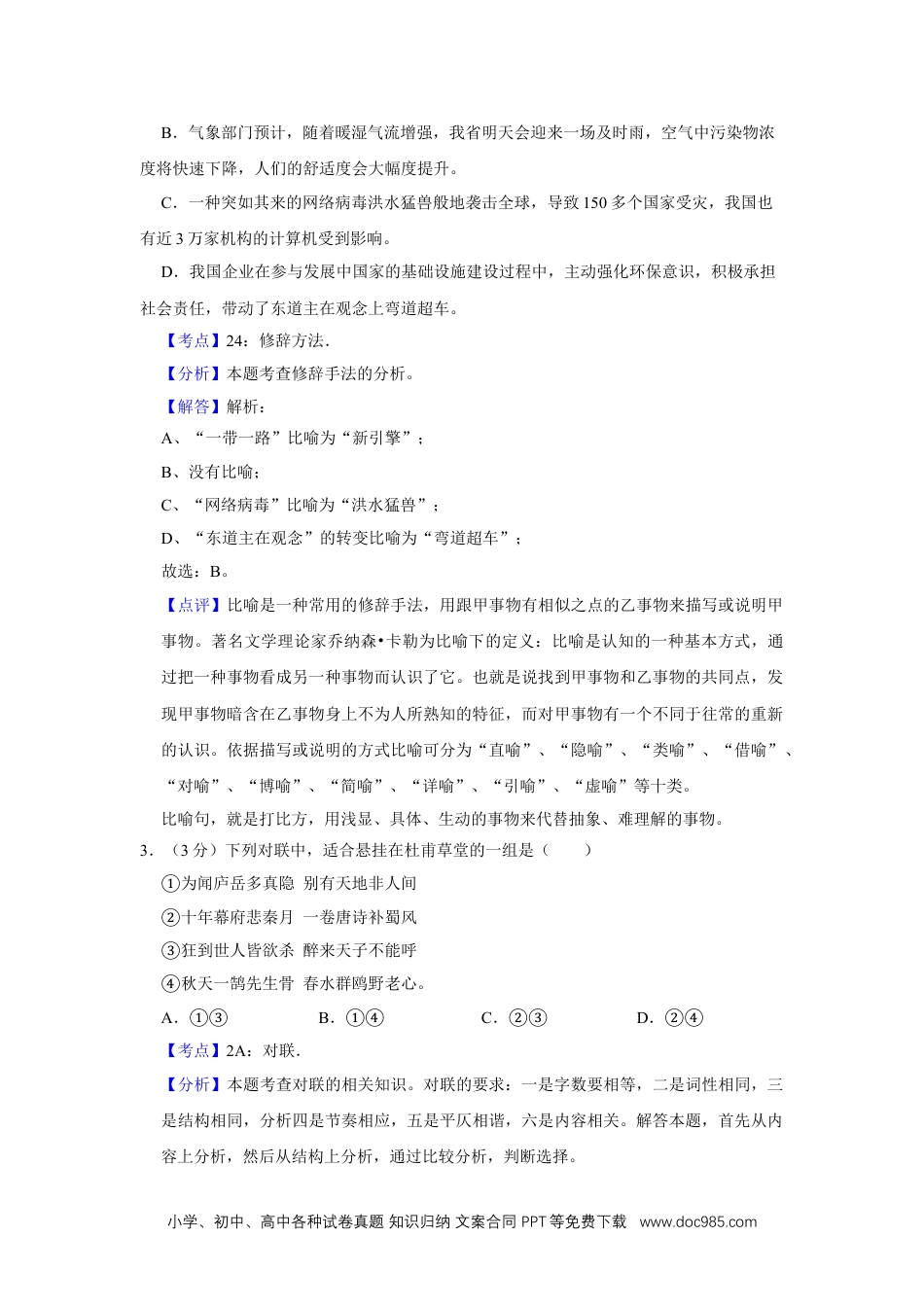 2017年江苏省高考语文试卷解析版参考答案与试题解析一、语言文字运用(15分)1.(3分)在下面一段话的空缺处依次填入词语,最恰当的一组是〔3分〕()刺绣画艺术,就是以绘画为稿本,以针黹、缣帛为绣材的艺术再创作。在其传承与发展过程中,无数绣娘以的工匠精神,创作出令人的作品。它们或如摄影写实,或如油画般立体,或姿态婀娜,或设色古雅,可谓争奇斗艳,。A.精益求精耳目一新美不胜收B.励精求治刮目相看美不胜收C.精益求精刮目相看数不胜数D.励精求治耳目一新数不胜数【考点】18:成语.菁优网版权所有【分析】解答此题的关键是掌握相似、相近词语在意思上的细微差别,正确辨别他们的感情色彩、修饰对象、使用范围等。解答时联系上下文,从词语与语境的语意关系、搭配关系等方面筛选,再运用排除法排除不符合句意的选项。【解答】精益求精:好了还求更好;励精求治:振奋精神,尽力设法治好国家。句中是指艺术创作,应该选用“精益求精”,排除B、D;耳目一新:听到的、看到的跟以前完全不同,使人感到新鲜;刮目相看:指别人已有进步,不能再用老眼光去看他。句中修饰“作品”,指“作品”新,选用“耳目一新”,排除C;美不胜收:美好的东西很多,一时看不过来;数不胜数:数都数不过来。形容数量极多,很难计算。根据句子语境,是说作品美,而不是多。选用“美不胜收”。故选:A。【点评】此题主要考查正确使用词语(成语)的能力。在平时的复习中应养成规范使用汉语言文字的习惯,不要被一些媒体的错误用法所误导,并注重积累。积累一些常见的近义词、易错词,注意区分近义词中不同语素的含义,做题时根据语境分析哪个更合适;更重要的是在阅读中培养语感,注意基本词语使用的语境。2.(3分)下列语句中,没有使用比喻手法的一项是〔3分〕()A.“一带一路”是我国为推动经济全球化而提出的一项互利共赢的倡议,它已成为推动全球经济转型升级、走出衰退困境的新引擎。小学、初中、高中各种试卷真题知识归纳文案合同PPT等免费下载www.doc985.comB.气象部门预计,随着暖湿气流增强,我省明天会迎来一场及时雨,空气中污染物浓度将快速下降,人们的舒适度会大幅度提升。C.一种突如其来的网络病毒洪水猛兽般地袭击全球,导致150多个国家受灾,我国也有近3万家机构的计算机受到影响。D.我国企业在参与发展中国家的基础设施建设过程中,主动强化环保意识,积极承担社会责任,带动了东道主在观念上弯道超车。【考点】24:修辞方法.菁优网版权所有【分析】本题考查修辞手法的分析。【解答】解析:A、“一带一路”比喻为“新引擎”;B、没有比喻;C、“网络病毒”比喻为“洪水猛兽”;D、“东道主在观念”的转变比喻为“弯道超车”;故选:B。【点评】比喻是一种常用的修辞手法,用跟甲事物有相似之点的乙事物来描写或说明甲事物。著名文学理论家乔纳森•卡勒为比喻下的定义:比喻是认知的一种基本方式,通过把一种事物看成另一种事物而认识了它。也就是说找到甲事物和乙事物的共同点,发现甲事物暗含在乙事物身上不为人所熟知的特征,而对甲事物有一个不同于往常的重新的认识。依据描写或说明的方式比喻可分为“直喻”、“隐喻”、“类喻”、“借喻”、“对喻”、“博喻”、“简喻”、“详喻”、“引喻”、“虚喻”等十类。比喻句,就是打比方,用浅显、具体、生动的事物来代替抽象、难理解的事物。3.(3分)下列对联中,适合悬挂在杜甫草堂的一组是()①为闻庐岳多真隐别有天地非人间②十年幕府悲秦月一卷唐诗补蜀风③狂到世人皆欲杀醉来天子不能呼④秋天一鹄先生骨春水群鸥野老心。A.①③B.①④C.②③D.②④【考点】2A:对联.菁优网版权所有【分析】本题考查对联的相关知识。对联的要求:一是字数要相等,二是词性相同,三是结构相同,分析四是节奏相应,五是平仄相谐,六是内容相关。解答本题,首先从内容上分析,然后从结构上分析,通过比较分析,判断选择。小学、初中、高中各种试卷真题知识归纳文案合同PPT等免费下载www.doc985.com【解答】①“为闻庐岳多真隐,别有天地非人间”这是苏轼对湖南桃花源景色的一种赞美,突出苏轼的旷达而深渊的人生情怀...