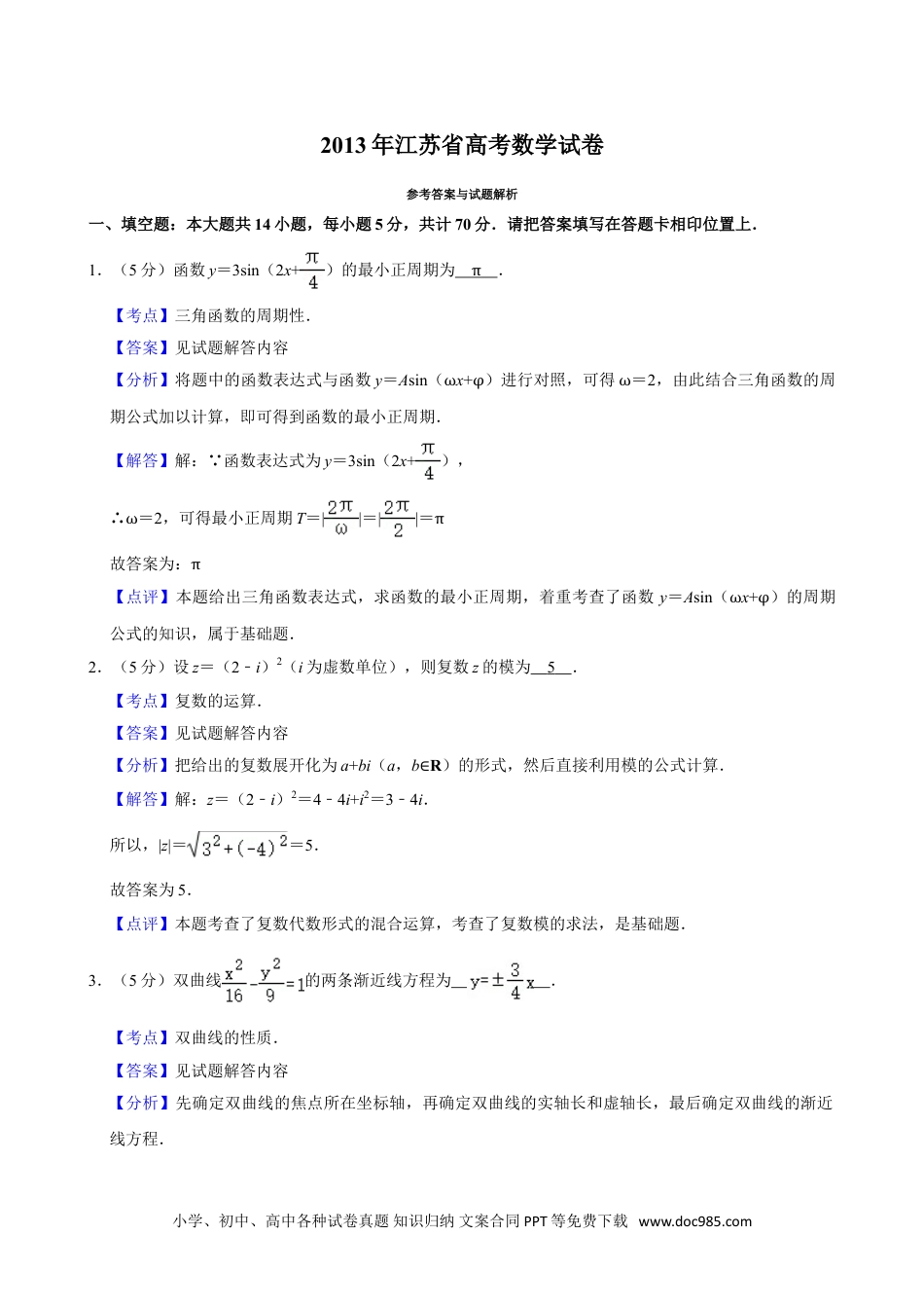 2013年江苏省高考数学试卷参考答案与试题解析一、填空题:本大题共14小题,每小题5分,共计70分.请把答案填写在答题卡相印位置上.1.(5分)函数y=3sin(2x+)的最小正周期为π.【考点】三角函数的周期性.菁优网版权所有【答案】见试题解答内容【分析】将题中的函数表达式与函数y=Asin(ωx+φ)进行对照,可得ω=2,由此结合三角函数的周期公式加以计算,即可得到函数的最小正周期.【解答】解: 函数表达式为y=3sin(2x+),∴ω=2,可得最小正周期T=||=||=π故答案为:π【点评】本题给出三角函数表达式,求函数的最小正周期,着重考查了函数y=Asin(ωx+φ)的周期公式的知识,属于基础题.2.(5分)设z=(2﹣i)2(i为虚数单位),则复数z的模为5.【考点】复数的运算.菁优网版权所有【答案】见试题解答内容【分析】把给出的复数展开化为a+bi(a,b∈R)的形式,然后直接利用模的公式计算.【解答】解:z=(2﹣i)2=4﹣4i+i2=3﹣4i.所以,|z|==5.故答案为5.【点评】本题考查了复数代数形式的混合运算,考查了复数模的求法,是基础题.3.(5分)双曲线的两条渐近线方程为.【考点】双曲线的性质.菁优网版权所有【答案】见试题解答内容【分析】先确定双曲线的焦点所在坐标轴,再确定双曲线的实轴长和虚轴长,最后确定双曲线的渐近线方程.小学、初中、高中各种试卷真题知识归纳文案合同PPT等免费下载www.doc985.com【解答】解: 双曲线的a=4,b=3,焦点在x轴上而双曲线的渐近线方程为y=±x∴双曲线的渐近线方程为故答案为:【点评】本题考查了双曲线的标准方程,双曲线的几何意义,特别是双曲线的渐近线方程,解题时要注意先定位,再定量的解题思想4.(5分)集合{﹣1,0,1}共有8个子集.【考点】子集与真子集.菁优网版权所有【答案】见试题解答内容【分析】集合P={1,2,3}的子集是指属于集合的部分或所有元素组成的集合,包括空集.【解答】解:因为集合{﹣1,0,1},所以集合{﹣1,0,1}的子集有:{﹣1},{0},{1},{﹣1,0},{﹣1,1},{0,1},{﹣1,0,1},∅,共8个.故答案为:8.【点评】本题考查集合的子集个数问题,对于集合M的子集问题一般来说,若M中有n个元素,则集合M的子集共有2n个.5.(5分)如图是一个算法的流程图,则输出的n的值为5.小学、初中、高中各种试卷真题知识归纳文案合同PPT等免费下载www.doc985.com【考点】程序框图.菁优网版权所有【答案】见试题解答内容【分析】由已知的程序框图可知,该程序的功能是利用循环计算a值,并输出满足a<16的最大n值,模拟程序的运行过程可得答案.【解答】解:当n=1,a=1时,满足进行循环的条件,执行循环后,a=5,n=3;满足进行循环的条件,执行循环后,a=17,n=5;满足进行循环的条件,退出循环故输出n值为5故答案为:5.【点评】本题考查的知识点是程序框图,由于循环的次数不多,故可采用模拟程序运行的方法进行.6.(5分)抽样统计甲、乙两位射击运动员的5次训练成绩(单位:环),结果如下:运动员第一次第二次第三次第四次第五次甲8791908993乙8990918892则成绩较为稳定(方差较小)的那位运动员成绩的方差为2.【考点】极差、方差与标准差.菁优网版权所有【答案】见试题解答内容【分析】直接由图表得出两组数据,求出它们的平均数,求出方差,则答案可求.【解答】解:由图表得到甲乙两位射击运动员的数据分别为:甲:87,91,90,89,93;乙:89,90,91,88,92;小学、初中、高中各种试卷真题知识归纳文案合同PPT等免费下载www.doc985.com,.方差=4.=2.所以乙运动员的成绩较稳定,方差为2.故答案为2.【点评】本题考查了方差与标准差,对于一组数据,在平均数相差不大的情况下,方差越小越稳定,考查最基本的知识点,是基础题.7.(5分)现在某类病毒记作XmYn,其中正整数m,n(m≤7,n≤9)可以任意选取,则m,n都取到奇数的概率为.【考点】古典概型及其概率计算公式.菁优网版权所有【答案】见试题解答内容【分析】求出m取小于等于7的正整数,n取小于等于9的正整数,m取到奇数,n取到奇数的方法种数,直接由古典概型的概率计算公式求解.【解...