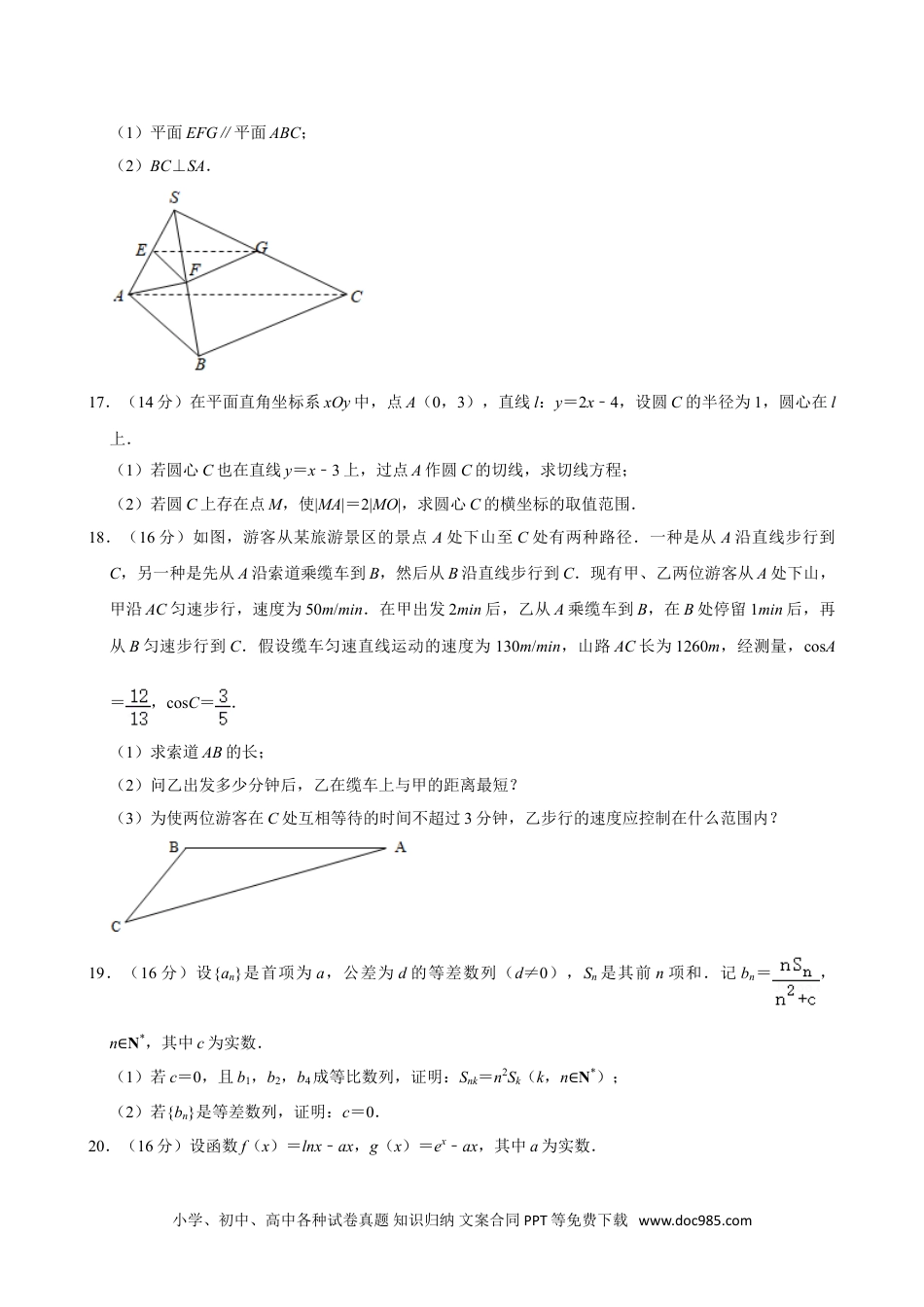 2013年江苏省高考数学试卷一、填空题:本大题共14小题,每小题5分,共计70分.请把答案填写在答题卡相印位置上.1.(5分)函数y=3sin(2x+)的最小正周期为.2.(5分)设z=(2﹣i)2(i为虚数单位),则复数z的模为.3.(5分)双曲线的两条渐近线方程为.4.(5分)集合{﹣1,0,1}共有个子集.5.(5分)如图是一个算法的流程图,则输出的n的值为.6.(5分)抽样统计甲、乙两位射击运动员的5次训练成绩(单位:环),结果如下:运动员第一次第二次第三次第四次第五次甲8791908993乙8990918892则成绩较为稳定(方差较小)的那位运动员成绩的方差为.7.(5分)现在某类病毒记作XmYn,其中正整数m,n(m≤7,n≤9)可以任意选取,则m,n都取到奇数的概率为.8.(5分)如图,在三棱柱A1B1C1﹣ABC中,D,E,F分别是AB,AC,AA1的中点,设三棱锥F﹣ADE的体积为V1,三棱柱A1B1C1﹣ABC的体积为V2,则V1:V2=.小学、初中、高中各种试卷真题知识归纳文案合同PPT等免费下载www.doc985.com9.(5分)抛物线y=x2在x=1处的切线与两坐标轴围成三角形区域为D(包含三角形内部和边界).若点P(x,y)是区域D内的任意一点,则x+2y的取值范围是.10.(5分)设D,E分别是△ABC的边AB,BC上的点,AD=AB,BE=BC,若=λ1+λ2(λ1,λ2为实数),则λ1+λ2的值为.11.(5分)已知f(x)是定义在R上的奇函数.当x>0时,f(x)=x2﹣4x,则不等式f(x)>x的解集用区间表示为.12.(5分)在平面直角坐标系xOy中,椭圆C的标准方程为(a>b>0),右焦点为F,右准线为l,短轴的一个端点为B,设原点到直线BF的距离为d1,F到l的距离为d2,若d2=,则椭圆C的离心率为.13.(5分)在平面直角坐标系xOy中,设定点A(a,a),P是函数y=(x>0)图象上一动点,若点P,A之间的最短距离为2,则满足条件的实数a的所有值为.14.(5分)在正项等比数列{an}中,,a6+a7=3,则满足a1+a2+…+an>a1a2…an的最大正整数n的值为.二、解答题:本大题共6小题,共计90分.请在答题卡指定区域内作答,解答时应写出文字说明、证明过程或演算步骤.15.(14分)已知=(cosα,sinα),=(cosβ,sinβ),0<β<α<π.(1)若|﹣|=,求证:⊥;(2)设=(0,1),若+=,求α,β的值.16.(14分)如图,在三棱锥S﹣ABC中,平面SAB⊥平面SBC,AB⊥BC,AS=AB,过A作AF⊥SB,垂足为F,点E,G分别是棱SA,SC的中点.求证:小学、初中、高中各种试卷真题知识归纳文案合同PPT等免费下载www.doc985.com(1)平面EFG∥平面ABC;(2)BC⊥SA.17.(14分)在平面直角坐标系xOy中,点A(0,3),直线l:y=2x﹣4,设圆C的半径为1,圆心在l上.(1)若圆心C也在直线y=x﹣3上,过点A作圆C的切线,求切线方程;(2)若圆C上存在点M,使|MA|=2|MO|,求圆心C的横坐标的取值范围.18.(16分)如图,游客从某旅游景区的景点A处下山至C处有两种路径.一种是从A沿直线步行到C,另一种是先从A沿索道乘缆车到B,然后从B沿直线步行到C.现有甲、乙两位游客从A处下山,甲沿AC匀速步行,速度为50m/min.在甲出发2min后,乙从A乘缆车到B,在B处停留1min后,再从B匀速步行到C.假设缆车匀速直线运动的速度为130m/min,山路AC长为1260m,经测量,cosA=,cosC=.(1)求索道AB的长;(2)问乙出发多少分钟后,乙在缆车上与甲的距离最短?(3)为使两位游客在C处互相等待的时间不超过3分钟,乙步行的速度应控制在什么范围内?19.(16分)设{an}是首项为a,公差为d的等差数列(d≠0),Sn是其前n项和.记bn=,n∈N*,其中c为实数.(1)若c=0,且b1,b2,b4成等比数列,证明:Snk=n2Sk(k,n∈N*);(2)若{bn}是等差数列,证明:c=0.20.(16分)设函数f(x)=lnx﹣ax,g(x)=ex﹣ax,其中a为实数.小学、初中、高中各种试卷真题知识归纳文案合同PPT等免费下载www.doc985.com(1)若f(x)在(1,+∞)上是单调减函数,且g(x)在(1,+∞)上有最小值,求a的取值范围;(2)若g(x)在(﹣1,+∞)上是单调增函数,试求f(x)的零点个数,并证明你的结论.[选做题]本题包括A、B、C、D四小题,请选定其中两题,...