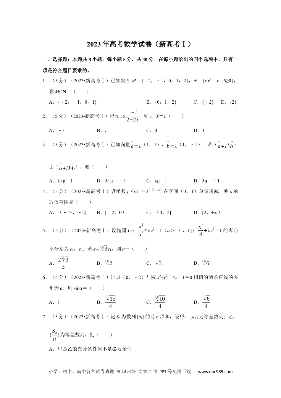 小学、初中、高中各种试卷真题知识归纳文案合同PPT等免费下载www.doc985.com2023年高考数学试卷(新高考Ⅰ)一、选择题:本题共8小题,每小题5分,共40分。在每小题给出的四个选项中,只有一项是符合题目要求的。1.(5分)(2023•新高考Ⅰ)已知集合M={2﹣,﹣1,0,1,2},N={x|x2﹣x6≥0}﹣,则M∩N=()A.{2﹣,﹣1,0,1}B.{0,1,2}C.{2}﹣D.{2}2.(5分)(2023•新高考Ⅰ)已知z¿1−i2+2i,则z−z=¿()A.﹣iB.iC.0D.13.(5分)(2023•新高考Ⅰ)已知向量a→=¿(1,1),b→=¿(1,﹣1).若(a→+¿λb→)⊥(a→+¿μb→),则()A.λ+μ=1B.λ+μ=﹣1C.λμ=1D.λμ=﹣14.(5分)(2023•新高考Ⅰ)设函数f(x)=2x(x﹣a)在区间(0,1)单调递减,则a的取值范围是()A.(﹣∞,﹣2]B.[2﹣,0)C.(0,2]D.[2,+∞)5.(5分)(2023•新高考Ⅰ)设椭圆C1:x2a2+¿y2=1(a>1),C2:x24+¿y2=1的离心率分别为e1,e2.若e2¿❑√3e1,则a=()A.2❑√33B.❑√2C.❑√3D.❑√66.(5分)(2023•新高考Ⅰ)过点(0,﹣2)与圆x2+y24﹣x1﹣=0相切的两条直线的夹角为α,则sinα=()A.1B.❑√154C.❑√104D.❑√647.(5分)(2023•新高考Ⅰ)记Sn为数列{an}的前n项和,设甲:{an}为等差数列;乙:{Snn}为等差数列,则()A.甲是乙的充分条件但不是必要条件小学、初中、高中各种试卷真题知识归纳文案合同PPT等免费下载www.doc985.comB.甲是乙的必要条件但不是充分条件C.甲是乙的充要条件D.甲既不是乙的充分条件也不是乙的必要条件8.(5分)(2023•新高考Ⅰ)已知sin(α﹣β)¿13,cosαsinβ¿16,则cos(2α+2β)=()A.79B.19C.−19D.−79二、选择题:本题共4小题,每小题5分,共20分。在每小题给出的选项中,有多项符合题目要求。全部选对的得5分,部分选对的得2分,有选错的得0分。(多选)9.(5分)(2023•新高考Ⅰ)有一组样本数据x1,x2,,⋯x6,其中x1是最小值x6是最大值,则()A.x2,x3,x4,x5的平均数等于x1,x2,,⋯x6的平均数B.x2,x3,x4,x5的中位数等于x1,x2,,⋯x6的中位数C.x2,x3,x4,x5的标准差不小于x1,x2,,⋯x6的标准差D.x2,x3,x4,x5的极差不大于x1,x2,,⋯x6的极差(多选)10.(5分)(2023•新高考Ⅰ)噪声污染问题越来越受到重视.用声压级来度量声音的强弱,定义声压级Lp=20×lgpp0,其中常数p0(p0>0)是听觉下限阈值,p是实际声压.下表为不同声源的声压级:声源与声源的距离/m声压级/dB燃油汽车1060~90混合动力汽车1050~60电动汽车1040已知在距离燃油汽车、混合动力汽车、电动汽车10m处测得实际声压分别为p1,p2,p3,则()A.p1≥p2B.p2>10p3C.p3=100p0D.p1≤100p2(多选)11.(5分)(2023•新高考Ⅰ)已知函数f(x)的定义域为R,f(xy)=y2f(x)小学、初中、高中各种试卷真题知识归纳文案合同PPT等免费下载www.doc985.com+x2f(y),则()A.f(0)=0B.f(1)=0C.f(x)是偶函数D.x=0为f(x)的极小值点(多选)12.(5分)(2023•新高考Ⅰ)下列物体中,能够被整体放入棱长为1(单位:m)的正方体容器(容器壁厚度忽略不计)内的有()A.直径为0.99m的球体B.所有棱长均为1.4m的四面体C.底面直径为0.01m,高为1.8m的圆柱体D.底面直径为1.2m,高为0.01m的圆柱体三、填空题:本题共4小题,每小题5分,共20分。13.(5分)(2023•新高考Ⅰ)某学校开设了4门体育类选修课和4门艺术类选修课,学生需从这8门课中选修2门或3门课,并且每类选修课至少选修1门,则不同的选课方案共有种(用数字作答).14.(5分)(2023•新高考Ⅰ)在正四棱台ABCD﹣A1B1C1D1中,AB=2,A1B1=1,AA1¿❑√2,则该棱台的体积为.15.(5分)(2023•新高考Ⅰ)已知函数f(x)=cosωx1﹣(ω>0)在区间[0,2π]有且仅有3个零点,则ω的取值范围是.16.(5分)(2023•新高考Ⅰ)已知双曲线C:x2a2−y2b2=¿1(a>0,b>0)的左、右焦点分别为F1,F2.点A在C上,点B在y轴上,F1A→⊥F1B→,F2A→=−23F2B→,则C的离心率为.四、解答题:本题...