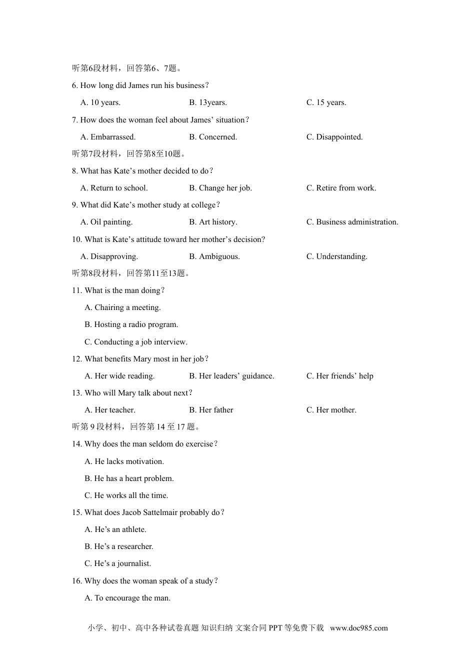 2019年普通高等学校招生全国统一考试(江苏卷)英语第一部分听力(共两节,满分20分)做题时,先将答案标在试卷上。录音内容结束后,你将有两分钟的时间将试卷上的答案转涂到答题卡上。第一节(共5小题;每小题1分,满分5分)听下面5段对话。每段对话后有一个小题,从题中所给的A、B、C三个选项中选出最佳选项。听完每段对话后,你都有10秒钟的时间来回答有关小题和阅读下一小题。每段对话仅读一遍。例:Howmuchistheshirt?A.£19.15.B.£9.18.C.£9.15.答案是C。1.Wheredoesthisconversationtakeplace?A.Inaclassroom.B.Inahospital.C.Inamuseum.2.WhatdoesJackwanttodo?A.Takefitnessclasses.B.Buyapairofgymshoes.C.Changehisworkschedule.3.Whatarethespeakerstalkingabout?A.Whattodrink.B.Wheretomeet.C.Whentoleave.4.Whatistherelationshipbetweenthespeakers?A.Colleges.B.Classmates.C.Strangers.5.WhyisEmilymentionedintheconversation?A.Shemightwantaticket.B.Sheislookingfortheman.C.Shehasanextraticket.第二节(共15小题;每小题1分,满分15分)听下面5段对话或独白。每段对话或独白后有几个小题,从题中所给的A、B、C三个选项中选出最佳选项。听每段对话或独白前,你将有时间阅读各个小题,每小题5秒钟;听完后,各小题将给出5秒钟的作答时间。每段对话或独白读两遍。小学、初中、高中各种试卷真题知识归纳文案合同PPT等免费下载www.doc985.com听第6段材料,回答第6、7题。6.HowlongdidJamesrunhisbusiness?A.10years.B.13years.C.15years.7.HowdoesthewomanfeelaboutJames’situation?A.Embarrassed.B.Concerned.C.Disappointed.听第7段材料,回答第8至10题。8.WhathasKate’smotherdecidedtodo?A.Returntoschool.B.Changeherjob.C.Retirefromwork.9.WhatdidKate’smotherstudyatcollege?A.Oilpainting.B.Arthistory.C.Businessadministration.10.WhatisKate’sattitudetowardhermother’sdecision?A.Disapproving.B.Ambiguous.C.Understanding.听第8段材料,回答第11至13题。11.Whatisthemandoing?A.Chairingameeting.B.Hostingaradioprogram.C.Conductingajobinterview.12.WhatbenefitsMarymostinherjob?A.Herwidereading.B.Herleaders’guidance.C.Herfriends’help13.WhowillMarytalkaboutnext?A.Herteacher.B.HerfatherC.Hermother.听第9段材料,回答第14至17题。14.Whydoesthemanseldomdoexercise?A.Helacksmotivation.B.Hehasaheartproblem.C.Heworksallthetime.15.WhatdoesJacobSattelmairprobablydo?A.He’sanathlete.B.He’saresearcher.C.He’sajournalist.16.Whydoesthewomanspeakofastudy?A.Toencouragetheman.小学、初中、高中各种试卷真题知识归纳文案合同PPT等免费下载www.doc985.comB.Torecommendanexercise.C.Tosupportherfindings.17.Howmuchtimewillthemanprobablyspendexercisingweekly?A.300minutes.B.150minute.C.75minutes.听第10段材料,回答第18至20题。18.Whatdidthescientistsdototheroad?A.Theyrepairedit.B.Theypaintedit.C.Theyblockedit19.Whyareyoungbirdsdrawntotheroadsurface?A.It’swarm.B.It’sbrown.C.It’ssmooth.20.Whatisthepurposeofthescientists’experiment?A.Tokeepthebirdsthereforawholeyear.B.Tohelpstudentsstudythebirdswell.C.Topreventthebirdsfrombeingkilled.第二部分英语知识运用(共两节,满分35分)第一节单项填空(共15小题;每小题1分,满分15分)请认真阅读下面各题,从题中所给的A、B、C、D四个选项中,选出最佳选项,并在答题卡上将该项涂黑。例:Itisgenerallyconsideredunwisetogiveachild_______heorshewants.A.howeverB.whateverC.whicheverD.whenever答案是B。21.Wehaveenteredintoanagedreamshavethebestchanceofcomingtrue.A.whichB.whatC.whenD.that22.Themusicianalongwithhisbandmemberstenperformancesinthelastthreemonths.A.givesB.hasgivenC.havegivenD.give23.Thedoctorshareshisphonenumberwiththepatientstheyneedmedicalassistance.小学、初中、...