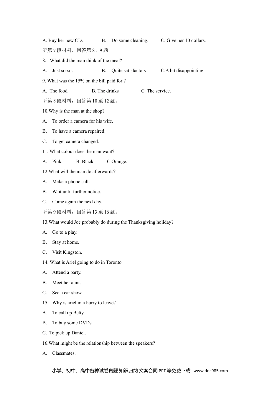 2012年普通高等学校招生全国统一考试(江苏卷)英语第Ⅰ卷(选择题共50分)第一部分听力(共两节,满分30分)回答听力部分时,请先将答案标在试卷上。听力部分结束前,你将有两分钟的时间将您的答案转涂到客观答题卡上。第一节(共5小题:每小题1.5分,满分7.5分)听下面5段对话,每段对话后有一个小题,从题中所给的A、B、C三个选项选出最佳选项,并标在试卷的相应位置,听完每段对话后,你都有10秒钟的时间来回答有关小题和阅读下小题,每段对话仅读一遍。例:Howmuchistheshirt?A.ξ19.15.B.ξ9.15.C.ξ9.18答案是B。1.Wheredoesthisconversationprobablytakeplace?A.Inabookstore.B.InaclassroomC.Inalibrary2.Atwhattimewillthefilmbegin?A.7:20B.7:15C.7:003.Whatarethetwospeakersmainlytalkingabout?A.TheirfriendJane.B.AweekendtripC.Aradioprogramme4.Whatwillthewomanprobablydo?A.CatchatrainB.SeethemanoffC.Goshopping5.Whydidthewomanapologize?A.ShemadealatedeliveryB.ShewenttothewrongplaceC.Shecouldn’ttakethecakeback第二节(共15小题:每小题1.5分,满分22.5分)听下面5段对话。每段对话有几个小题,从题中所给的A、B、C三个选项中选出的最佳选项,并标在试卷的相应位置。听每段对话前,你将有时间阅读各个小题,每小题5秒钟;听完后,各小题给出5秒钟的做答时间。每段对话读两遍。听第6段材料,回答第6、7题。6.WhoseCDisbroken?A.Kathy’sB.Mun’sC.Jack’s7.Whatdosetheboypromisetodoforthegirl?小学、初中、高中各种试卷真题知识归纳文案合同PPT等免费下载www.doc985.comA.BuyhernewCD.B.Dosomecleaning.C.Giveher10dollars.听第7段材料,回答第8、9题。8.Whatdidthemanthinkofthemeal?A.Justso-so.B.QuitesatisfactoryC.Abitdisappointing.9.Whatwasthe15%onthebillpaidfor?A.ThefoodB.ThedrinksC.Theservice.听第8段材料,回答第10至12题。10.Whyisthemanattheshop?A.Toorderacameraforhiswife.B.Tohaveacamerarepaired.C.Togetcamerachanged.11.Whatcolourdoesthemanwant?A.Pink.B.BlackCOrange.12.Whatwillthemandoafterwards?A.Makeaphonecall.B.Waituntilfurthernotice.C.Comeagainthenextday.听第9段材料,回答第13至16题。13.WhatwouldJoeprobablydoduringtheThanksgivingholiday?A.Gotoaplay.B.Stayathome.C.VisitKingston.14.WhatisArielgoingtodoinTorontoA.Attendaparty.B.Meetheraunt.C.Seeacarshow.15.Whyisarielinahurrytoleave?A.TocallupBetty.B.TobuysomeDVDs.C.TopickupDaniel.16.Whatmightbetherelationshipbetweenthespeakers?A.Classmates.小学、初中、高中各种试卷真题知识归纳文案合同PPT等免费下载www.doc985.comB.Fellowworkers.C.Guideandtourist.听第10段材料,回答每17至30题。17.WheredoesThomasManningwork?A.IntheGuinnessCompany.B.Ataradiostation.C.Inamuseum.18.Wheredidtheideaofabookofrecordscomefrom?A.Abird-shootingtrip.B.AvisittoEurope.C.Atelevisiontalkshow.19.WhendidSirHugh’sfirstbookofrecordsappear?A.In1875B.In1950C.In,195520.Whatarethetwospeakersgoingtotalkaboutnexr?A.Morerecordsofunusualfacts.B.Thefounderofthecompany.C.Theoldestpersonintheworld.第二部分英语知识运用(共两节,满分45分)第一节单项填空(共15小题;每小题1分,满分15分)从A、B、C、D四个选项中,选出可以填入空白处的最佳选项,并在答题卡上将该项涂黑。例:Itisgenerallyconsideredunwisetogiveachildheorshewants.A.howeverB.whateverC.whicheverD.whenever答案是B.21.—CanIhelpyouwithit?—Iappreciateyour________,butIcanmanageitmyself.A.adviceB.questionC.offerD.idea21.【考点】名词词义辨析【答案】C【解析】句意为:——我可以帮你吗?——我感激你的提议“offer”,但我自己能设法做的。offer意为“提议”,符合题意。A意为“建议,劝告”;B意为“问题”;D意为“想法,主意”。小学、初中、高中各种试卷真题知识归纳文案合同PPT等免费下载www.doc985.com【难度】一般22.Aftertheflooding,p...
