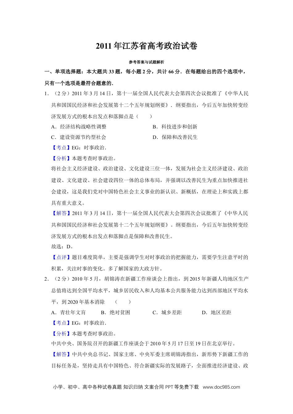 2011年江苏省高考政治试卷参考答案与试题解析一、单项选择题:本大题共33题,每小题2分,共计66分.在每题给出的四个选项中,只有一个选项是最符合题意的.1.(2分)2011年3月14日,第十一届全国人民代表大会第四次会议批准了《中华人民共和国国民经济和社会发展第十二个五年规划纲要》.纲要指出,今后五年加快转变经济发展方式的根本出发点和落脚点是()A.经济结构战略性调整B.科技进步和创新C.建设资源节约型社会D.保障和改善民生【考点】EG:时事政治.菁优网版权所有【分析】本题考查时事政治。将社会主义经济建设、政治建设、文化建设三位一体,发展为社会主义经济建设、政治建设、文化建设、社会建设四位一体的总体布局,并强调以改善民生为重点加快推进社会建设,这是我们党对中国特色社会主义事业的新认识、新概括,在理论上和实践上都具有重大意义。【解答】2011年3月14日,第十一届全国人民代表大会第四次会议批准了《中华人民共和国国民经济和社会发展第十二个五年规划纲要》。纲要指出,今后五年加快转变经济发展方式的根本出发点和落脚点是保障和改善民生。故选:D。【点评】题目难度简单,主要是强调学生对时事政治的把握能力,需要学生注意平时的积累,关注时事的变化。多了解国家的大政方针。2.(2分)2010年5月,胡锦涛在新疆工作座谈会上指出,到2015年新疆人均地区生产总值将达到全国平均水平,城乡居民收入和人均基本公共服务能力达到西部地区平均水平,到2020年基本消除()A.青壮年文肓B.绝对贫困C.城乡差距D.地区差距【考点】EG:时事政治.菁优网版权所有【分析】本题考查时事政治。中共中央、国务院召开的新疆工作座谈会于2010年5月17日至19日在北京举行。【解答】中共中央总书记、国家主席、中央军委主席胡锦涛指出,新形势下新疆工作的目标任务是,坚持走具有中国特色、符合新疆实际的发展路子,全面推进经济建设、政小学、初中、高中各种试卷真题知识归纳文案合同PPT等免费下载www.doc985.com治建设、文化建设、社会建设以及生态文明建设和党的建设,到2015年新疆人均地区生产总值达到全国平均水平,城乡居民收入和人均基本公共服务能力达到西部地区平均水平,基础设施条件明显改善,自我发展能力明显提高,民族团结明显加强,社会稳定明显巩固;到2020年促进新疆区域协调发展、人民富裕、生态良好、民族团结、社会稳定、边疆巩固、文明进步,确保实现全面建设小康社会的奋斗目标。2020年基本消除绝对贫困现象。故选:B。【点评】本题为时政题目,考查对社会相关知识的识记。要求考生必须关注重大时事,主动地关注生活,积极地关注社会热点问题,培养主人翁意识。3.(2分)2010年6月18日,我国第三个国家级新区、内陆唯一国家级新区“两江新区“挂牌成立。该新区位于()A.重庆B.武汉C.成都D.南昌【考点】EG:时事政治.菁优网版权所有【分析】本题考查:时事政治。国家级新区,是由国务院批准设立,承担国家重大发展和改革开放战略任务的综合功能区。新区的成立乃至于开发建设上升为国家战略,总体发展目标、发展定位等由国务院统一进行规划和审批,相关特殊优惠政策和权限由国务院直接批复,在辖区内实行更加开放和优惠的特殊政策,鼓励新区进行各项制度改革与创新的探索工作。国家级新区是中国于90年代初期设立的一种新开发开放与改革的大城市区。1992年中国改革开放后,国家级新区成为新一轮开发开放和改革的新区。【解答】2010年6月18日,继上海浦东新区、天津滨海新区之后,我国第三个国家级新区、内陆唯一国家级新区重庆“两江新区”挂牌成立,将重点探索内陆开放新模式,培育西部地区科学发展新的增长极。故选:A。【点评】本题为时政题目,考查对社会相关知识的识记。要求考生必须关注重大时事,主动地关注生活,积极地关注社会热点问题,培养主人翁意识。4.(2分)2010年11月16日,我国申报并被联合国教科文组织列入人类非物质文化遗产代表作名录的是《京剧》和()A.《中国书法》B.《中华武术》C.《中医针灸》D.《中国剪纸》【考点】EG:时事政治.菁优网版权所有【分析】本题考查时事政治。小学、初中、高中各种试...