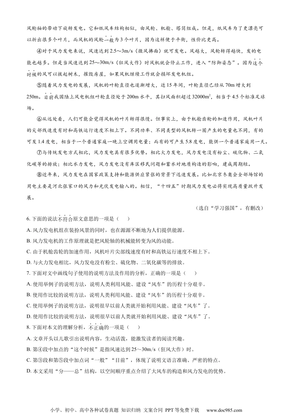 小学、初中、高中各种试卷真题知识归纳文案合同PPT等免费下载www.doc985.com机密★启用前2024年天津市初中学业水平考试试卷语文本试卷分为第Ⅰ卷(选择题)、第Ⅱ卷(非选择题)两部分。第Ⅰ卷为第1页至第4页,第Ⅱ卷为第5页至第8页。试卷满分120分。考试时间120分钟。答卷前,请务必将自己的姓名、考生号、考点校、考场号、座位号填写在“答题卡”上,并在规定位置粘贴考试用条形码。答题时,务必将答案涂写在“答题卡”上,答案答在试卷上无效。考试结束后,将本试卷和“答题卡”一并交回。祝你考试顺利!第Ⅰ卷注意事项:1.每题选出答案后,用2B铅笔把“答题卡”上对应题目的答案标号的信息点涂黑。如需改动,用橡皮擦干净后,再选涂其他答案标号的信息点。2.本卷共11题,共29分。一、(本大题共11小题,共29分。1~4小题,每题2分;5~11小题,每题3分)(一)积累与运用1.下面各组词语中加点字的注音,完全正确的一项是()A.鉴赏(jiàn)丰饶(yáo)鞠躬尽瘁(cuì)B.娴熟(xián)飘逸(yì)气冲斗牛(dòu)C.斟酌(zhuó)停滞(zhì)戛然而止(gá)D.坍塌(tān)伫立(zhù)栩栩如生(xǔ)2.依次填入下面一段文字横线处的词语,最恰当的一项是()近年来,借助虚拟的数字空间开展年俗活动越发受到人们的欢迎。数字空间的年俗活动虽以虚拟形式呈现,但其_________的共通情感和文化认同却是真实而深沉的,而且它在表现形式和表达方式上更灵活,更贴近当代审美,因而备受_________。这种当代与传统的双向奔赴,_________着传统文化在传承中创新的道理。A.装载吹捧印证B.承载青睐印证C.装载青睐印记D.承载吹捧印记3.下面一段文字中有语病的一项是()①极端气候是全人类共同面临的严峻挑战。②未来很长一段时间,全球极端气候仍将频繁出现。③我小学、初中、高中各种试卷真题知识归纳文案合同PPT等免费下载www.doc985.com国气候类型复杂,气候风险交织,应对极端气候的能力有待增强。④因此,我们要重视对气候变化的研究,推进相关治理体系建设和治理水平。A.第①句B.第②句C.第③句D.第④句4.依次填入下面一段文字方框内的标点符号,最恰当的一项是()诸葛亮□诫子书□云:“非淡泊无以明志,非宁静无以致远□“淡泊”是一种看淡财富和名利的态度,一种不为外界诱惑的品质□“宁静”则是一种精神状态,一种修身养性之道。面对外界的诱惑,唯有固守本心,以淡泊为桨,以宁静为帆,才能不为名利所绊,行稳致远。A.“””。;B.“”。”,C.《》。”;D.《》”。,(二)诗词鉴赏5.下面对《望岳》一诗的赏析,不恰当的一项是()望岳杜甫岱宗夫如何?齐鲁青未了。造化钟神秀,阴阳割昏晓。荡胸生曾云,决眦入归鸟。会当凌绝顶,一览众山小。A.开篇两句以问答形式,写泰山横跨齐鲁,青色的峰峦连绵不断,表现了泰山雄伟阔大的气势。B.第四句写泰山割开了“昏”“晓”两个天地,“割”字写出了泰山参天矗立的雄姿。C.五、六句描写静景,勾勒出一幅层云生起、飞鸟归林的画面,此景触发了诗人的归隐之情。D.最后两句写诗人决心登上泰山绝顶俯视群山,表现出诗人的远大志向和广阔胸怀。(三)实用类文本阅读阅读《大风车原来是这样发电》一文,完成下面小题。大风车原来是这样发电胡帆陈海伦①“大风车吱呀吱哟哟地转……”细心的朋友可能会发现,近些年来,山川田野间、荒漠戈壁滩、蔚蓝海面上一座座风力发电机组拔地而起。它们在装扮风景的同时,也在源源不断地为人们提供能源。②人类在很早以前就开始利用风能、建设“风车”了。公元前2世纪的波兰,人们就建有碾米的风车磨坊;元明时期,中国建有风力水车,用来灌溉农田。现代风车的雏形,则来源于1890年丹麦提出的风力发电计划,给风磨安装了发电机。工业革命期间,蒸汽机的出现,让风力发电机的发展遇冷。直到20世纪下半叶,化石能源告急,生态环境恶化,风力发电再次引起了人们的重视。③风力发电机的工作原理就是利用风力带动风轮旋转,把风的动能转变为风轮轴的机械能,发电机在小学、初中、高中各种试卷真题知识归纳文案合同PPT等免费下载www.doc985.com风轮轴的带动下旋转发电。它和纸风车结构相似,由风轮、机...
