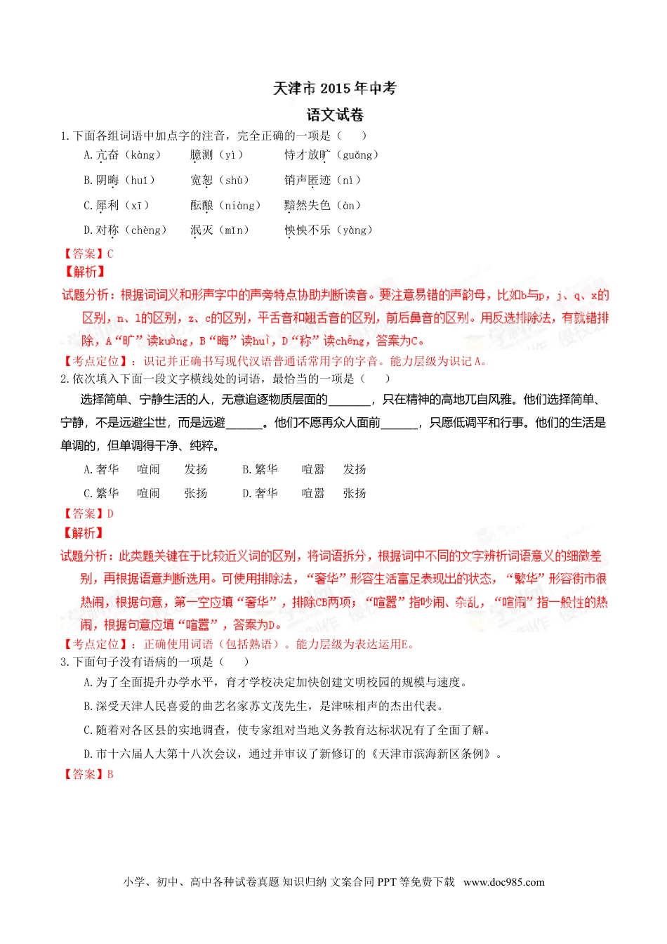 1.下面各组词语中加点字的注音,完全正确的一项是()A.亢奋(kàng)臆测(yì)恃才放旷(guǎng)B.阴晦(huǐ)宽恕(shù)销声匿迹(nì)C.犀利(xī)酝酿(niàng)黯然失色(àn)D.对称(chèng)泯灭(mǐn)怏怏不乐(yàng)【答案】C【考点定位】:识记并正确书写现代汉语普通话常用字的字音。能力层级为识记A。2.依次填入下面一段文字横线处的词语,最恰当的一项是()选择简单、宁静生活的人,无意追逐物质层面的________,只在精神的高地兀自风雅。他们选择简单、宁静,不是远避尘世,而是远避_______。他们不愿再众人面前_______,只愿低调平和行事。他们的生活是单调的,但单调得干净、纯粹。A.奢华喧闹发扬B.繁华喧嚣发扬C.繁华喧闹张扬D.奢华喧嚣张扬【答案】D【考点定位】:正确使用词语(包括熟语)。能力层级为表达运用E。3.下面句子没有语病的一项是()A.为了全面提升办学水平,育才学校决定加快创建文明校园的规模与速度。B.深受天津人民喜爱的曲艺名家苏文茂先生,是津味相声的杰出代表。C.随着对各区县的实地调查,使专家组对当地义务教育达标状况有了全面了解。D.市十六届人大第十八次会议,通过并审议了新修订的《天津市滨海新区条例》。【答案】B小学、初中、高中各种试卷真题知识归纳文案合同PPT等免费下载www.doc985.com【考点定位】:辨析或修改病句。能力层级为表达运用E。4.下面句子中的标点符号,使用不正确的一项是()A.哪怕找不到大海,也要迈出寻觅的脚步;哪怕脚印被掩埋,也请珍惜走过的路。B.我市今年举办的旅游节,融文化性、趣味性、艺术性为一体,异彩纷呈。C.明天参观天津自然博物馆,你是打算自己去呢,还是和大家一起去?D.英国诗人雪莱在他著名的《西风颂》里写道:“冬天已经到了,春天还会远吗”?【答案】D【考点定位】:正确使用标点符号。能力层级为表达运用E。5.依次填入下面一段文字横线处的句子,最恰当的一项是()毕业前夕,在某班举行的班会上,班长张林真诚地对大家说:“感谢同学们几年来对我的包容和支持。”接着表达了依依不舍之情。同学们也纷纷发言。因病请长假的刘楠激动地对班长说:“____________”家境困难的李霞动情地说:“____________”“学霸”王磊诙谐地说:“____________”随后,同学们互赠留言,把班会推向高潮。头儿,到了高中,咱俩还可以继续PK呦!谢谢你帮我补课,这么多天来你辛苦了!班长,你组织的‘真情援助’活动真是雪中送炭,这份爱心我会记在心里。A.B.C.D.【答案】C【考点定位】:语言表达简明、连贯、得体、准确、鲜明、生动。能力层级为表达运用E。6.下面对诗句的赏析,不恰当的一项是()A.会当凌绝顶,一览众山小。(杜甫《望岳》)这两句诗不仅是诗人要攀登泰山极顶的誓言,也是他要攀登人生顶峰的誓言。B.结庐在人境,而无车马喧。(陶渊明《饮酒》其五)小学、初中、高中各种试卷真题知识归纳文案合同PPT等免费下载www.doc985.com这两句诗写诗人处“人境”却“无车马喧”的寂寞生活,表达了作者对远离官场的不甘心。C.浊酒一杯家万里,燕然未勒归无计。(范仲淹《渔家傲•秋思》)这两句诗揭示了作者与征人思念家乡,却因未建功立业而无法回去的矛盾心理。D.不信,请看那朵流星,是他们提着灯笼在走。(郭沫若《天上的街市》)诗人对牛郎织女的神话传说做了大胆改造,表达了对美好生活的向往与追求。【答案】B【考点定位】:理解文中重要词语的含义。能力层级为理解B。阅读《苏州园林》的节选文字,回答7-8题。游览苏州园林必然会注意到花墙和廊子。有墙壁隔着,有廊子界着,层次多了,景致就见得深了。可是墙壁上有砖砌的各式镂空图案,廊子大多是两边无所依傍的,实际是隔而不隔,界而未界,因而更增加了景致的深度。有几个园林还在适当的位置装上一面大镜子,层次就更多了,几乎可以说把整个园林翻了一番。游览者必然也不会忽略另外一点,就是苏州园林在每一个角落都注意图画美。阶砌旁边栽几丛书带草。墙上蔓延着爬山虎或者蔷薇木香。如果开窗正对着白色墙壁,太单调了,给补上几竿竹子或几颗芭蕉。诸如此类,无非要游览者即使就极小范围的局部看,也能看到美的享受...