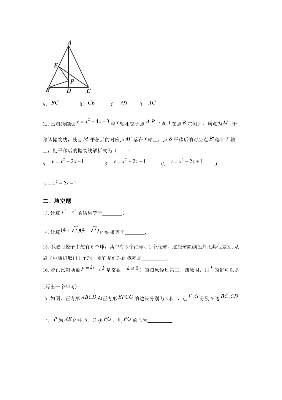 2017年天津市初中毕业生学业考试试卷数学一、选择题:1.计算5)3(的结果等于()A.2B.2C.8D.82.060cos的值等于()A3B.1C.22D.213.在一些美术字中,有的汉子是轴对称图形.下面4个汉字中,可以看作是轴对称图形的是()4.据《天津日报》报道,天津市社会保障制度更加成熟完善,截止2017年4月末,累计发放社会保障卡12630000张.将12630000用科学记数法表示为()A.8101263.0B.710263.1C.61063.12D.5103.1265.右图是一个由4个相同的正方体组成的立体图形,它的主视图是()6.估计38的值在()A.4和5之间B.5和6之间C.6和7之间D.7和8之间7.计算111aaa的结果为()A.1B.aC.1aD.11a8.方程组1532yxxy的解是()A.32yxB.34yxC.84yxD.63yx9.如图,将ABC绕点B顺时针旋转060得DBE,点C的对应点E恰好落在AB延长线上,连接AD.下列结论一定正确的是()A.EABDB.CCBEC.BCAD//D.BCAD10.若点),1(1yA,),1(2yB,),3(3yC在反比例函数xy3的图象上,则321,,yyy的大小关系是()A.321yyyB.132yyyC.123yyyD.312yyy11.如图,在ABC中,ACAB,CEAD,是ABC的两条中线,P是AD上一个动点,则下列线段的长度等于EPBP最小值的是()A.BCB.CEC.ADD.AC12.已知抛物线342xxy与x轴相交于点BA,(点A在点B左侧),顶点为M.平移该抛物线,使点M平移后的对应点'M落在x轴上,点B平移后的对应点'B落在y轴上,则平移后的抛物线解析式为()A.122xxyB.122xxyC.122xxyD.122xxy二、填空题13.计算47xx的结果等于.14.计算)74)(74(的结果等于.15.不透明袋子中装有6个球,其中有5个红球、1个绿球,这些球除颜色外无其他差别.从袋子中随机取出1个球,则它是红球的概率是.16.若正比例函数kxy(k是常数,0k)的图象经过第二、四象限,则k的值可以是(写出一个即可).17.如图,正方形ABCD和正方形EFCG的边长分别为3和1,点GF,分别在边CDBC,上,P为AE的中点,连接PG,则PG的长为.18.如图,在每个小正方形的边长为1的网格中,点CBA,,均在格点上.(1)AB的长等于;(2)在ABC的内部有一点P,满足2:1:::PCAPBCPABSSS,请在如图所示的网格中,用无刻度的直尺,画出点P,并简要说明点P的位置是如何找到的(不要求证明).三、解答题19.解不等式组34521xxx请结合题意填空,完成本题的解答.(1)解不等式①,得;(2)解不等式②,得;(3)把不等式①和②的解集在数轴上表示出来:①②(4)原不等式组的解集为.20.某跳水队为了解运动员的年龄情况,作了一次年龄调查,根据跳水运动员的年龄(单位:岁),绘制出如下的统计图①和图②.请根据相关信息,解答下列问题:(1)本次接受调查的跳水运动员人数为,图①中m的值为;(2)求统计的这组跳水运动员年龄数据的平均数、众数和中位数.21.已知AB是⊙O的直径,AT是⊙O的切线,050ABT,BT交⊙O于点C,E是AB上一点,延长CE交⊙O于点D.(1)如图①,求T和CDB的大小;(2)如图②,当BCBE时,求CDO的大小.22.如图,一艘海轮位于灯塔P的北偏东064方向,距离灯塔120海里的A处,它沿正南方向航行一段时间后,到达位于灯塔P的南偏东045方向上的B处,求BP和BA的长(结果取整数).参考数据:05.264tan,44.064cos,90.064sin000,2取414.1.23.用4A纸复印文件,在甲复印店不管一次复印多少页,每页收费0.1元.在乙复印店复印同样的文件,一次复印页数不超过20时,每页收费0.12元;一次复印页数超过20时,超过部分每页收费0.09元.设在同一家复印店一次复印文件的页数为x(x为非负整数).(1)根据题意,填写下表:一次复印页数(页)5102030…甲复印店收费(元)5.02…乙复印店收费(元)6.04.2…(2)设在甲复印店复印收费1y元,在乙复印店复印收费2y元,分别写出21yy,关于x的函数关系式;(3)当70x时,顾客在哪家复印店复印花费少?请说明理由.24.将一个直角三角形纸片ABO放置在平面直角坐标系中,点)0,3(A,点)1,0(B,点)0,0(O.P是边AB上的一点(点P不与...