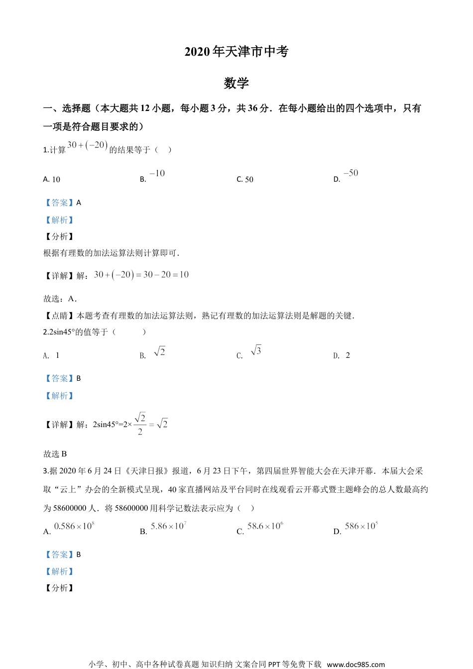2020年天津市中考数学一、选择题(本大题共12小题,每小题3分,共36分.在每小题给出的四个选项中,只有一项是符合题目要求的)1.计算的结果等于()A.10B.C.50D.【答案】A【解析】【分析】根据有理数的加法运算法则计算即可.【详解】解:故选:A.【点睛】本题考查有理数的加法运算法则,熟记有理数的加法运算法则是解题的关键.2.2sin45°的值等于()A.1B.C.D.2【答案】B【解析】【详解】解:2sin45°=2×故选B3.据2020年6月24日《天津日报》报道,6月23日下午,第四届世界智能大会在天津开幕.本届大会采取“云上”办会的全新模式呈现,40家直播网站及平台同时在线观看云开幕式暨主题峰会的总人数最高约为58600000人.将58600000用科学记数法表示应为()A.B.C.D.【答案】B【解析】【分析】小学、初中、高中各种试卷真题知识归纳文案合同PPT等免费下载www.doc985.com把小数点向左移动7位,然后根据科学记数法的书写格式写出即可.【详解】解:,故选:B.【点睛】本题考查了科学记数法的表示方法,科学记数法的表示形式为的形式,其中,为整数.确定的值时,要看把原数变成时,小数点移动了多少位,的绝对值与小数点移动的位数相同.当原数绝对值时,是正数;当原数的绝对值时,是负数.4.在一些美术字中,有的汉字是轴对称图形.下面4个汉字中,可以看作是轴对称图形的是()A.B.C.D.【答案】C【解析】【分析】根据轴对称图形的概念求解.【详解】解:A、不是轴对称图形;B、不是轴对称图形;C、是轴对称图形;D、不是轴对称图形;故选:C.【点睛】本题考查了轴对称图形的知识,轴对称图形的关键是寻找对称轴,图形两部分沿对称轴折叠后可重合.5.右图是一个由5个相同的正方体组成的立体图形,它的主视图是()小学、初中、高中各种试卷真题知识归纳文案合同PPT等免费下载www.doc985.comA.B.C.D.【答案】D【解析】【分析】从正面看所得到的图形是主视图,画出从正面看所得到的图形即可.【详解】解:从正面看第一层有两个小正方形,第二层在右边有一个小正方形,第三层在右边有一个小正方形,即:故选:D.【点睛】本题主要考查了三视图,关键是把握好三视图所看的方向.6.估计的值在()A.3和4之间B.4和5之间C.5和6之间D.6和7之间【答案】B【解析】【分析】因为,所以在4到5之间,由此可得出答案.【详解】解: ,∴.故选:B【点睛】本题主要考查了无理数的估算,解题关键是确定无理数的整数部分即可解决问题.7.方程组的解是()小学、初中、高中各种试卷真题知识归纳文案合同PPT等免费下载www.doc985.comA.B.C.D.【答案】A【解析】【分析】利用加减消元法解出的值即可.【详解】解:①+②得:,解得:,把代入②中得:,解得:,∴方程组的解为:;故选:A.【点睛】本题考查了二元一次方程组的解法——加减消元法和代入消元法,根据具体的方程组选取合适的方法是解决本类题目的关键.8.如图,四边形是正方形,O,D两点的坐标分别是,,点C在第一象限,则点C的坐标是()A.B.C.D.【答案】D【解析】【分析】利用O,D两点的坐标,求出OD的长度,利用正方形的性质求出OB,BC的长度,进而得出C点的坐标即可.小学、初中、高中各种试卷真题知识归纳文案合同PPT等免费下载www.doc985.com【详解】解: O,D两点的坐标分别是,,∴OD=6, 四边形是正方形,∴OB⊥BC,OB=BC=6∴C点的坐标为:,故选:D.【点睛】本题主要考查了点的坐标和正方形的性质,正确求出OB,BC的长度是解决本题的关键.9.计算的结果是()A.B.C.1D.【答案】A【解析】【分析】本题可先通分,继而进行因式约分求解本题.【详解】,因为,故.故选:A.【点睛】本题考查分式的加减运算,主要运算技巧包括通分,约分,同时常用平方差、完全平方公式作为解题工具.10.若点都在反比例函数的图象上,则的大小关系是()A.B.C.D.【答案】C【解析】【分析】小学、初中、高中各种试卷真题知识归纳文案合同PPT等免费下载www.doc985.com因为A,B,C三点均在反比例函数上,故可将点代入函数,求解,然后直接比较大小即可.【详解】将A,B,C三点分别代入,可求得,比较其大小可得:.故选:C.【点睛】本题考查反比...