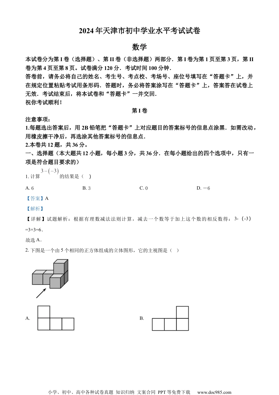 小学、初中、高中各种试卷真题知识归纳文案合同PPT等免费下载www.doc985.com2024年天津市初中学业水平考试试卷数学本试卷分为第I卷(选择题)、第II卷(非选择题)两部分.第I卷为第1页至第3页,第II卷为第4页至第8页。试卷满分120分.考试时间100分钟.答卷前,请务必将自己的姓名、考生号、考点校、考场号、座位号填写在“答题卡”上,并在规定位置粘贴考试用条形码.答题时,务必将答案涂写在“答题卡”上,答案答在试卷上无效.考试结束后,将本试卷和“答题卡”一并交回.祝你考试顺利!第I卷注意事项:1.每题选出答案后,用2B铅笔把“答题卡”上对应题目的答案标号的信息点涂黑.如需改动,用橡皮擦干净后,再选涂其他答案标号的信息点.2.本卷共12题,共36分。一、选择题(本大题共12小题,每小题3分,共36分.在每小题给出的四个选项中,只有一项是符合题目要求的)1.计算的结果是()A.6B.3C.0D.-6【答案】A【解析】【详解】试题解析:根据有理数减法法则计算,减去一个数等于加上这个数的相反数得:3-(-3)=3+3=6.故选A.2.下图是一个由5个相同的正方体组成的立体图形,它的主视图是()A.B.小学、初中、高中各种试卷真题知识归纳文案合同PPT等免费下载www.doc985.comC.D.【答案】B【解析】【分析】本题主要考查了简单组合体的三视图,根据主视图是指从正前方向看到的图形求解即可.【详解】解:由此从正面看,下面第一层是三个正方形,第二层是一个正方形(且在最右边),故选:B.3.估算的值在()A.1和2之间B.2和3之间C.3和4之间D.4和5之间【答案】C【解析】【分析】本题考查无理数的估算,根据题意得,即可求解.【详解】解: ∴,∴的值在3和4之间,故选:C.4.在一些美术字中,有的汉字是轴对称图形.下面4个汉字中,可以看作是轴对称图形的是()A.B.C.D.【答案】C【解析】【分析】本题考查轴对称图形,掌握轴对称图形的定义:如果一个图形沿某一条直线对折,对折后的两部分是完全重合的,那么就称这样的图形为轴对称图形是解题的关键.【详解】解:A.不是轴对称图形;B.不是轴对称图形;C.是轴对称图形;小学、初中、高中各种试卷真题知识归纳文案合同PPT等免费下载www.doc985.comD.不是轴对称图形;故选C.5.据2024年4月18日《天津日报》报道,天津市组织开展了第43届“爱鸟周”大型主题宣传活动.据统计,今春过境我市候鸟总数已超过800000只.将数据800000用科学记数法表示应为()A.B.C.D.【答案】C【解析】【分析】此题考查科学记数法的表示方法.科学记数法的表示形式为的形式,其中,为整数.确定的值时,要看把原数变成时,小数点移动了多少位,的绝对值与小数点移动的位数相同.【详解】解:将数据800000用科学记数法表示应为.故选:C.6.的值等于()A.B.C.D.【答案】A【解析】【分析】本题考查特殊角的三角函数值,熟记特殊的三角函数值是解题的关键;根据代入即可求解【详解】,故选:A7.计算的结果等于()A.B.C.D.小学、初中、高中各种试卷真题知识归纳文案合同PPT等免费下载www.doc985.com【答案】A【解析】【分析】本题考查分式加减运算,熟练运用分式加减法则是解题的关键;运用同分母的分式加减法则进行计算,对分子提取公因式,然后约分即可.【详解】解:原式故选:A8.若点都在反比例函数的图象上,则的大小关系是()A.B.C.D.【答案】B【解析】【分析】本题主要考查了比较反比例函数值的大小,根据反比例函数性质即可判断.【详解】解:,反比例函数的图象分布在第一、三象限,在每一象限随的增大而减小,点,都在反比例函数的图象上,,. ,在反比例函数的图象上,∴,∴.故选:B.9.《孙子算经》是我国古代著名的数学典籍,其中有一道题:“今有木,不知长短.引绳度之,余绳四尺五寸;屈绳度之,不足一尺.木长几何?”意思是:用一根绳子去量一根长木,绳子还剩余4.5尺;将绳小学、初中、高中各种试卷真题知识归纳文案合同PPT等免费下载www.doc985.com子对折再量长木,长木还剩余1尺.问木长多少尺?设木长尺,绳子长尺,则可以列出的方程组为()A.B.C.D.【答案】A【解析】【分析】本题考查的是二元一次方程组的应用.用一根绳子...