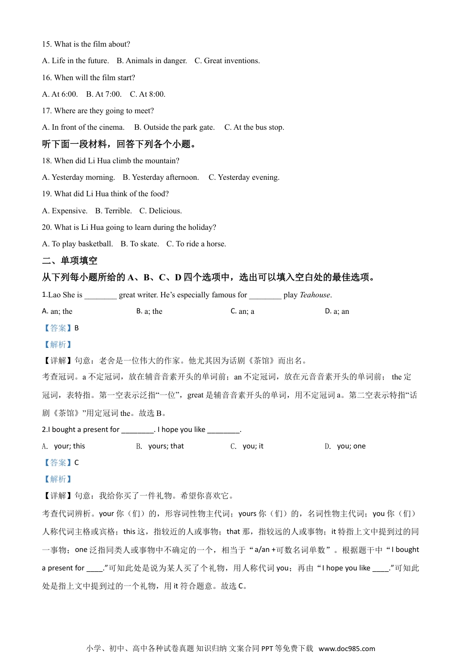2020年天津市中考英语本试卷分为第Ⅰ卷(选择题)、第Ⅱ卷(非选择题)两部分。第Ⅰ卷为第1页至第8页,第Ⅱ卷为第9页至第12页。试卷满分120分。考试时间100分钟。答卷前,请你务必将自己的姓名、考生号、考点校、考场号、座位号填写在“答题卡”上,并在规定位置粘贴考试用条形码。答题时,务必将答案涂写在“答题卡”上,答案答在试卷上无效。考试结束后,将本试卷和“答题卡”一并交回。祝你考试顺利!第Ⅰ卷注意事项:1.每题选出答案后,用2B铅笔把“答题卡”上对应题目的答案标号的信息点涂黑。如需改动,用橡皮擦干净后,再选涂其他答案标号的信息点。2.本卷共五大题。一、听力理解A)在下列每小题内,你将听到一个或两个句子并看到供选择的A、B、C三幅图画。找出与你所听句子内容相匹配的图画。1.A.B.C.2.A.B.C.3.A.B.C.小学、初中、高中各种试卷真题知识归纳文案合同PPT等免费下载www.doc985.com4.A.B.C.B)下面你将听到十组对话,每组对话都有一个问题。根据对话内容,从每组所给的A、B、C三个选项中找出能回答所提问题的最佳选项。5.WhatisBetty’smotherdoing?A.Cleaningthehouse.B.Readinganewspaper.C.WatchingTV.6.Howlonghasthemanlivedhere?A.5years.B.10years.C.15years.7.Whereistheschoolplayground?A.Ontheleftofthelibrary.B.Ontherightofthelibrary.C.Behindthelibrary.8.WhatisLiLei'sfirstlessononWednesday?A.Chinese.B.English.C.PE.9.Howmanysistersdoestheboyhave?A.One.B.Two.C.Three.10.WhydoesBrucelikeswimming?A.It’ssafe.B.It’srelaxing.C.It’sinteresting.11.Whosedictionaryisit?A.It’sDaming’s.B.It’sLily’s.C.It’sBob’s.12.WhatisHelengoingtodothisweekend?A.Drawpictures.B.Takephotos.C.Havearest.13.Howwillthewomangettotheairport?A.Bybus.B.Bytaxi.C.Byunderground.14.Howmuchwillthewomanpayfortheapples?A.20yuan.B.30yuan.C.40yuan.C)听下面长对话或独白。每段长对话或独白后都有几个问题,从题中所给的A、B、C三个选项中选出最佳选项。听下面一段材料,回答下列各个小题。小学、初中、高中各种试卷真题知识归纳文案合同PPT等免费下载www.doc985.com15.Whatisthefilmabout?A.Lifeinthefuture.B.Animalsindanger.C.Greatinventions.16.Whenwillthefilmstart?A.At6:00.B.At7:00.C.At8:00.17.Wherearetheygoingtomeet?A.Infrontofthecinema.B.Outsidetheparkgate.C.Atthebusstop.听下面一段材料,回答下列各个小题。18.WhendidLiHuaclimbthemountain?A.Yesterdaymorning.B.Yesterdayafternoon.C.Yesterdayevening.19.WhatdidLiHuathinkofthefood?A.Expensive.B.Terrible.C.Delicious.20.WhatisLiHuagoingtolearnduringtheholiday?A.Toplaybasketball.B.Toskate.C.Torideahorse.二、单项填空从下列每小题所给的A、B、C、D四个选项中,选出可以填入空白处的最佳选项。1.LaoSheis________greatwriter.He’sespeciallyfamousfor________playTeahouse.A.an;theB.a;theC.an;aD.a;an【答案】B【解析】【详解】句意:老舍是一位伟大的作家。他尤其因为话剧《茶馆》而出名。考查冠词。a不定冠词,放在辅音音素开头的单词前;an不定冠词,放在元音音素开头的单词前;the定冠词,表特指。第一空表示泛指“一位”,great是辅音音素开头的单词,用不定冠词a。第二空表示特指“话剧《茶馆》”用定冠词the。故选B。2.Iboughtapresentfor________.Ihopeyoulike________.A.your;thisB.yours;thatC.you;itD.you;one【答案】C【解析】【详解】句意:我给你买了一件礼物。希望你喜欢它。考查代词辨析。your你(们)的,形容词性物主代词;yours你(们)的,名词性物主代词;you你(们)人称代词主格或宾格;this这,指较近的人或事物;that那,指较远的人或事物;it特指上文中提到过的同一事物;one泛指同类人或事物中不确定的一个,相当于“a/an+可数名词单数”。根据题干中“Iboughtapresentfor____.”可知此处是说为某人买了个礼物,用人称代词you;再由“Ihopeyoulike____.”可知此处是指上文中提到过的一个礼物,用it符合题意。故选C。小学...