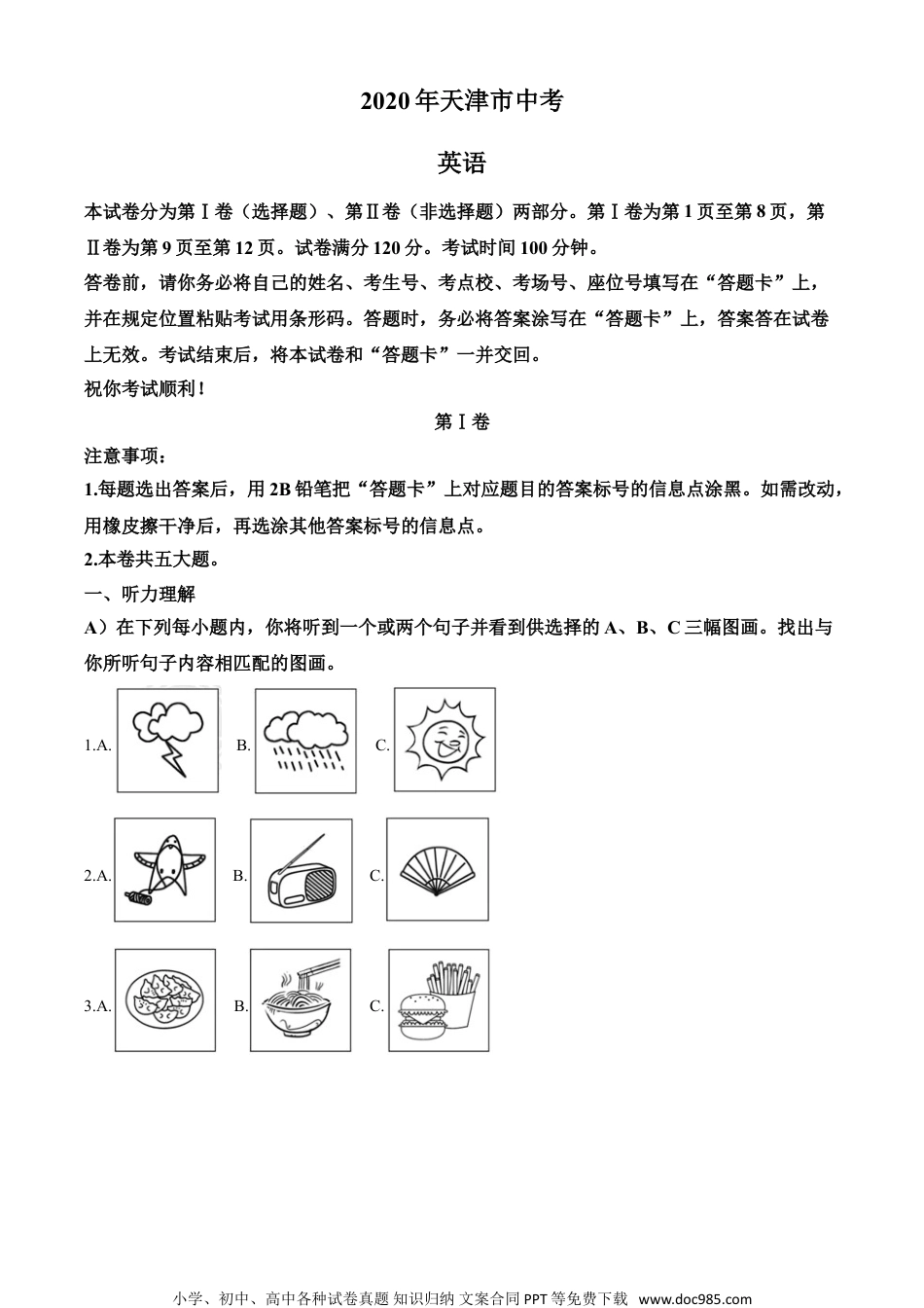 2020年天津市中考英语本试卷分为第Ⅰ卷(选择题)、第Ⅱ卷(非选择题)两部分。第Ⅰ卷为第1页至第8页,第Ⅱ卷为第9页至第12页。试卷满分120分。考试时间100分钟。答卷前,请你务必将自己的姓名、考生号、考点校、考场号、座位号填写在“答题卡”上,并在规定位置粘贴考试用条形码。答题时,务必将答案涂写在“答题卡”上,答案答在试卷上无效。考试结束后,将本试卷和“答题卡”一并交回。祝你考试顺利!第Ⅰ卷注意事项:1.每题选出答案后,用2B铅笔把“答题卡”上对应题目的答案标号的信息点涂黑。如需改动,用橡皮擦干净后,再选涂其他答案标号的信息点。2.本卷共五大题。一、听力理解A)在下列每小题内,你将听到一个或两个句子并看到供选择的A、B、C三幅图画。找出与你所听句子内容相匹配的图画。1.A.B.C.2.A.B.C.3.A.B.C.小学、初中、高中各种试卷真题知识归纳文案合同PPT等免费下载www.doc985.com4.A.B.C.B)下面你将听到十组对话,每组对话都有一个问题。根据对话内容,从每组所给的A、B、C三个选项中找出能回答所提问题的最佳选项。5.WhatisBetty’smotherdoing?A.Cleaningthehouse.B.Readinganewspaper.C.WatchingTV.6.Howlonghasthemanlivedhere?A.5years.B.10years.C.15years.7.Whereistheschoolplayground?A.Ontheleftofthelibrary.B.Ontherightofthelibrary.C.Behindthelibrary.8.WhatisLiLei'sfirstlessononWednesday?A.Chinese.B.English.C.PE.9.Howmanysistersdoestheboyhave?A.One.B.Two.C.Three.10.WhydoesBrucelikeswimming?A.It’ssafe.B.It’srelaxing.C.It’sinteresting.11.Whosedictionaryisit?A.It’sDaming’s.B.It’sLily’s.C.It’sBob’s.12.WhatisHelengoingtodothisweekend?A.Drawpictures.B.Takephotos.C.Havearest.13.Howwillthewomangettotheairport?A.Bybus.B.Bytaxi.C.Byunderground.14.Howmuchwillthewomanpayfortheapples?A.20yuan.B.30yuan.C.40yuan.C)听下面长对话或独白。每段长对话或独白后都有几个问题,从题中所给的A、B、C三个选项中选出最佳选项。听下面一段材料,回答下列各个小题。小学、初中、高中各种试卷真题知识归纳文案合同PPT等免费下载www.doc985.com15.Whatisthefilmabout?A.Lifeinthefuture.B.Animalsindanger.C.Greatinventions.16.Whenwillthefilmstart?A.At6:00.B.At7:00.C.At8:00.17.Wherearetheygoingtomeet?A.Infrontofthecinema.B.Outsidetheparkgate.C.Atthebusstop.听下面一段材料,回答下列各个小题。18.WhendidLiHuaclimbthemountain?A.Yesterdaymorning.B.Yesterdayafternoon.C.Yesterdayevening.19.WhatdidLiHuathinkofthefood?A.Expensive.B.Terrible.C.Delicious.20.WhatisLiHuagoingtolearnduringtheholiday?A.Toplaybasketball.B.Toskate.C.Torideahorse.二、单项填空从下列每小题所给的A、B、C、D四个选项中,选出可以填入空白处的最佳选项。1.LaoSheis________greatwriter.He’sespeciallyfamousfor________playTeahouse.A.an;theB.a;theC.an;aD.a;an2.Iboughtapresentfor________.Ihopeyoulike________.A.your;thisB.yours;thatC.you;itD.you;one3.Thisstreetismuch________thanthatone.A.wideB.widerC.widestD.thewidest4.Itisgoingtorain.Takeanumbrella________you.A.withB.atC.inD.from5.LangPingisasymbolofcourageandsuccess,andwe________her.A.comefromB.standforC.takeprideinD.getreadyfor6.—InChina,weuseredpaperforhongbaobecauseredmeansgoodluck.—That’sinteresting!IwanttoknowalltheChinese________.A.traditionsB.sentencesC.noticesD.problems7.BecausepeoplecanfindinformationontheInternet,knowledgespreads________.A.quicklyB.loudlyC.hardlyD.nearly8.I________belate,sodon’twaitformetostartthemeeting.A.mustn’tB.needn’tC.needD.may9.Iwasbusythismorninganddidn’thavetimeto________myemail.小学、初中、高中各种试卷真题知识归纳文案合同PPT等免费下载www.doc985.comA.wasteB.punishC.believeD.check10.You’dbettertidyupyourroom________yourfathercomesb...